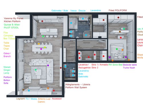 Nb: Chiedo di avere se possibile lo schema delle luci, la scelta delle pareti, dei pavimenti e dei materiali delle finiture, e la palette colori