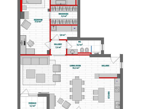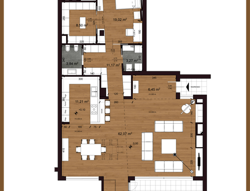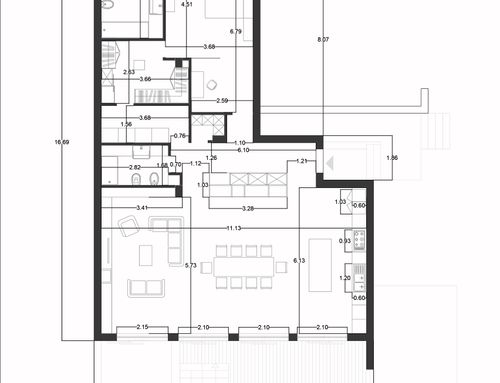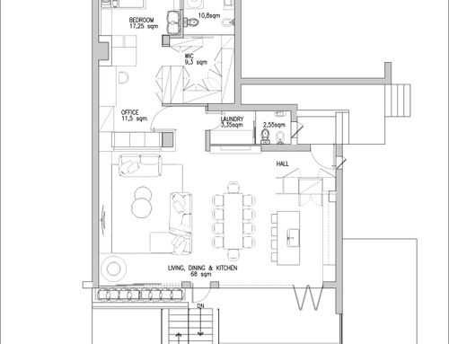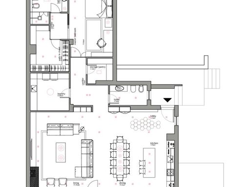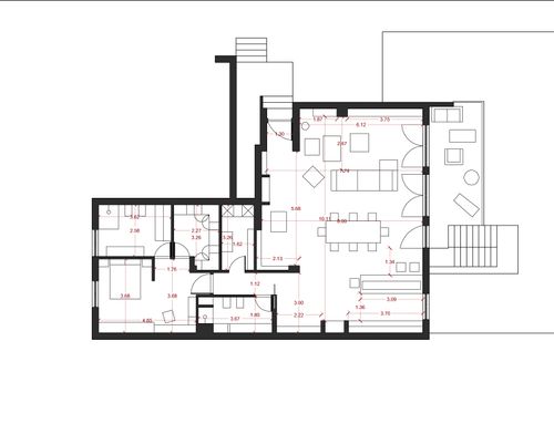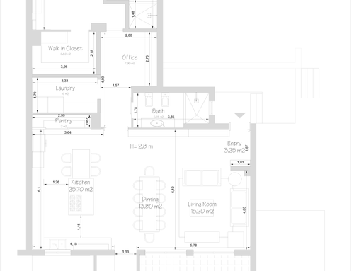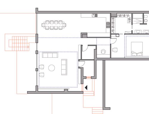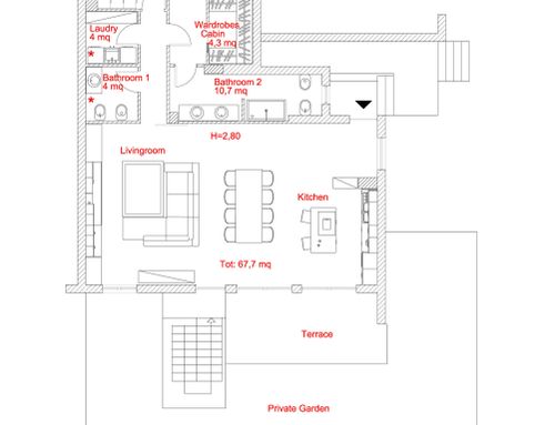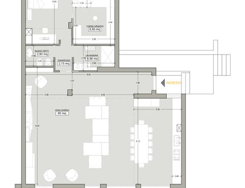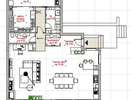 - - Un ambiente unico che comprende cucina sala pranzo e soggiorno con tavolo molto conviviale valutare la possibilità di includervi un camino stile moderno.