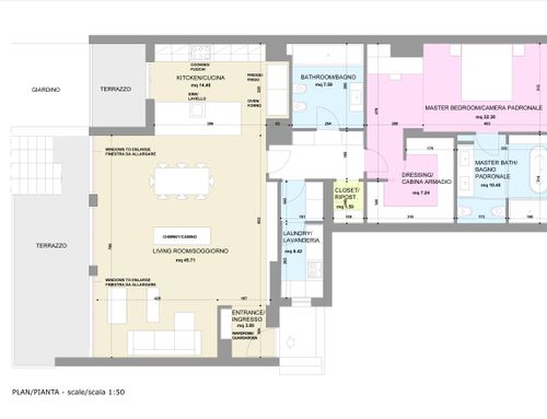 - rifacimento di tutti gli infissi, con incremento della dimensione delle vetrate che si affacciano sul giardino.