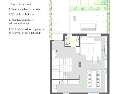 Hola a todos, tengo una casa en 4 niveles, mi interés en este momento es principalmente la planta baja, son 60 metros cuadrados más el exterior que me gustaría amueblar. En cuanto al diseño interno actual no tengo intención de cambiarlo, solo puedo hacer pequeños cambios pero no estructurales: