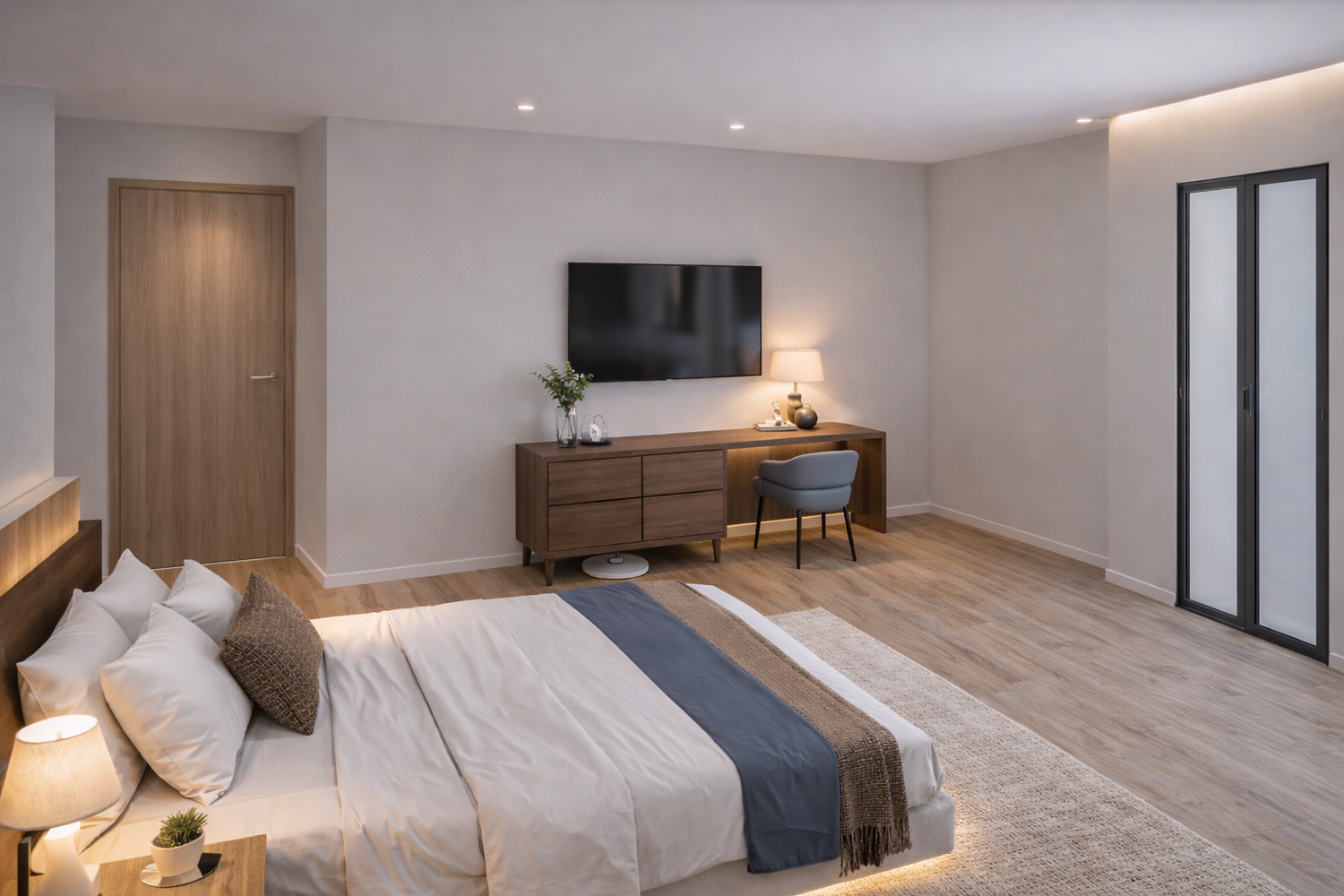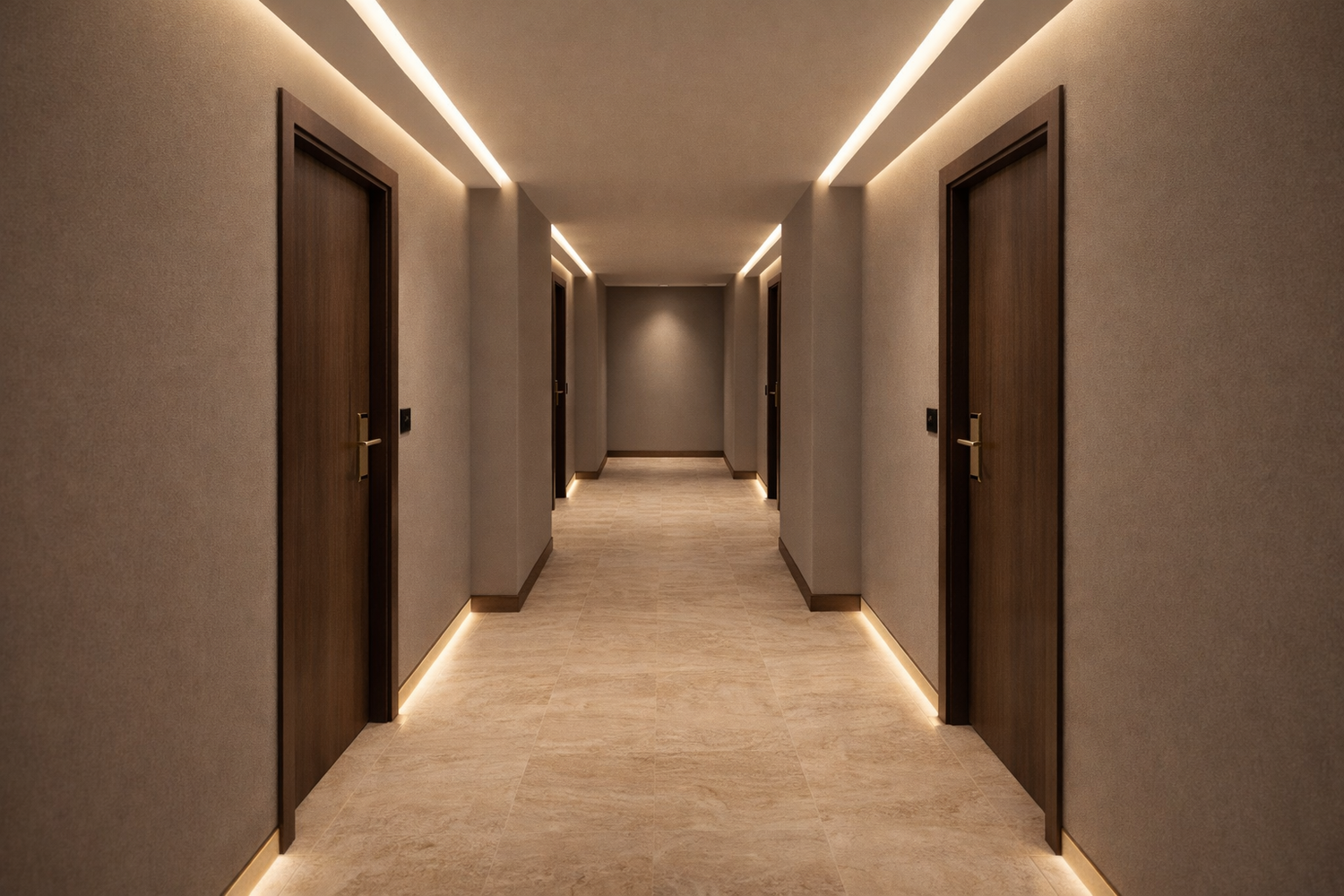 In response to the client’s brief, the project focused on transforming the guesthouse into a modern and vibrant space that appeals to a younger audience attending festivals while ensuring it stands out among the many surrounding identical properties. A complete renovation was carried out including full bathroom gutting and redesign with a contemporary aesthetic, complete refurbishment of all bedrooms with a fresh modern approach, and upgrading the corridors with enhanced finishes and indirect lighting to improve the overall spatial experience. Indirect lighting was also integrated in selected bedrooms to create a warm and atmospheric environment. Custom fabrication was developed for bedside tables as well as a built-in cupboard unit in each room designed specifically to conceal the fridge and safe in order to maintain a clean and organized visual appearance. Carefully selected materials were used to balance durability, warmth, and modern appeal including wood flooring in the bedrooms to add comfort and character, Calacatta tiles in the bathrooms for an elegant marble-inspired finish, and travertine flooring in the corridors to introduce natural texture and a refined contemporary identity.