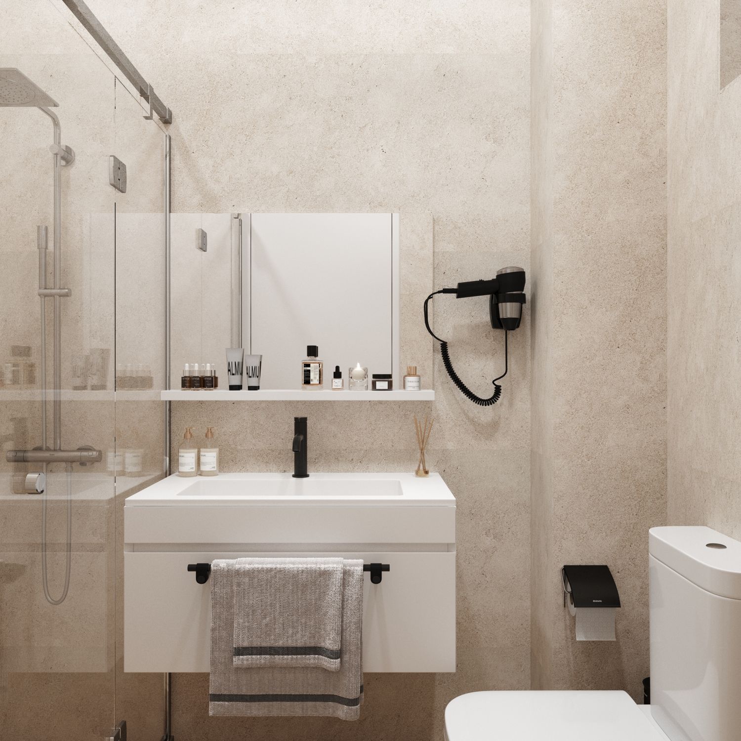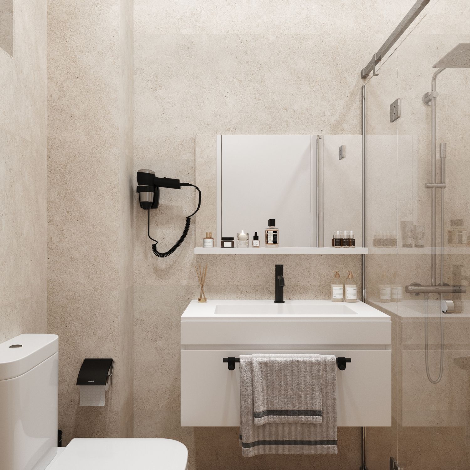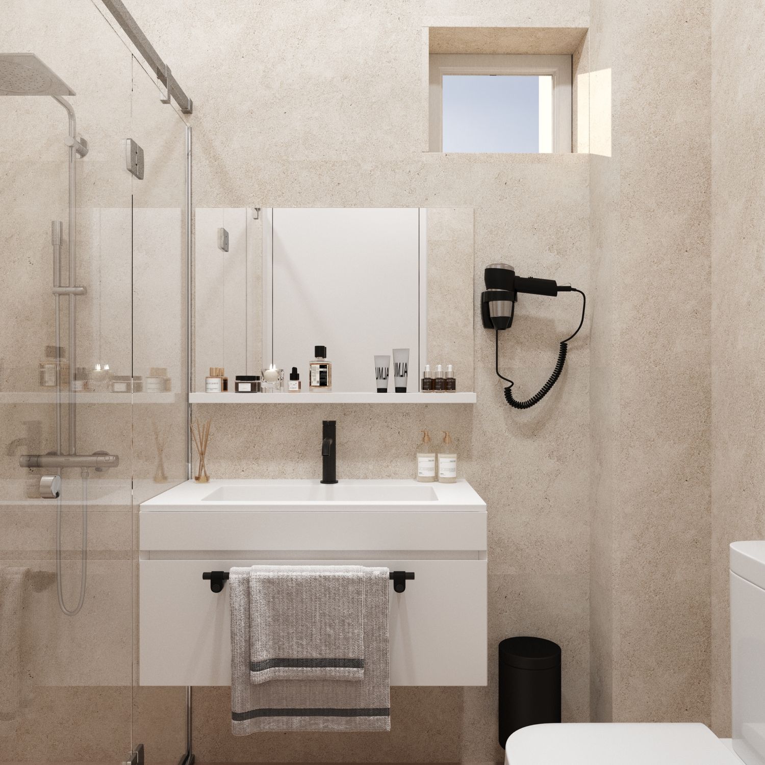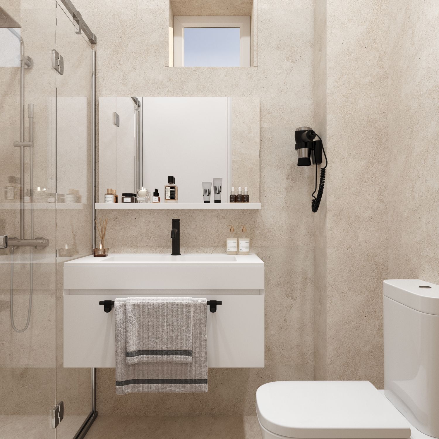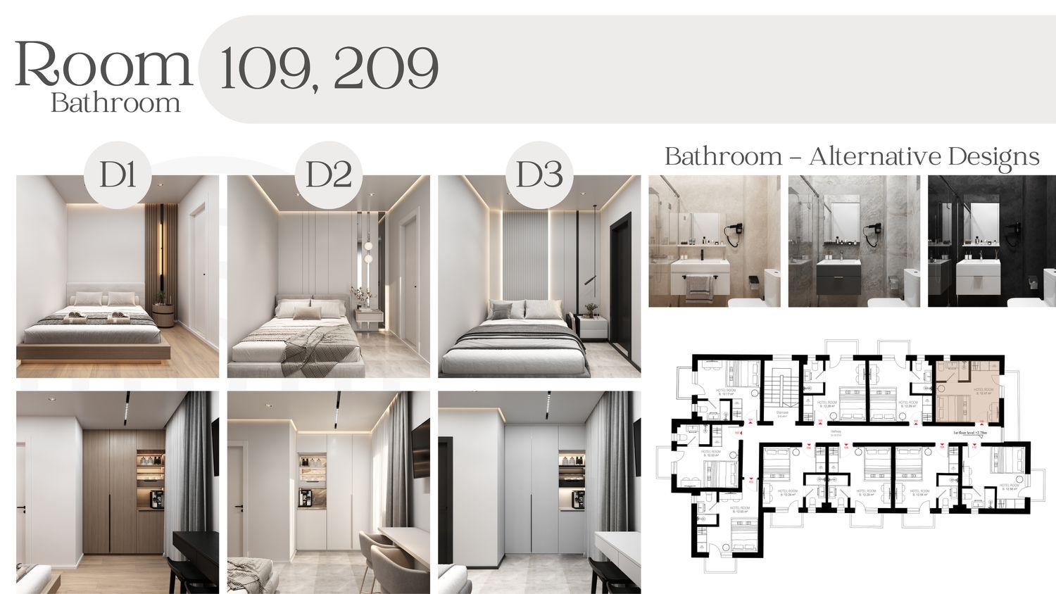 As part of this project, three different design alternatives have been prepared in order to facilitate the decision-making process and allow for a clear comparison of options. For each alternative, technical drawings and 3D renderings have been produced. In addition, seven different ceramic options and three different bathroom furniture options were tested for the bathrooms, and renderings were prepared for each of these alternatives.