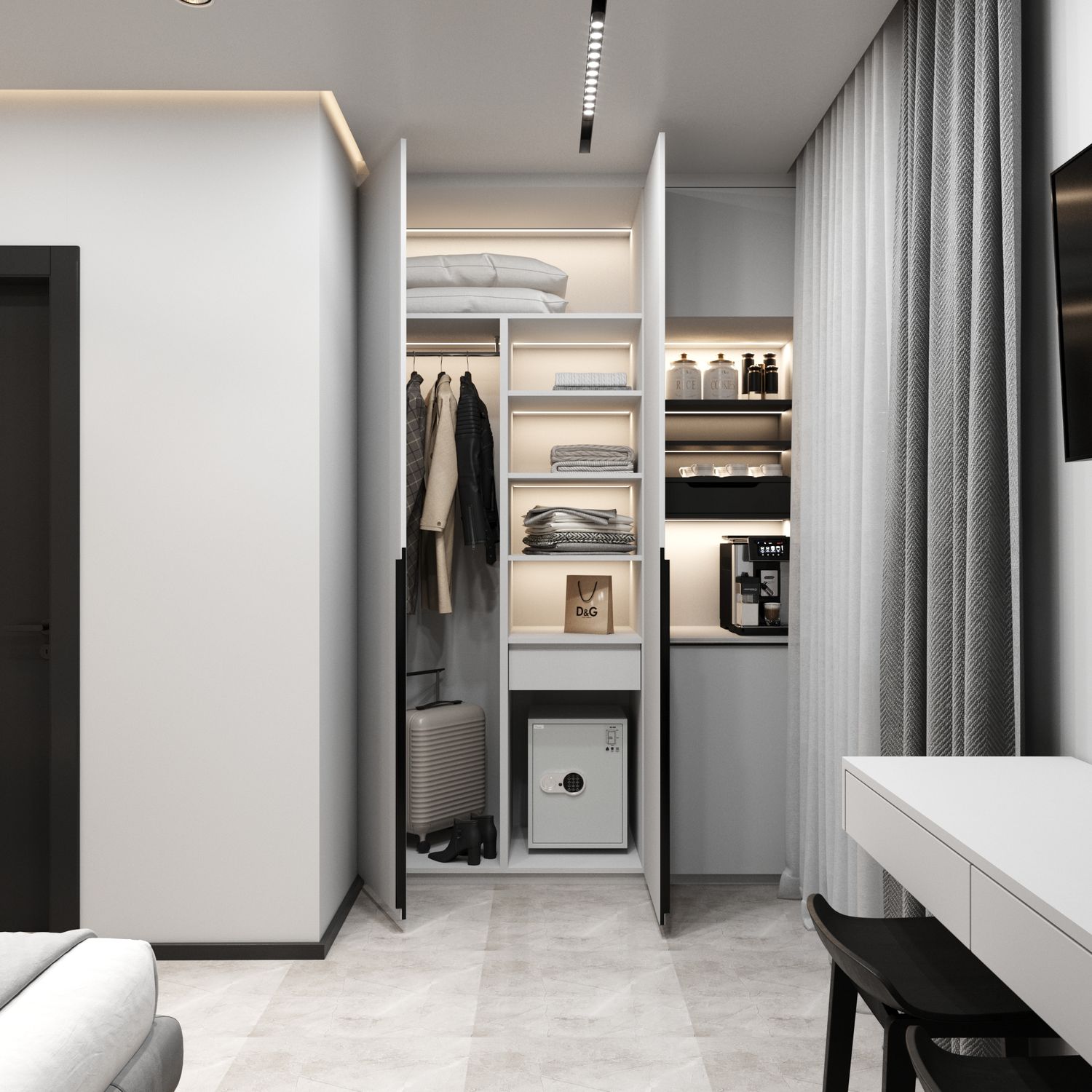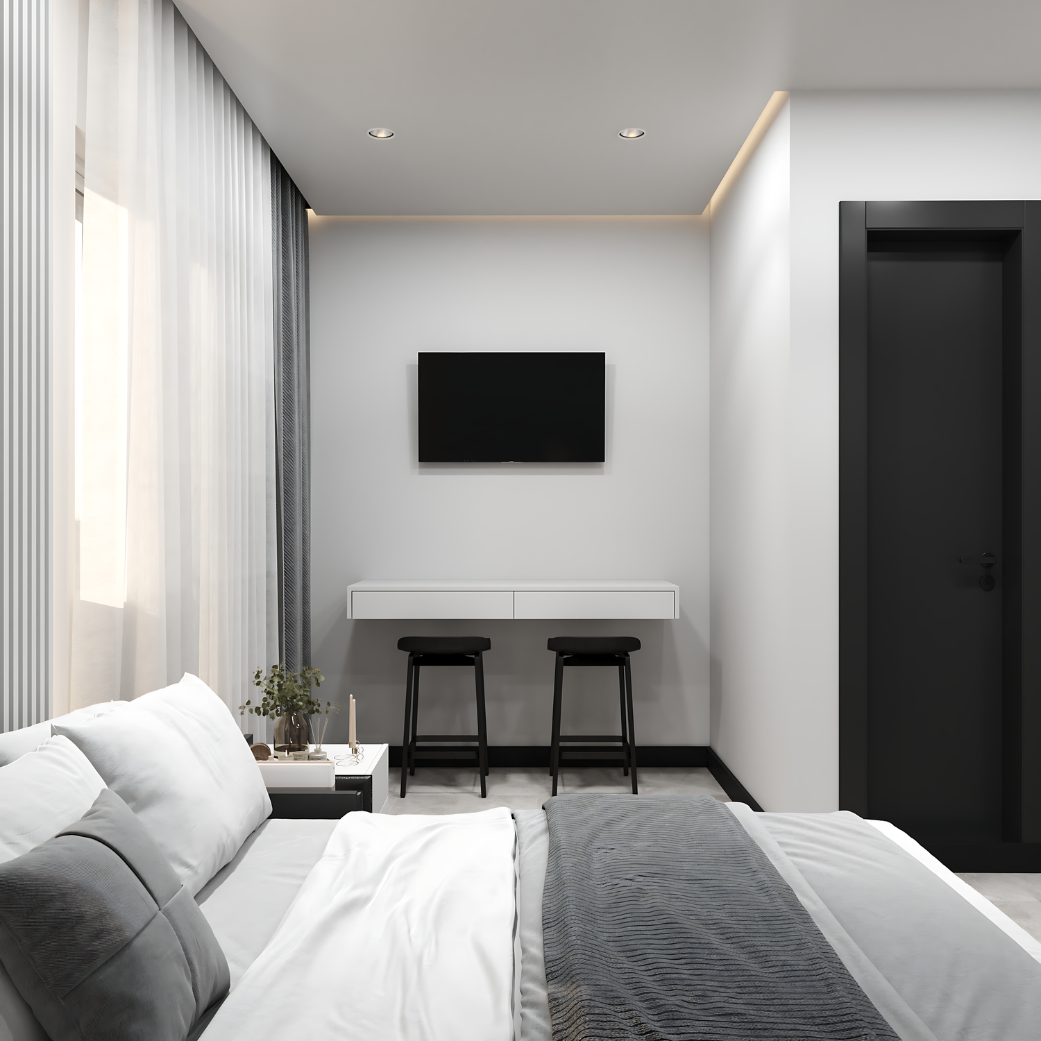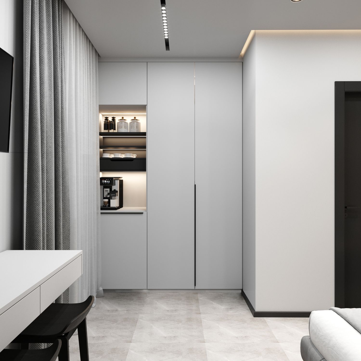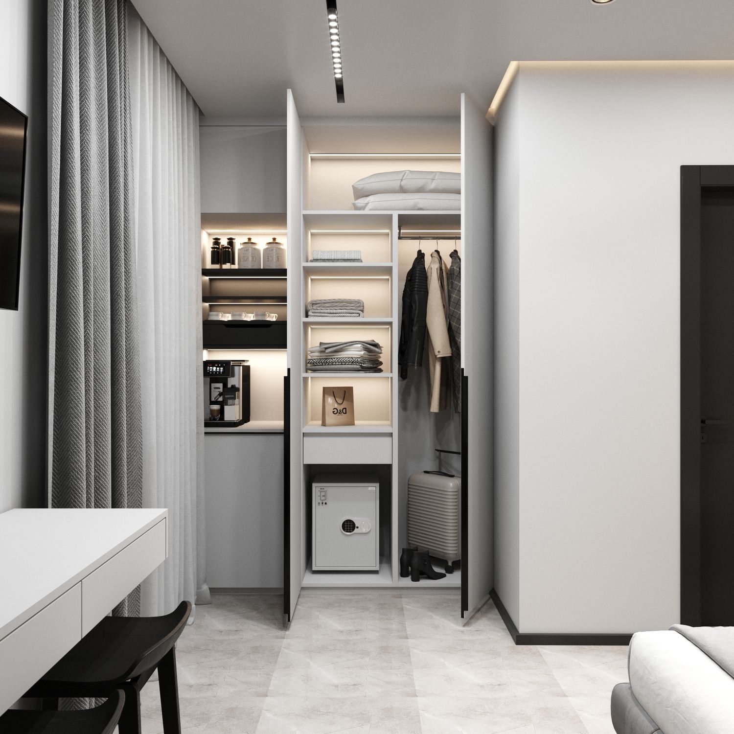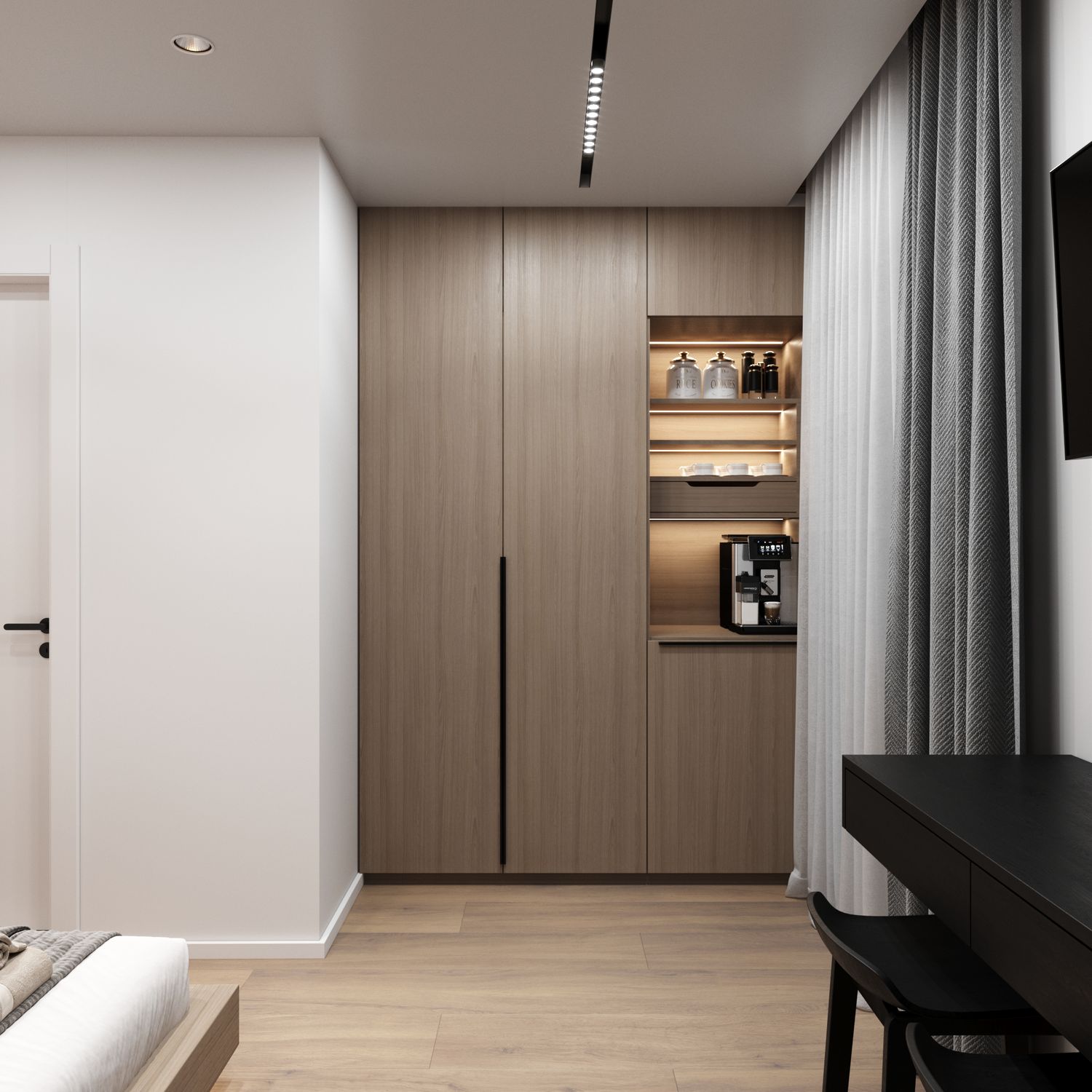 For the guest rooms, a separate cabinet unit has been designed to conceal the mini fridge and the safe. In addition, the bedside tables were treated as separate furniture pieces, and their designs were developed by selecting ready-to-purchase products. Likewise, for the furniture elements planned for custom fabrication, the design work has been completed and fully coordinated so that they can be applied according to the selected design alternative.