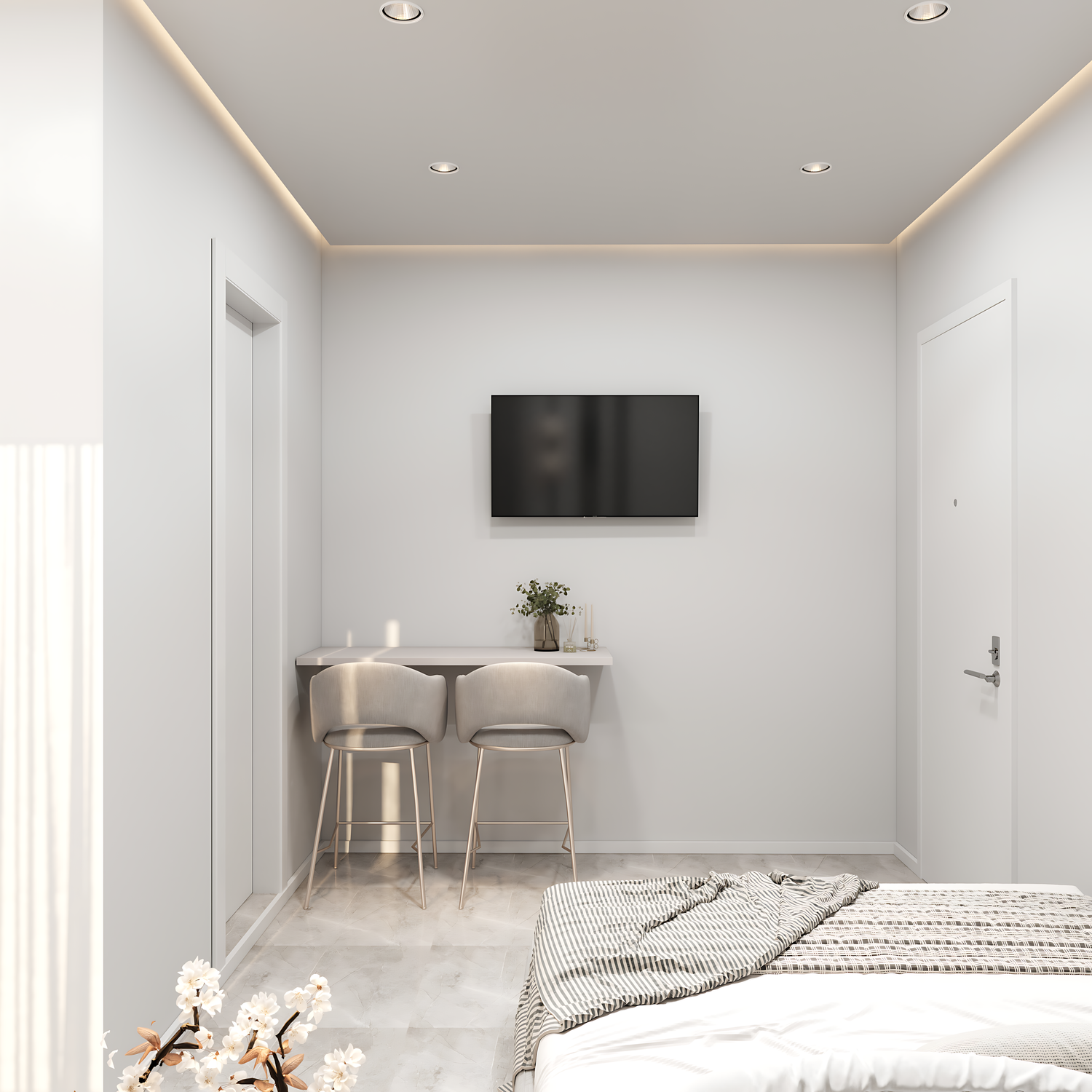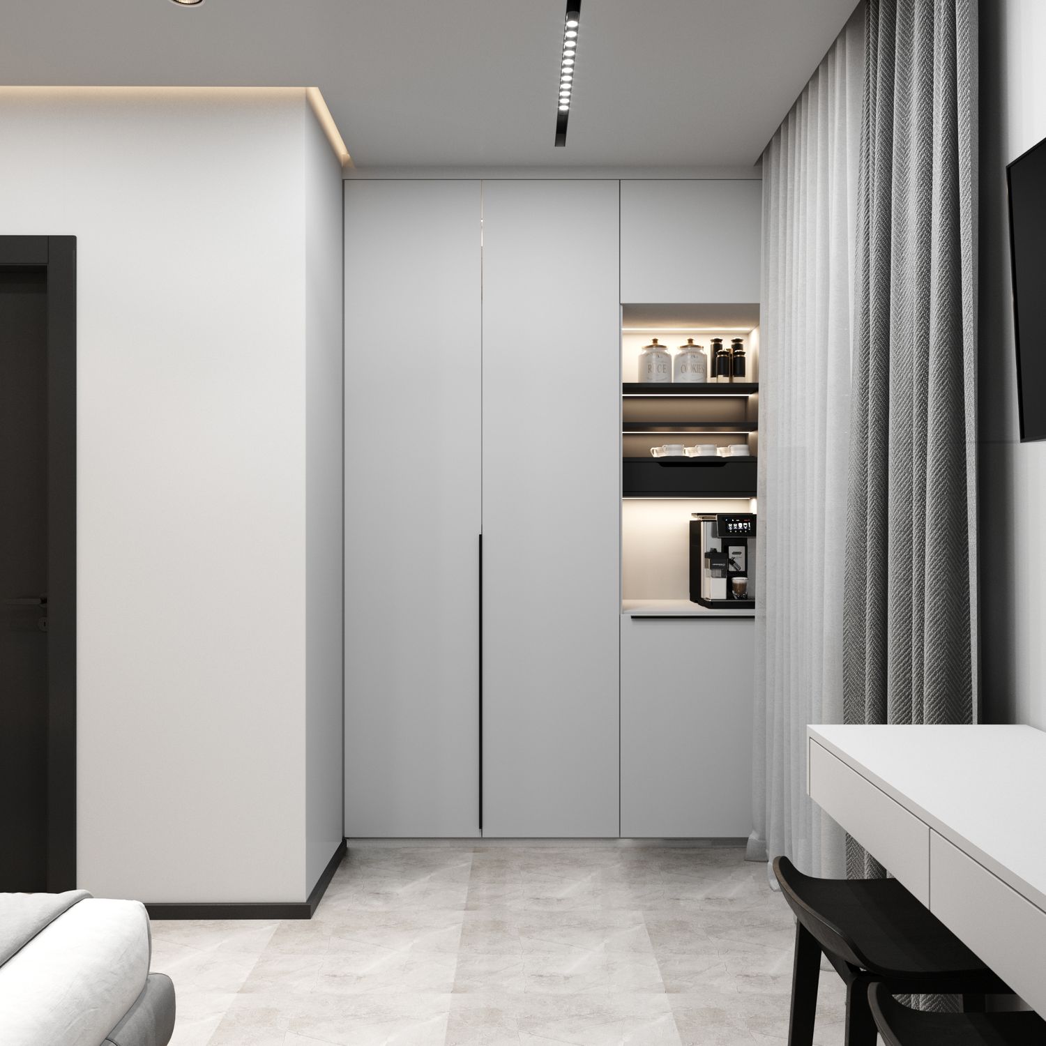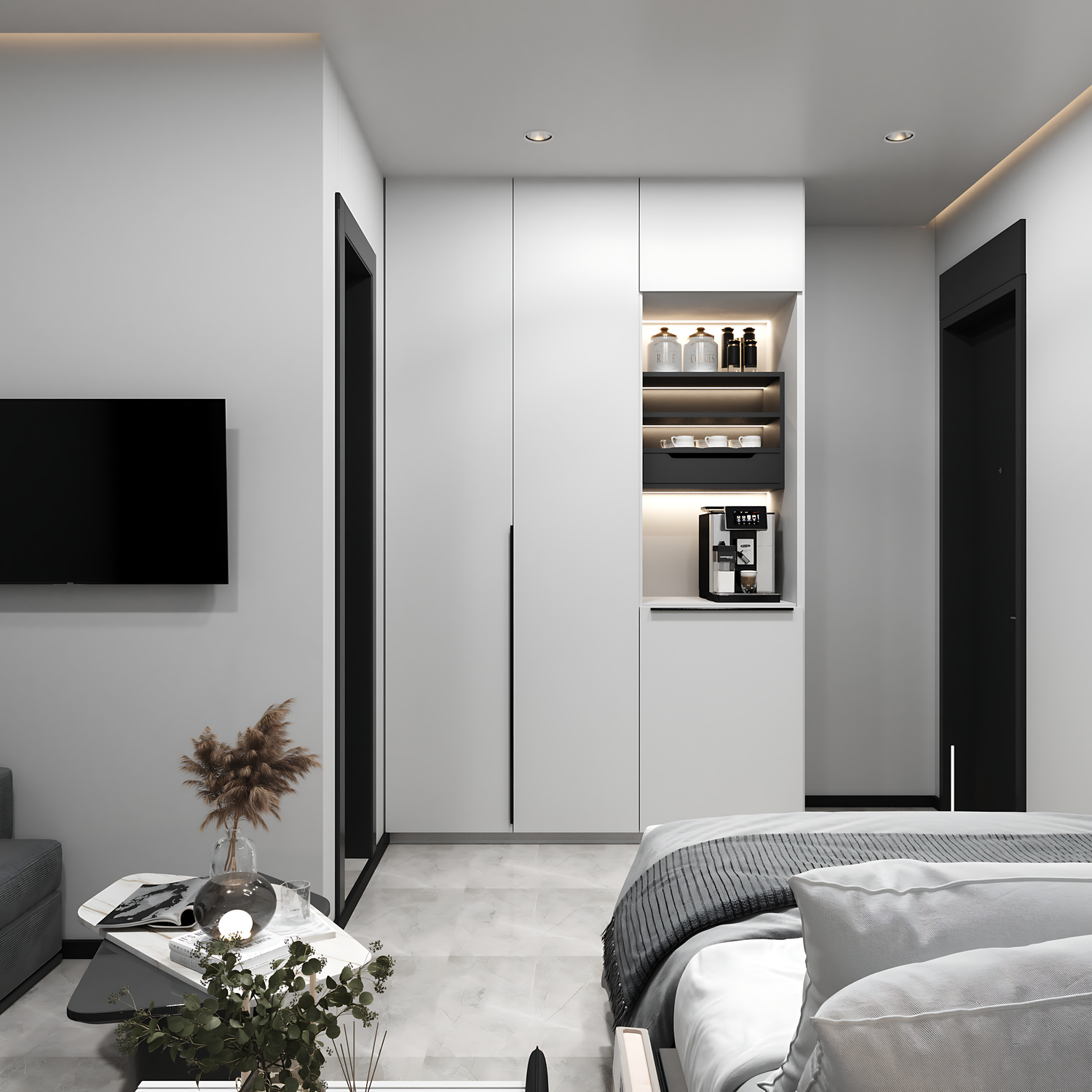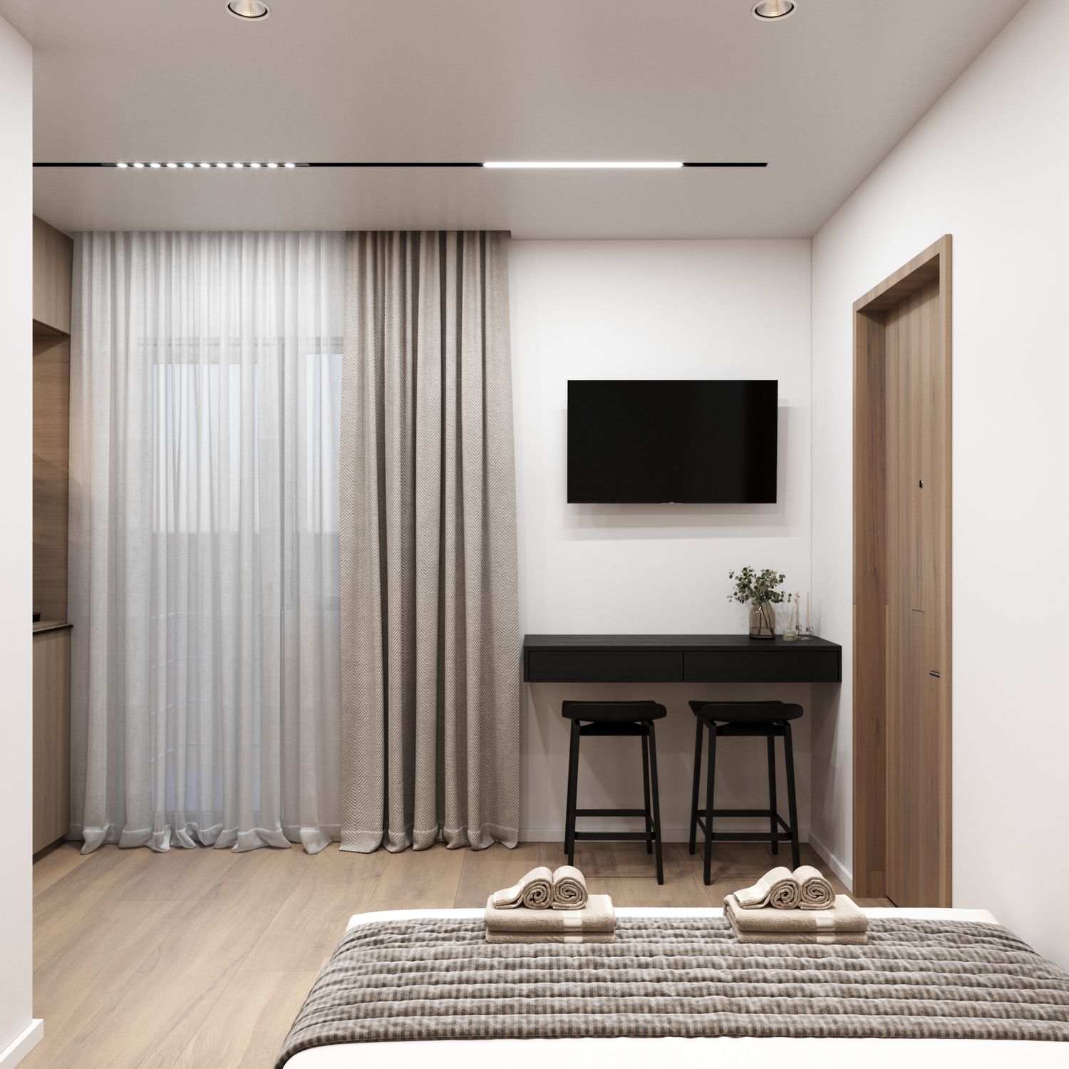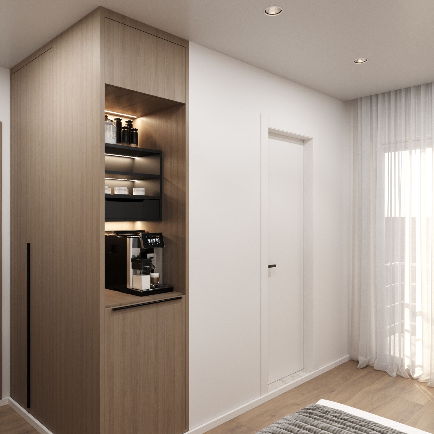 For the guest rooms, a separate cabinet unit has been designed to conceal the mini fridge and the safe. In addition, the bedside tables were treated as separate furniture pieces, and their designs were developed by selecting ready-to-purchase products. Likewise, for the furniture elements planned for custom fabrication, the design work has been completed and fully coordinated so that they can be applied according to the selected design alternative.