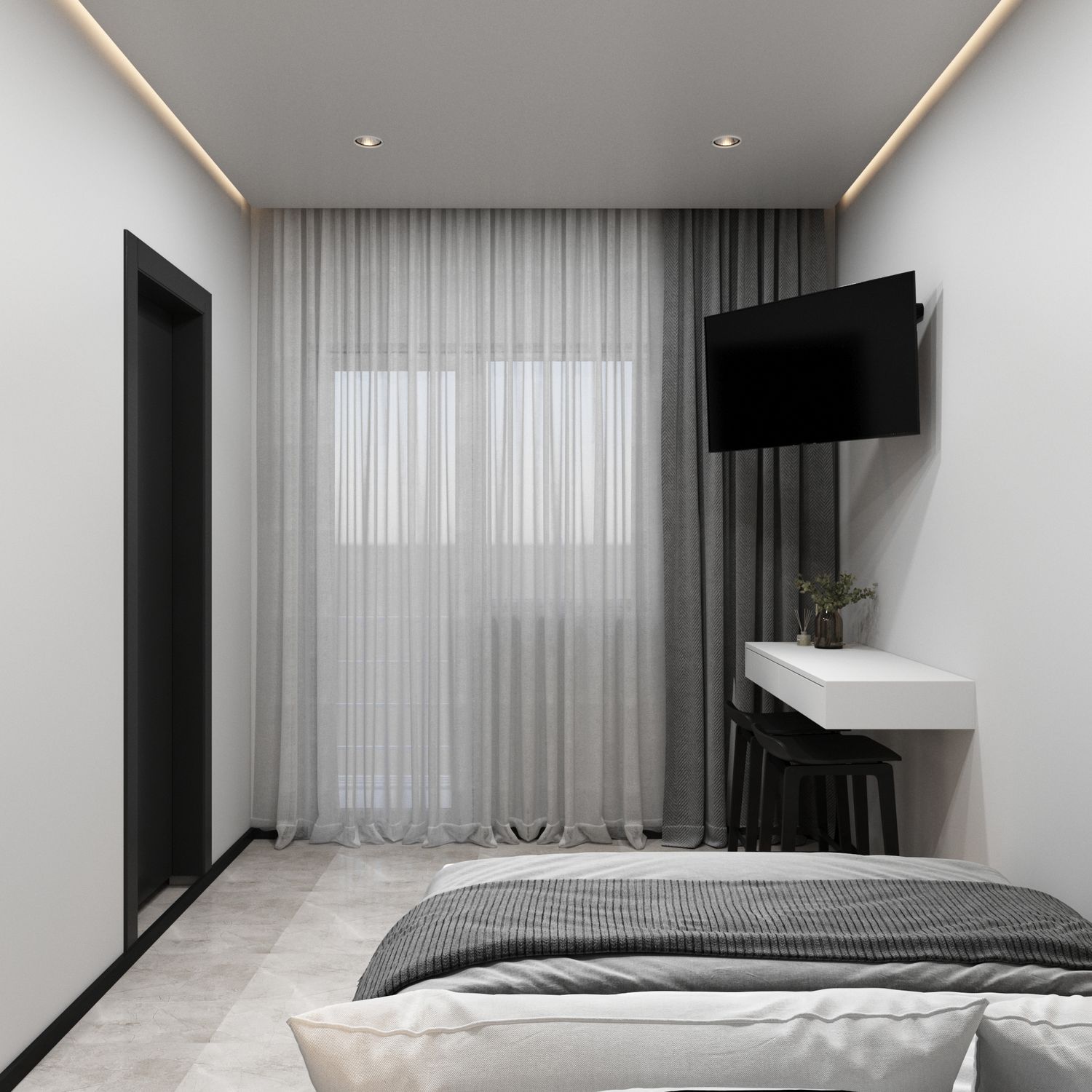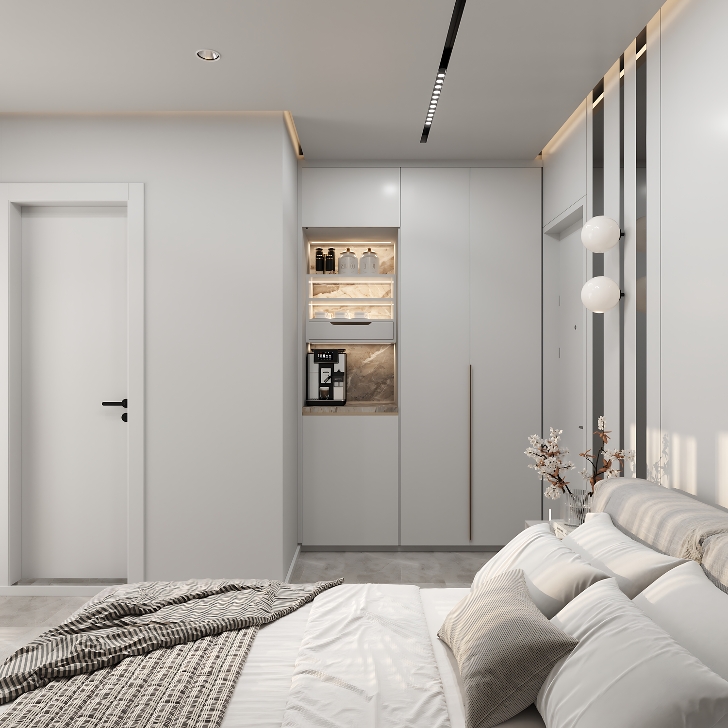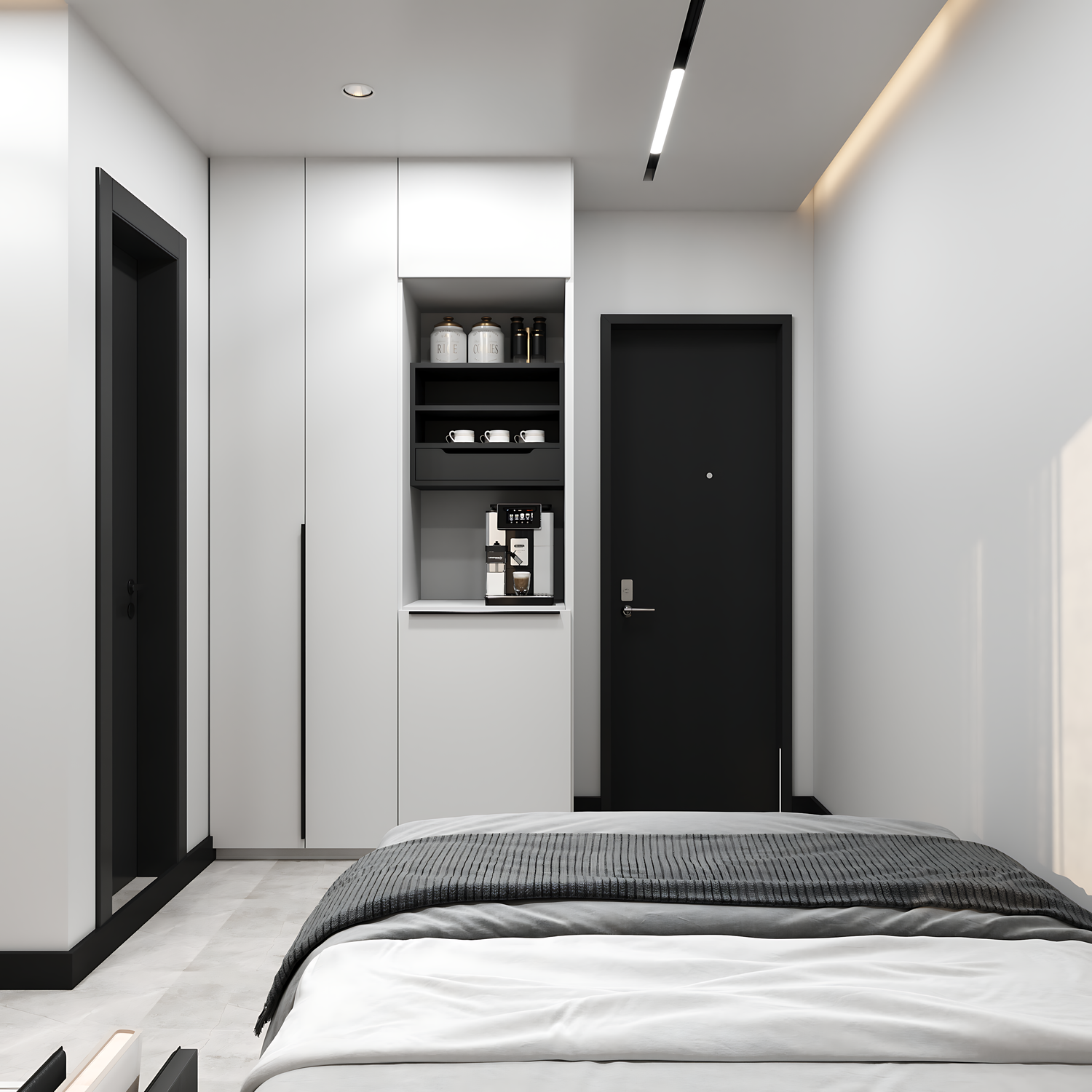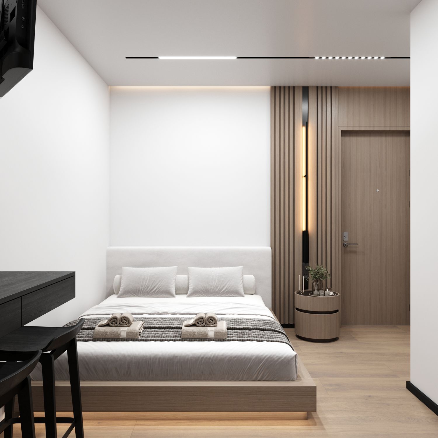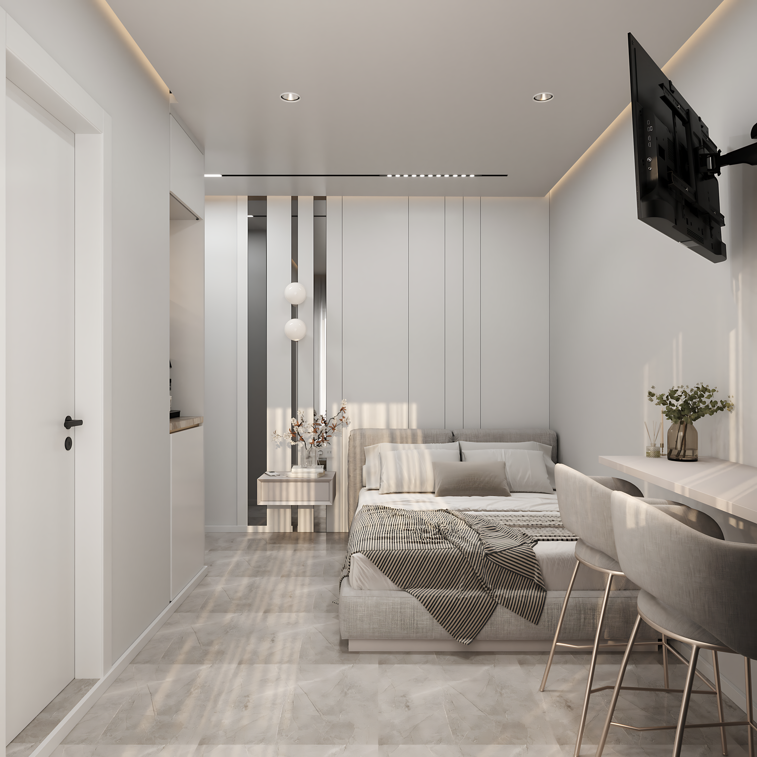 For the guest rooms, a separate cabinet unit has been designed to conceal the mini fridge and the safe. In addition, the bedside tables were treated as separate furniture pieces, and their designs were developed by selecting ready-to-purchase products. Likewise, for the furniture elements planned for custom fabrication, the design work has been completed and fully coordinated so that they can be applied according to the selected design alternative.