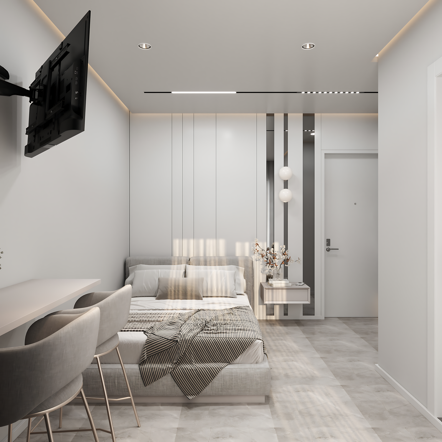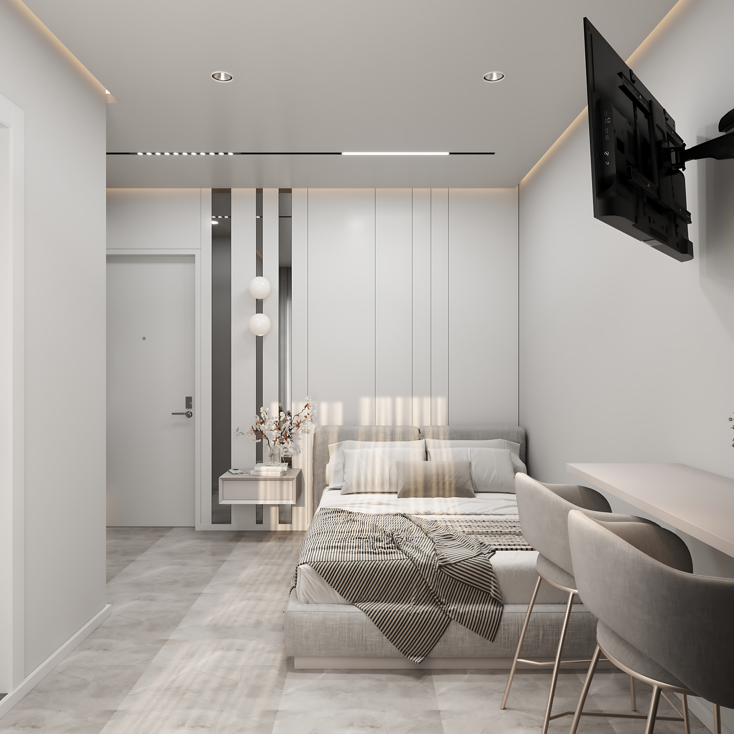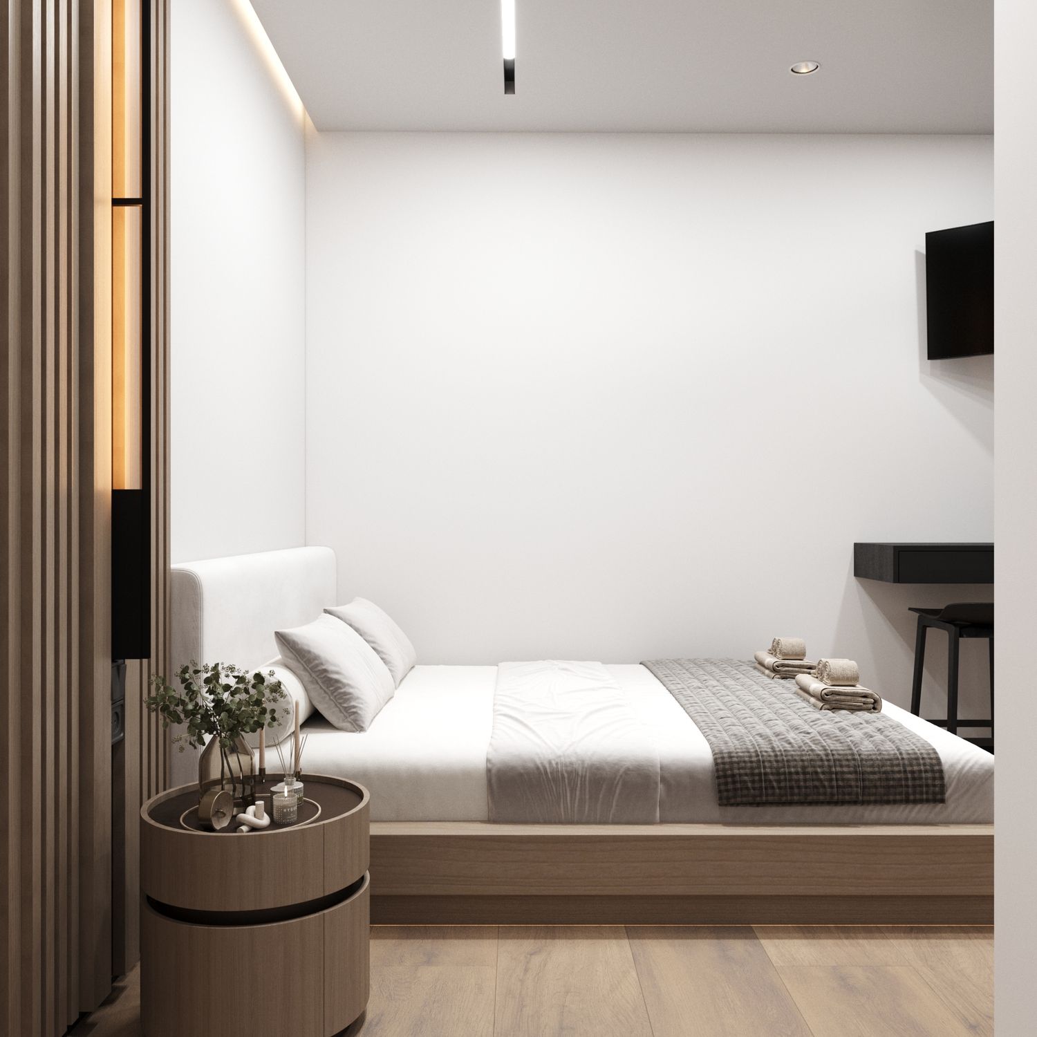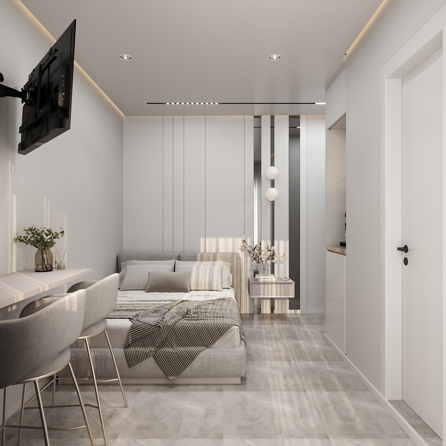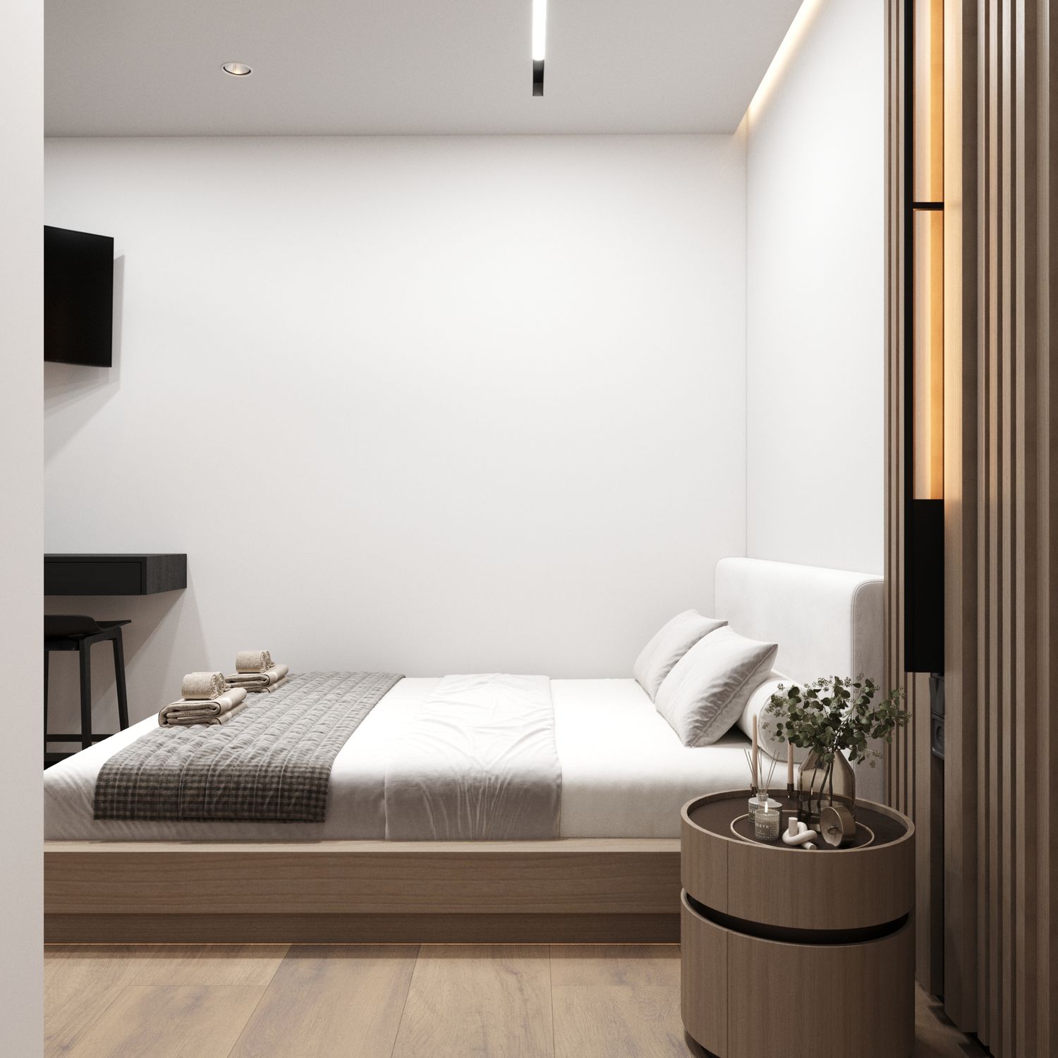 For the guest rooms, a separate cabinet unit has been designed to conceal the mini fridge and the safe. In addition, the bedside tables were treated as separate furniture pieces, and their designs were developed by selecting ready-to-purchase products. Likewise, for the furniture elements planned for custom fabrication, the design work has been completed and fully coordinated so that they can be applied according to the selected design alternative.