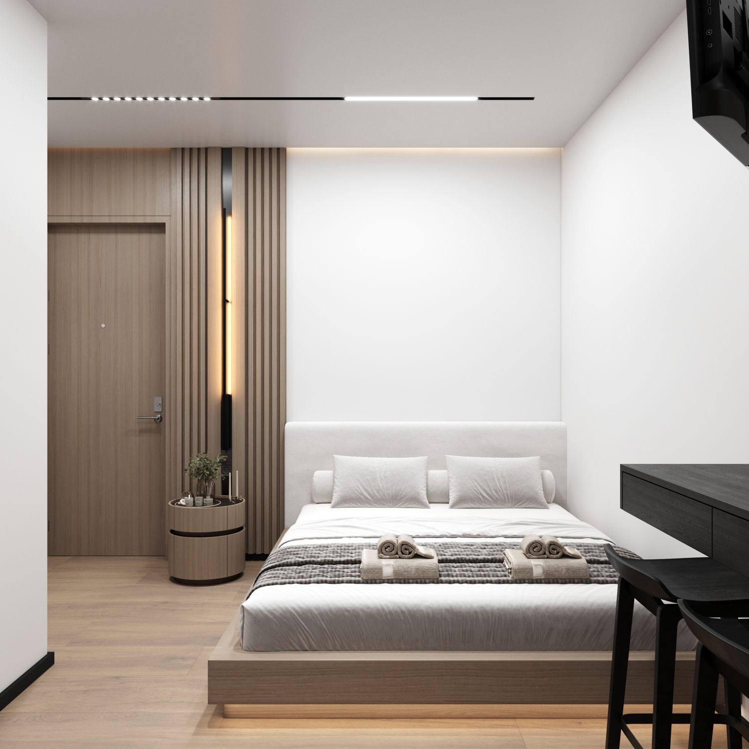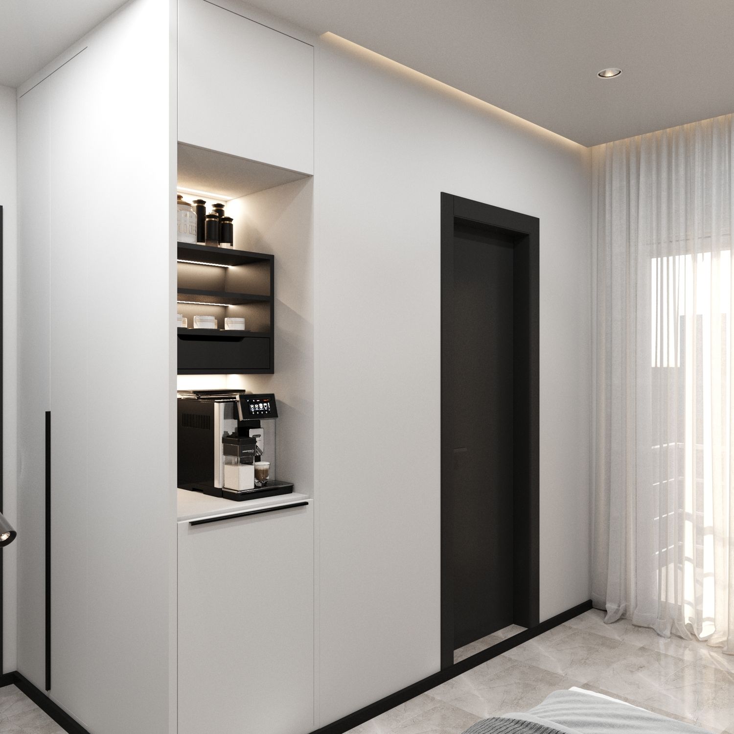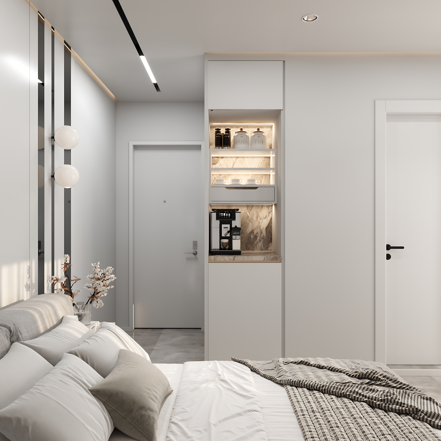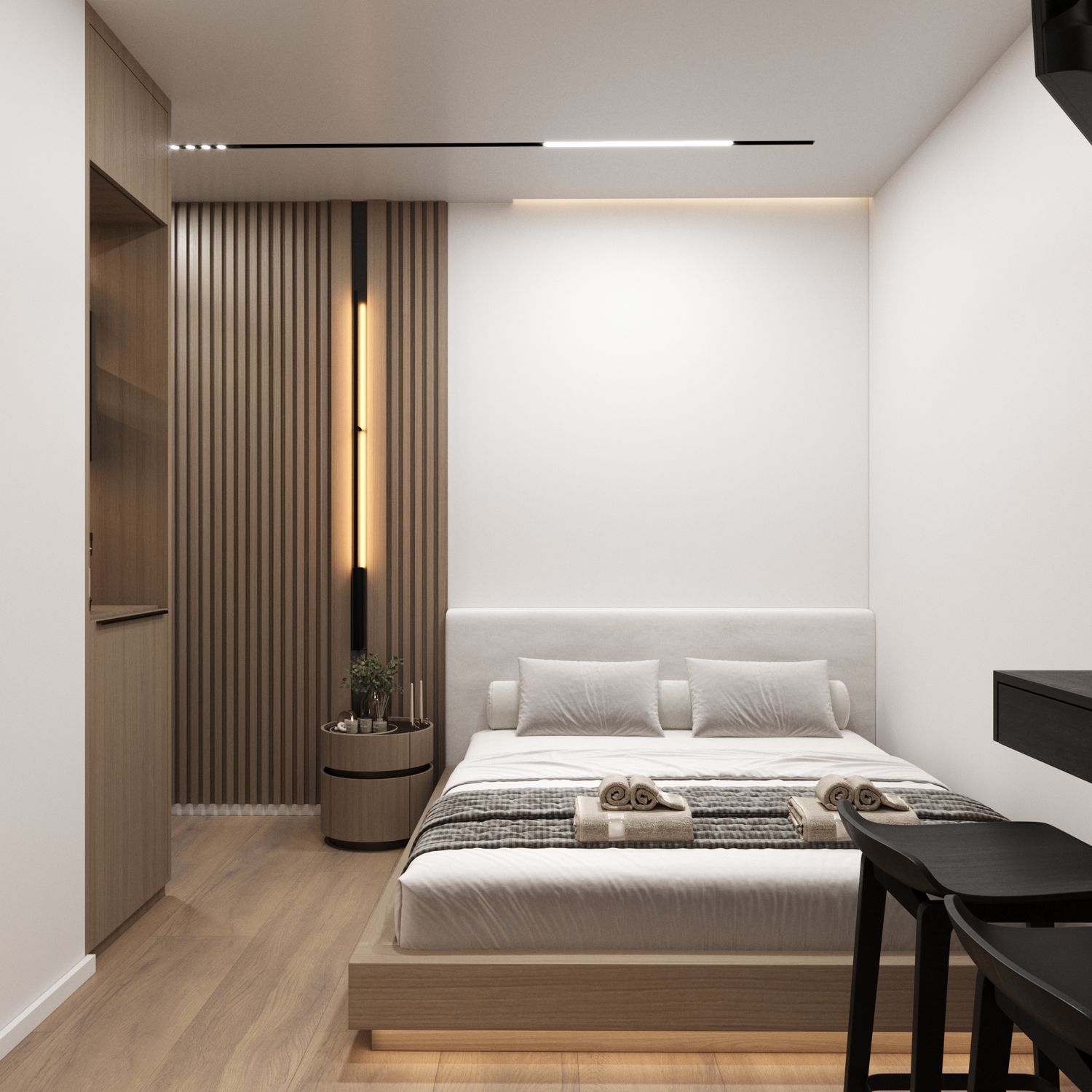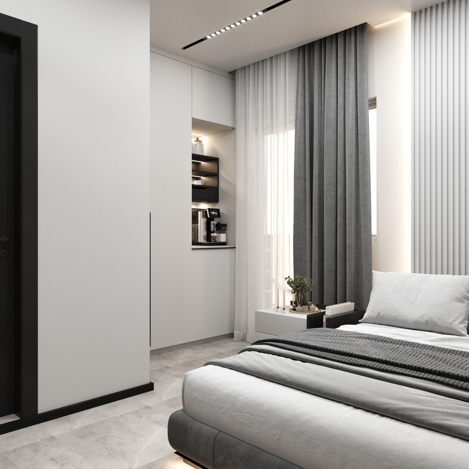 For the guest rooms, a separate cabinet unit has been designed to conceal the mini fridge and the safe. In addition, the bedside tables were treated as separate furniture pieces, and their designs were developed by selecting ready-to-purchase products. Likewise, for the furniture elements planned for custom fabrication, the design work has been completed and fully coordinated so that they can be applied according to the selected design alternative.