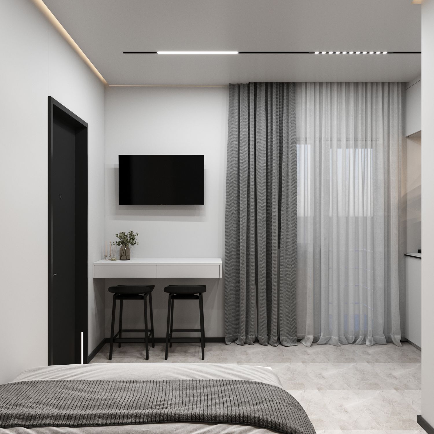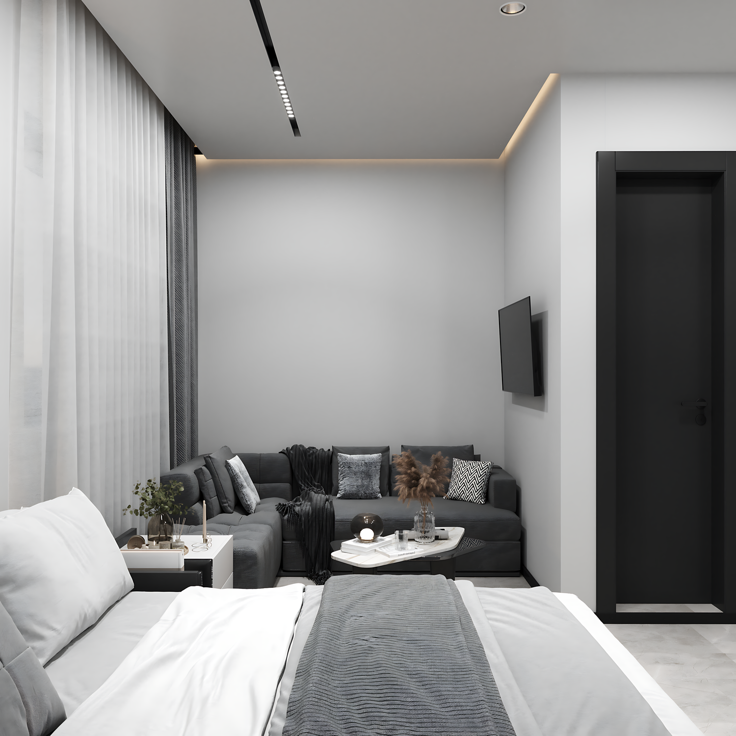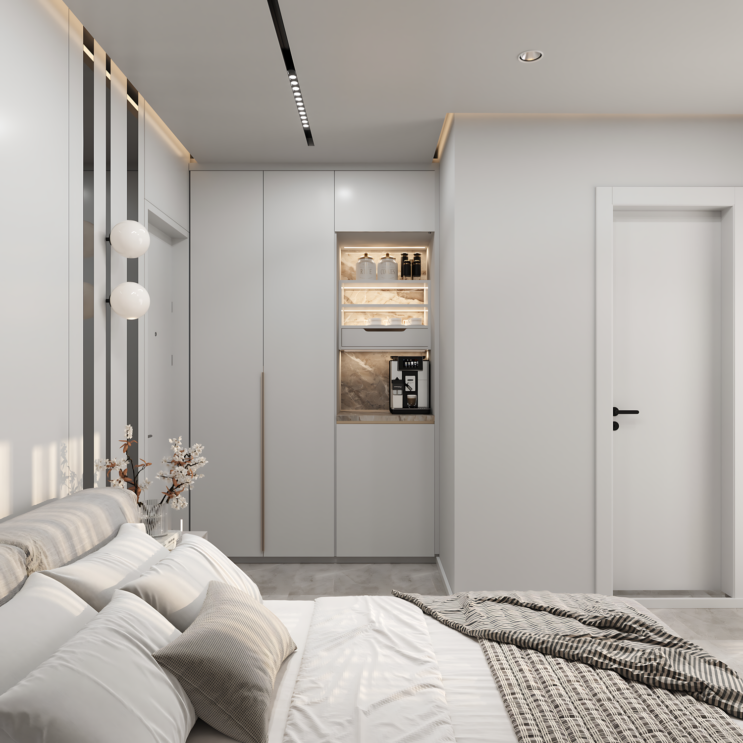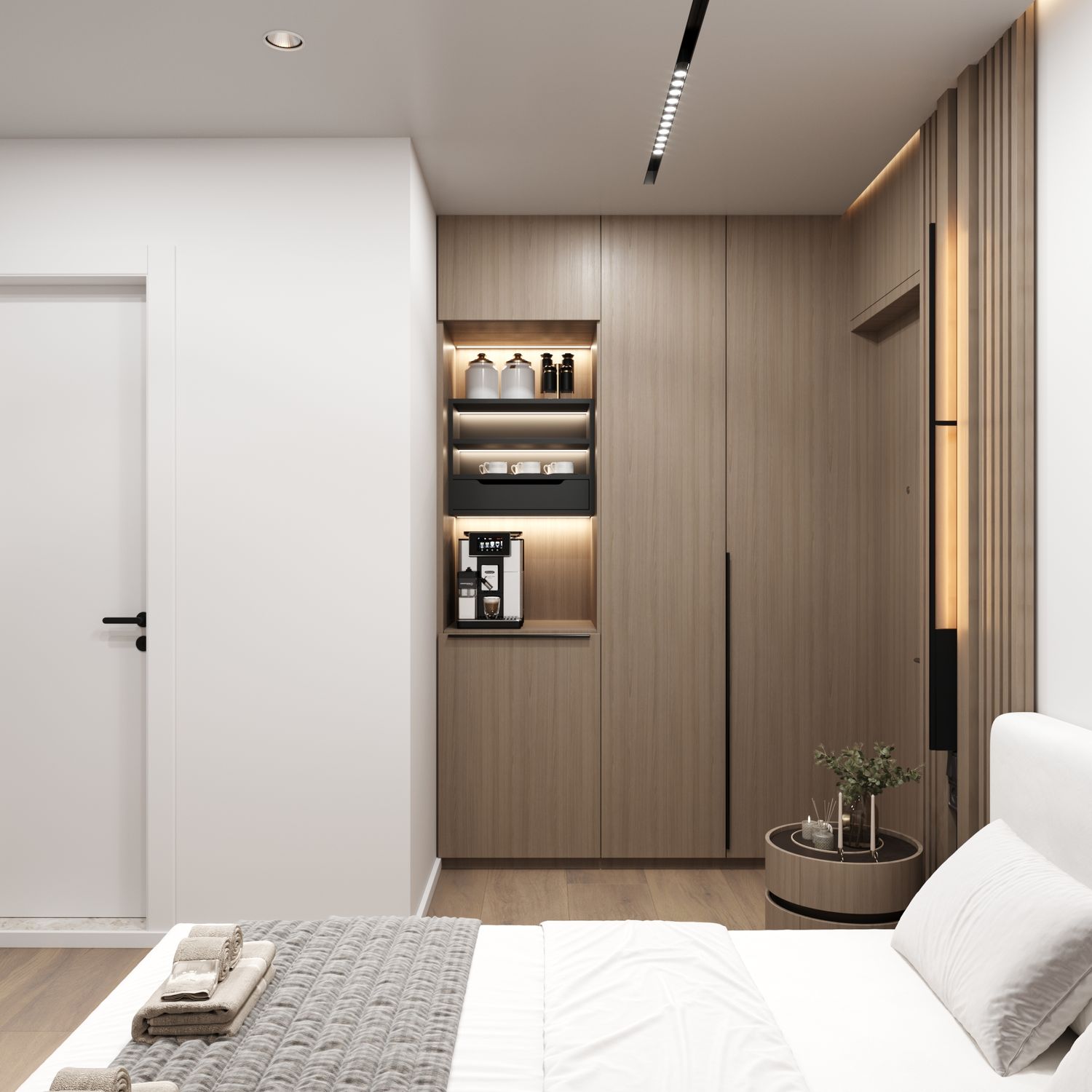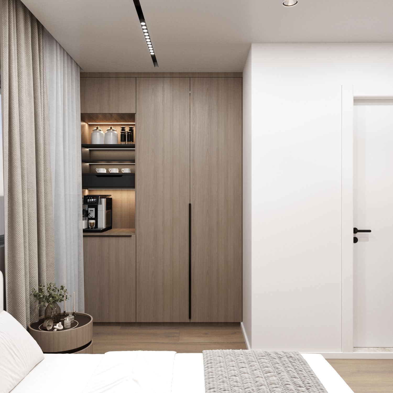 For the guest rooms, a separate cabinet unit has been designed to conceal the mini fridge and the safe. In addition, the bedside tables were treated as separate furniture pieces, and their designs were developed by selecting ready-to-purchase products. Likewise, for the furniture elements planned for custom fabrication, the design work has been completed and fully coordinated so that they can be applied according to the selected design alternative.