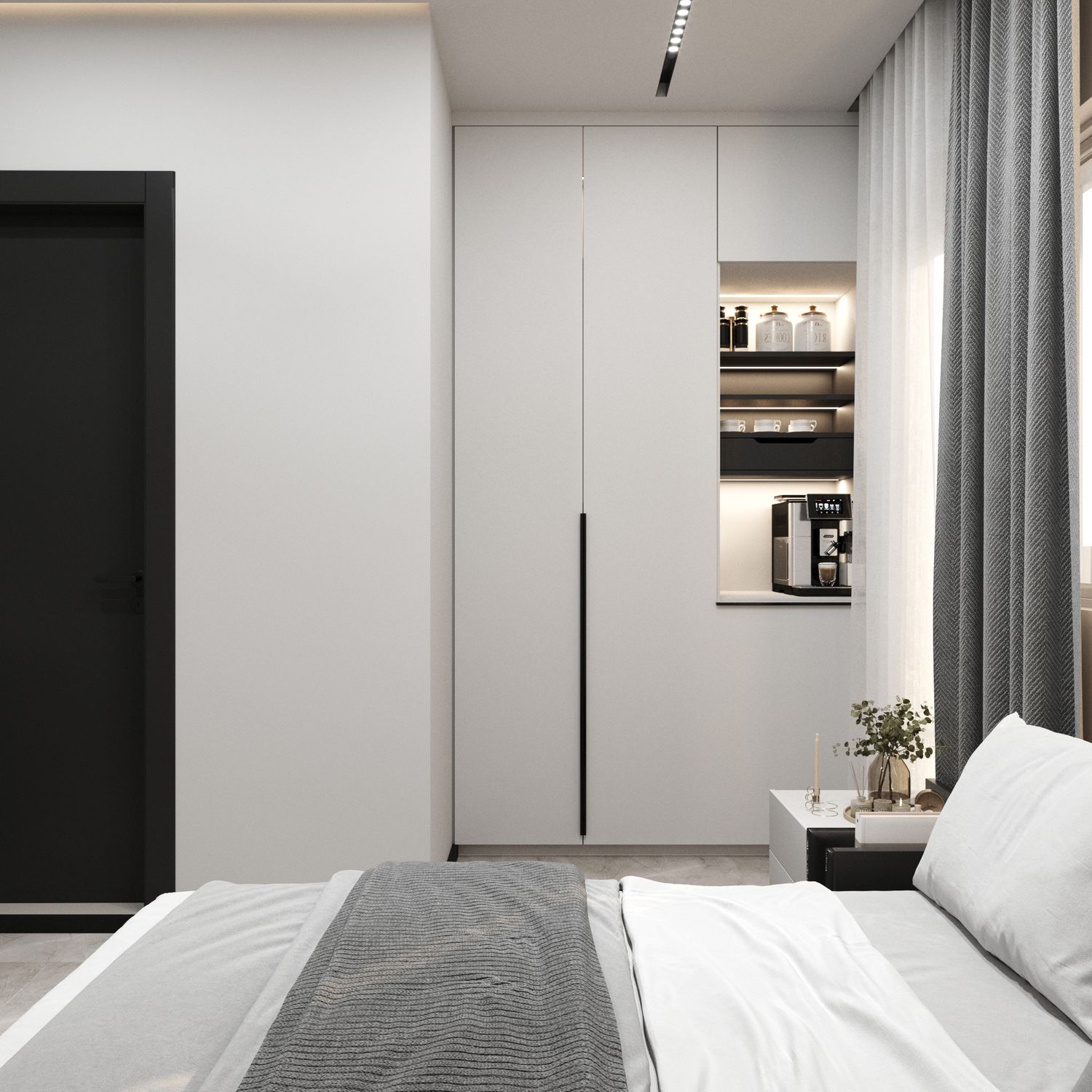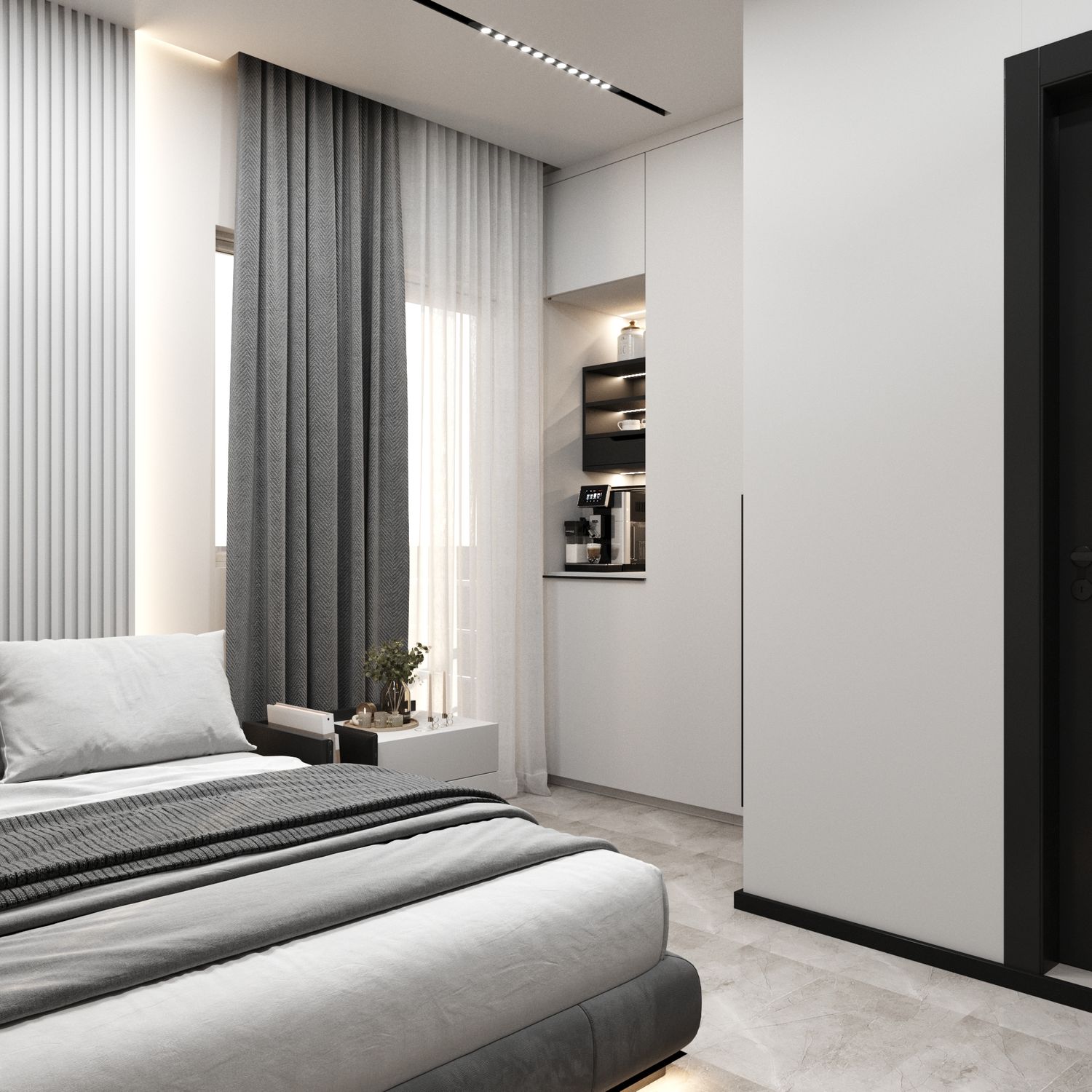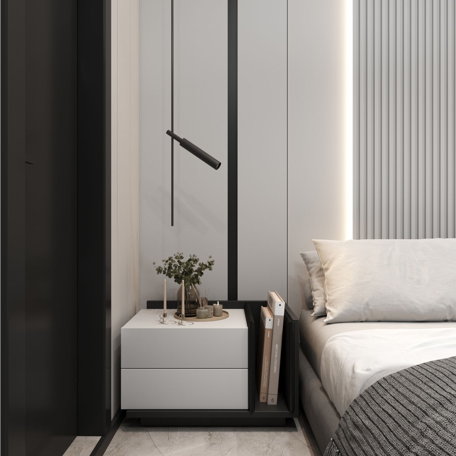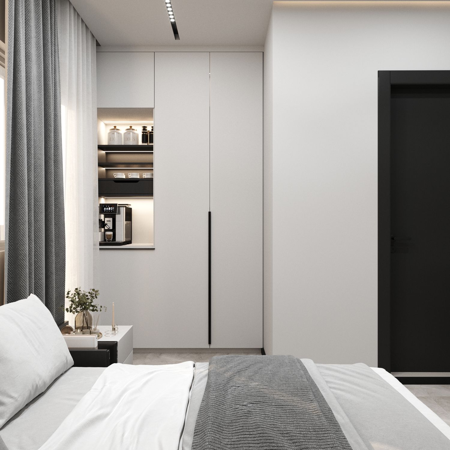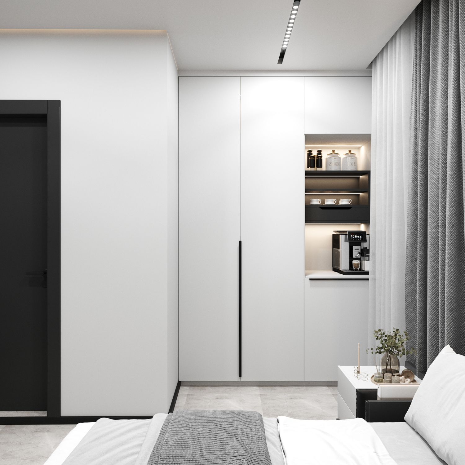 For the guest rooms, a separate cabinet unit has been designed to conceal the mini fridge and the safe. In addition, the bedside tables were treated as separate furniture pieces, and their designs were developed by selecting ready-to-purchase products. Likewise, for the furniture elements planned for custom fabrication, the design work has been completed and fully coordinated so that they can be applied according to the selected design alternative.