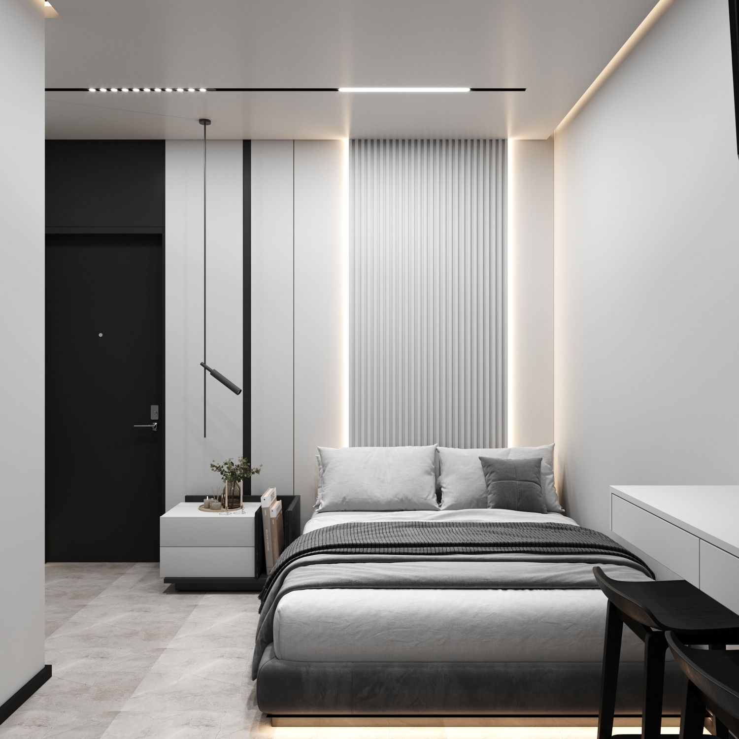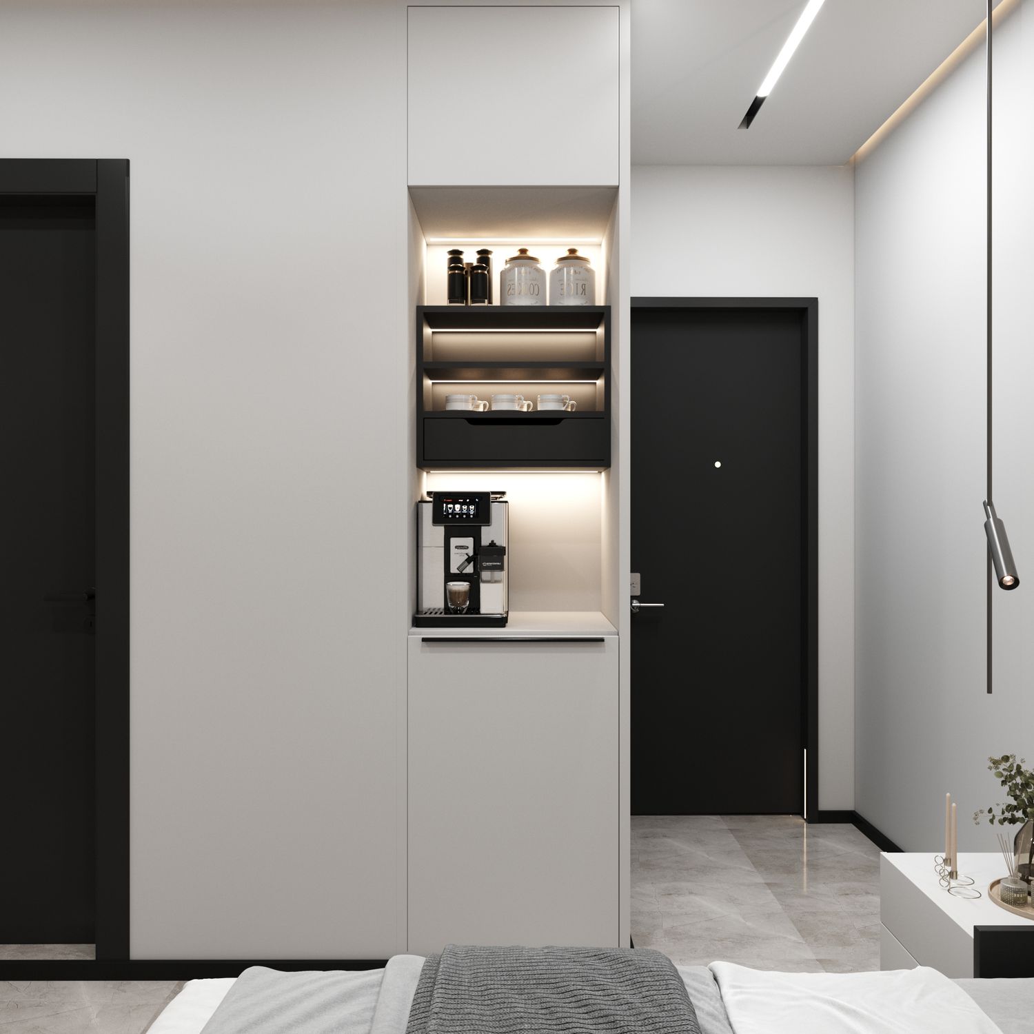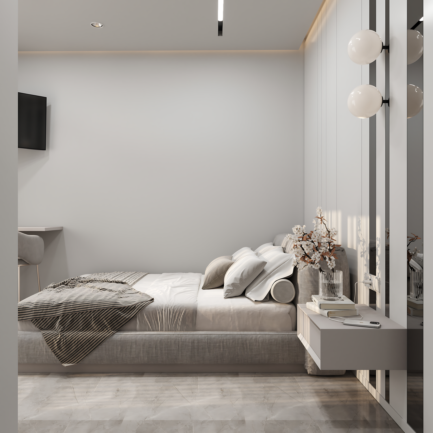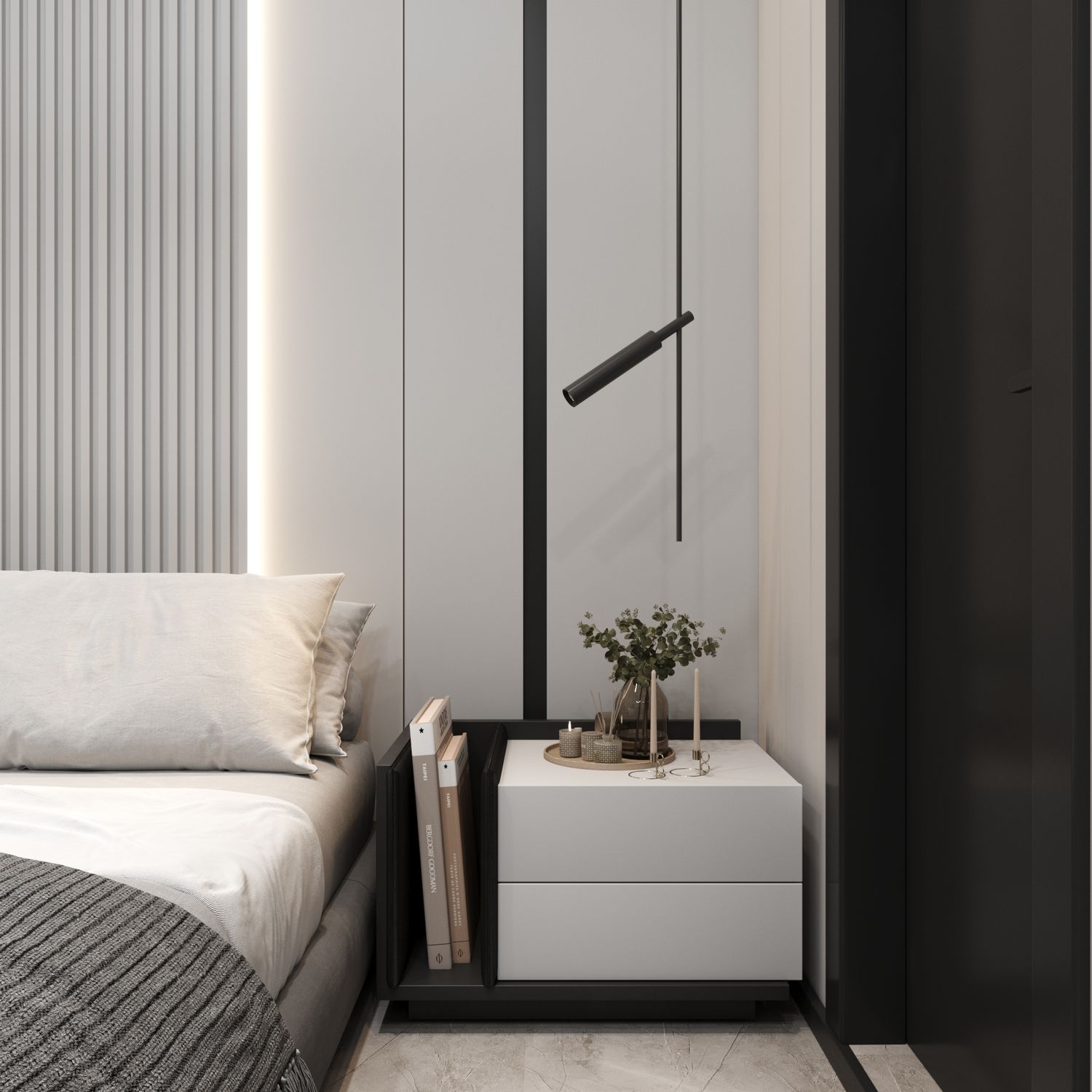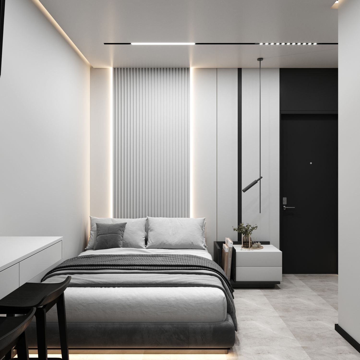 For the guest rooms, a separate cabinet unit has been designed to conceal the mini fridge and the safe. In addition, the bedside tables were treated as separate furniture pieces, and their designs were developed by selecting ready-to-purchase products. Likewise, for the furniture elements planned for custom fabrication, the design work has been completed and fully coordinated so that they can be applied according to the selected design alternative.