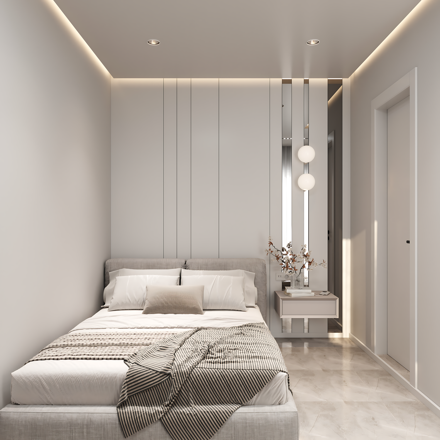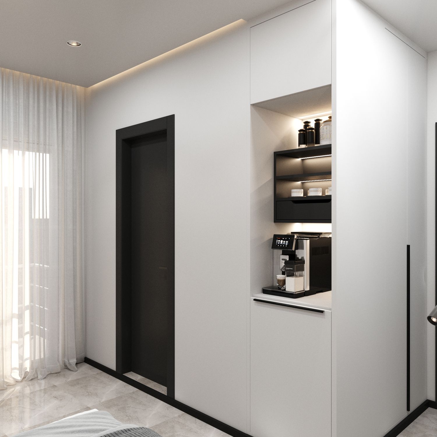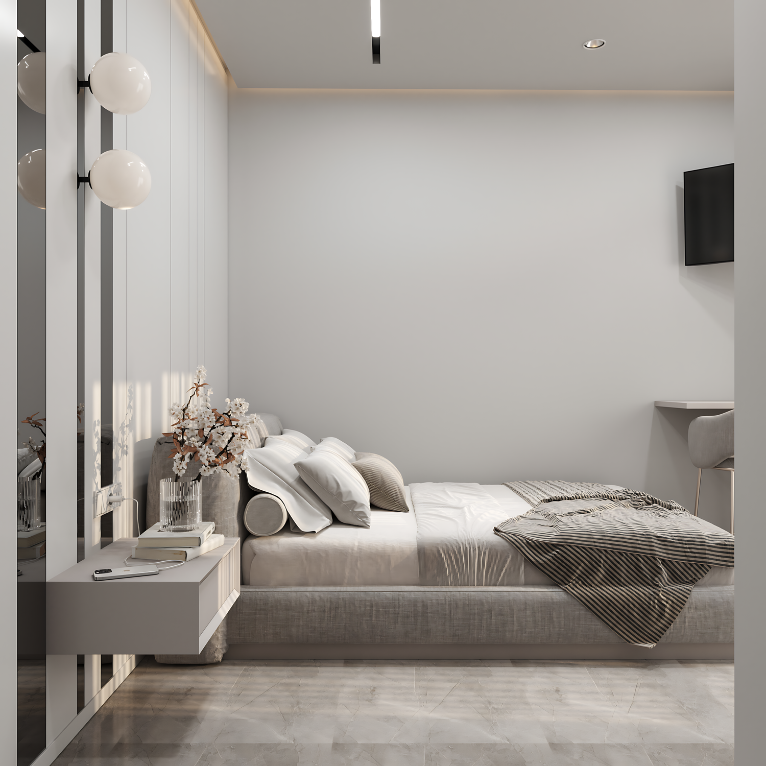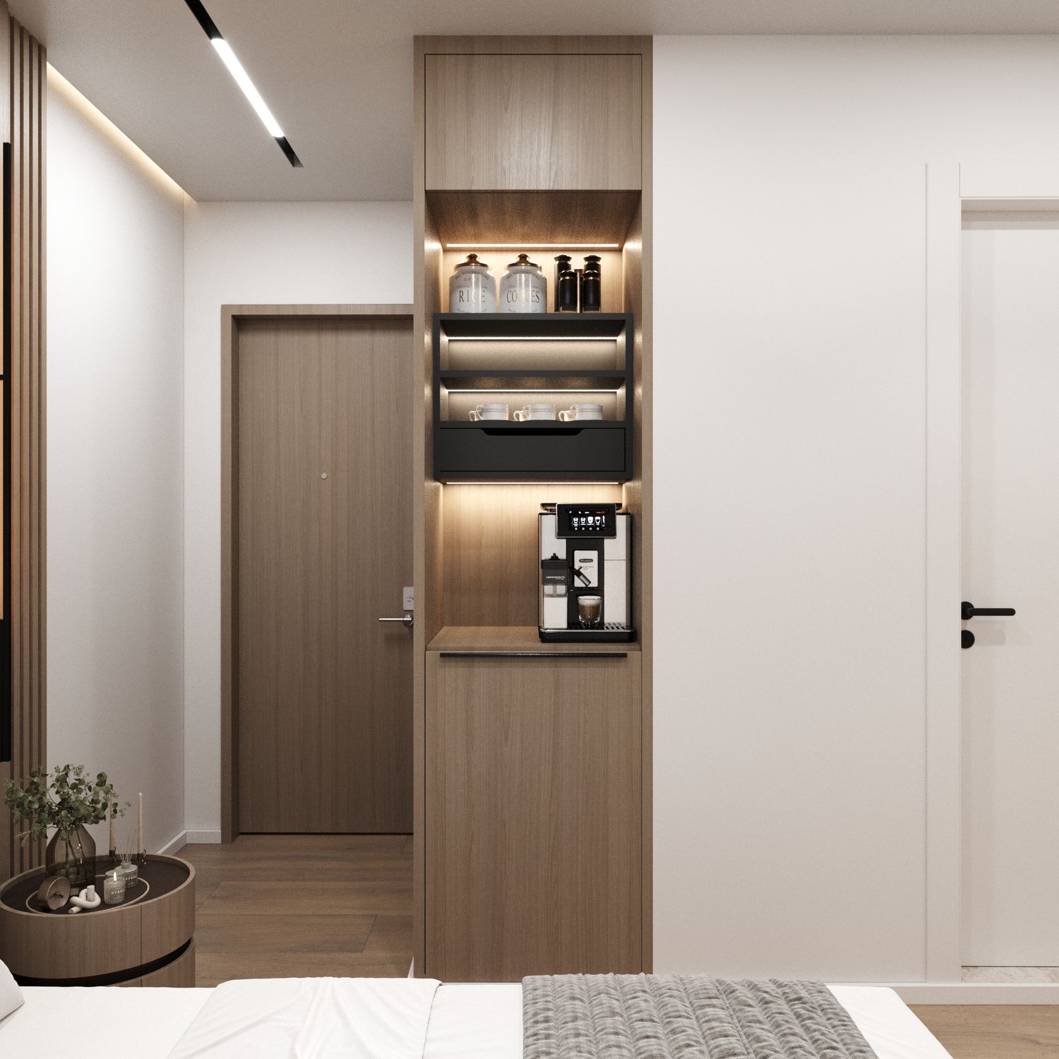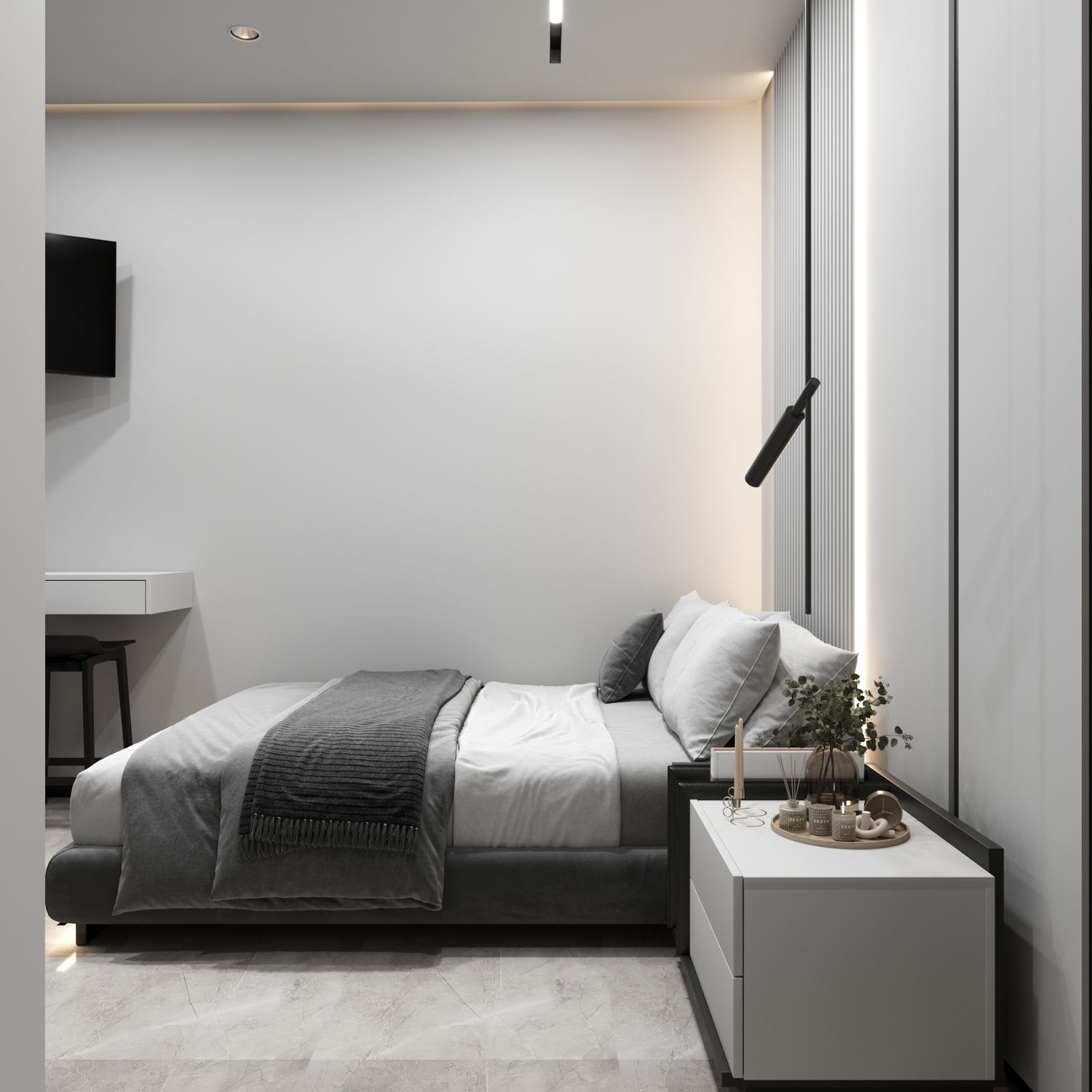 For the guest rooms, a separate cabinet unit has been designed to conceal the mini fridge and the safe. In addition, the bedside tables were treated as separate furniture pieces, and their designs were developed by selecting ready-to-purchase products. Likewise, for the furniture elements planned for custom fabrication, the design work has been completed and fully coordinated so that they can be applied according to the selected design alternative.