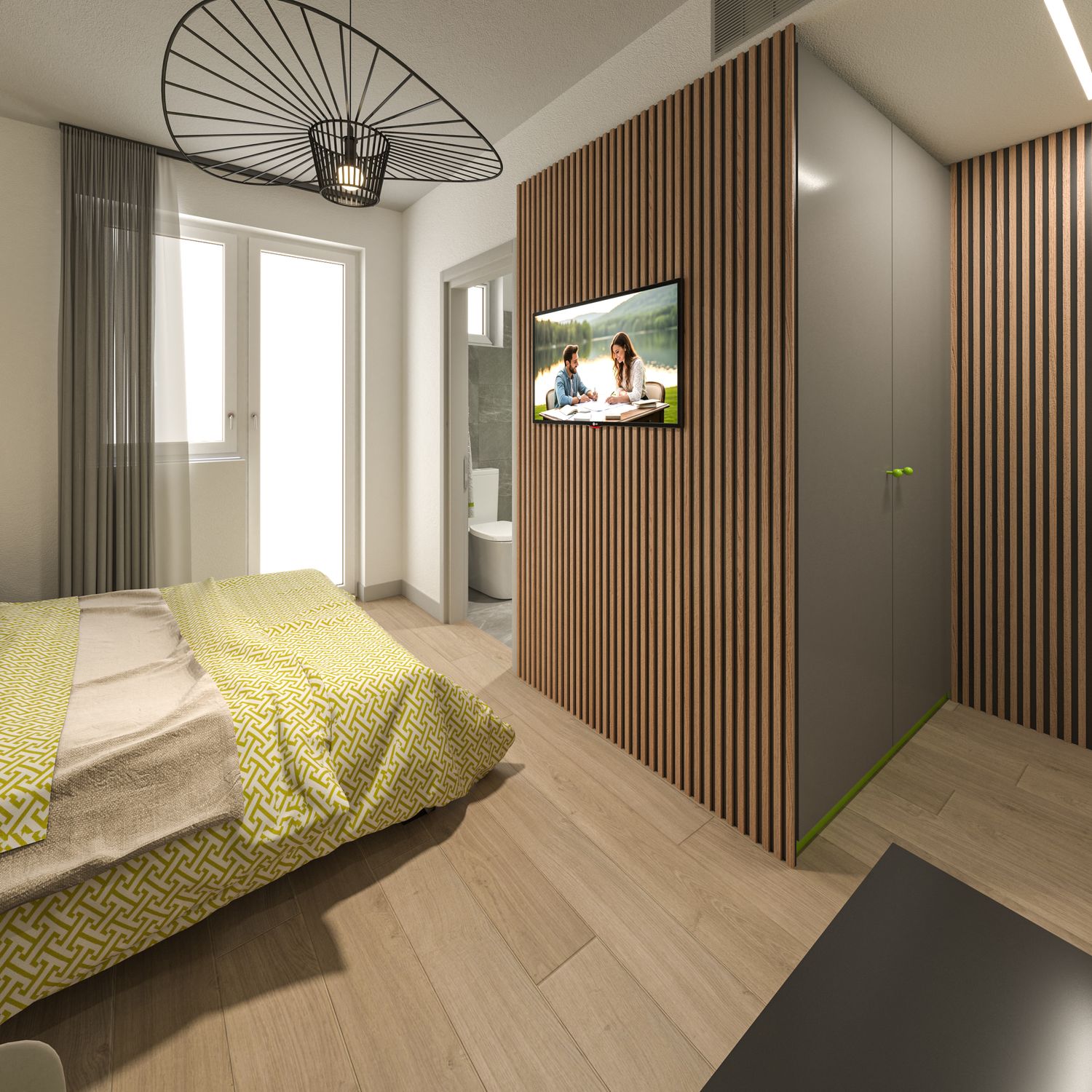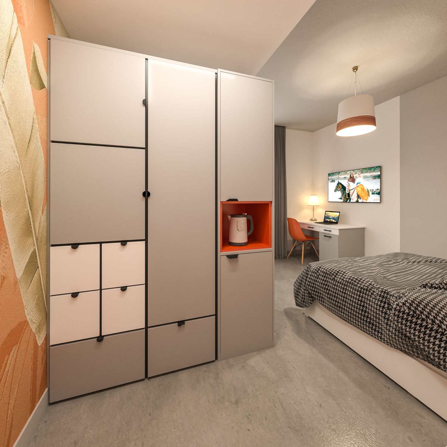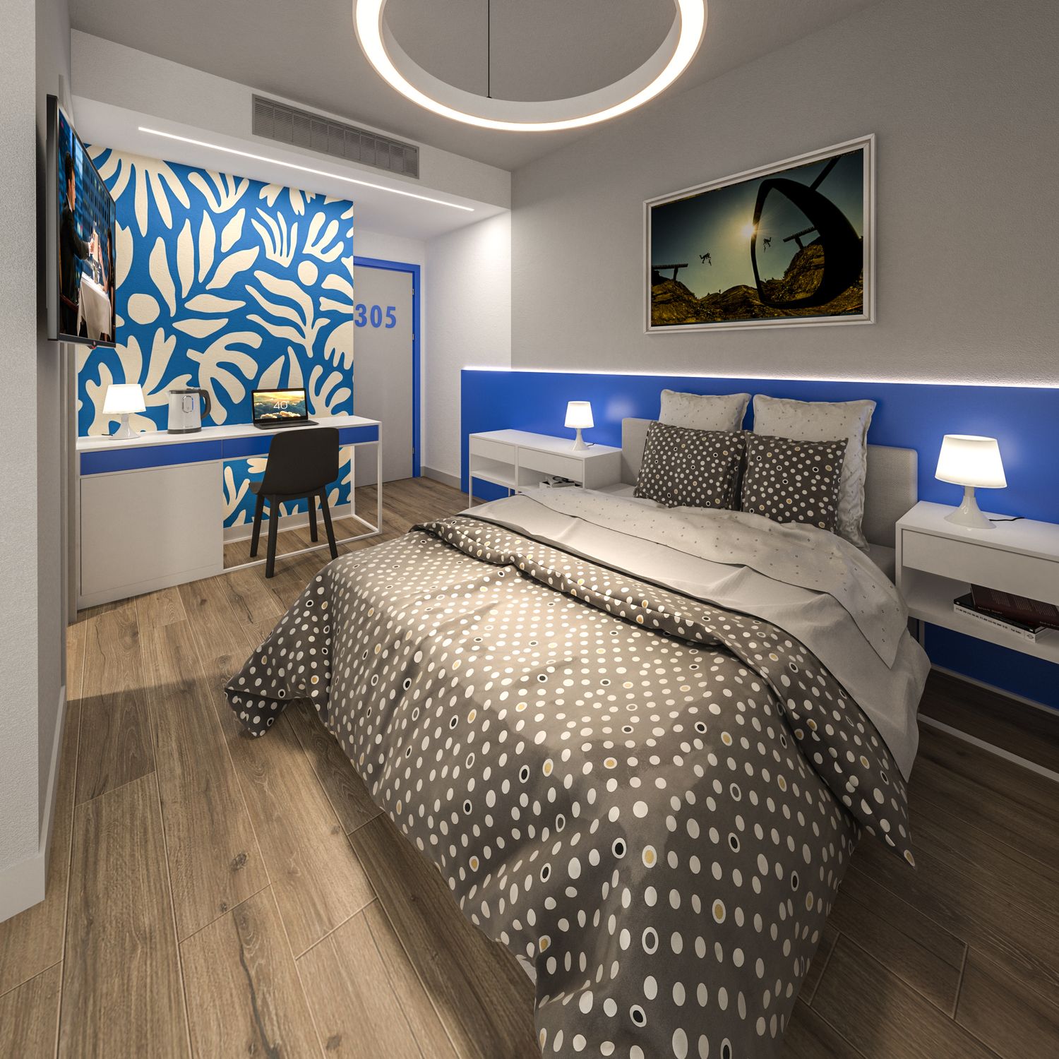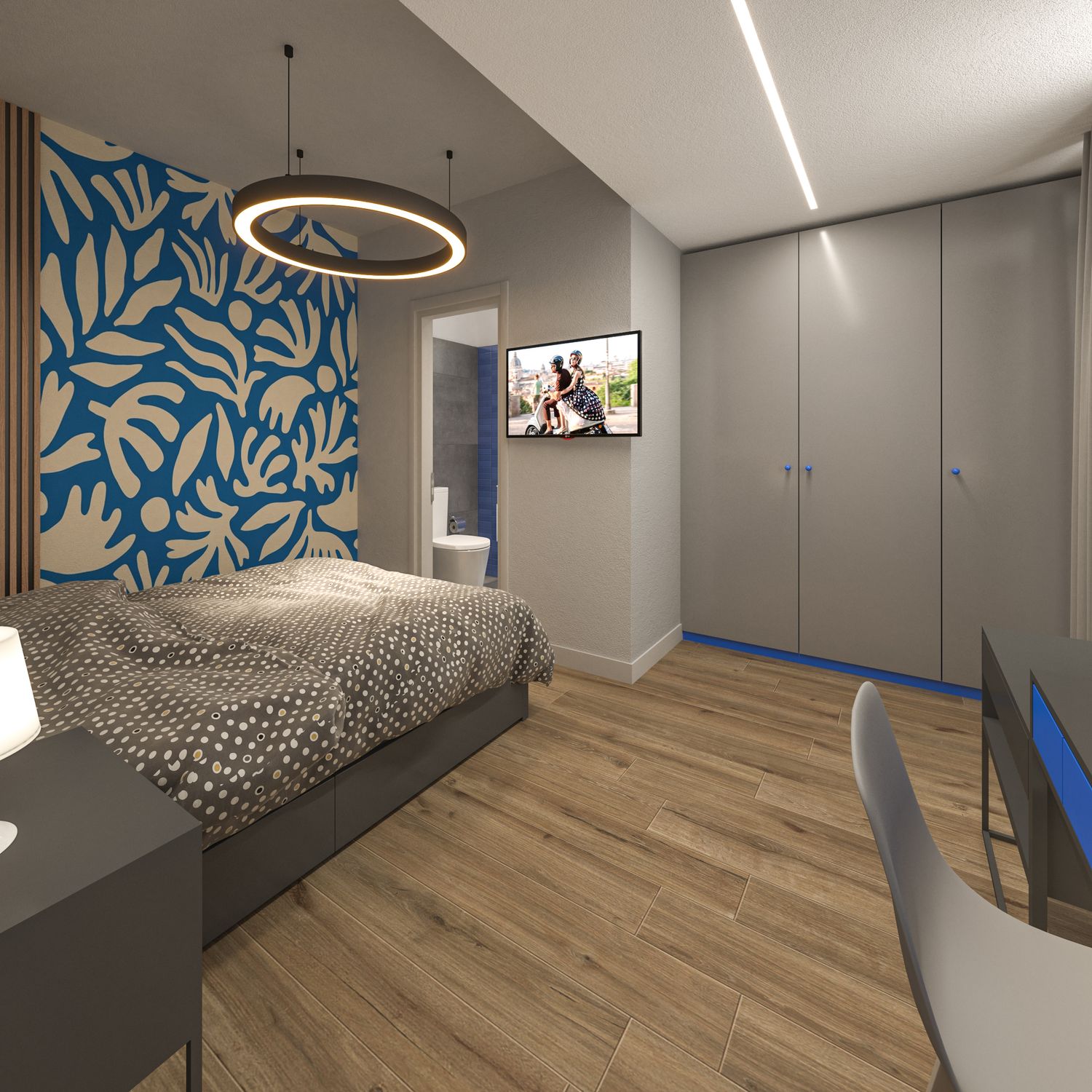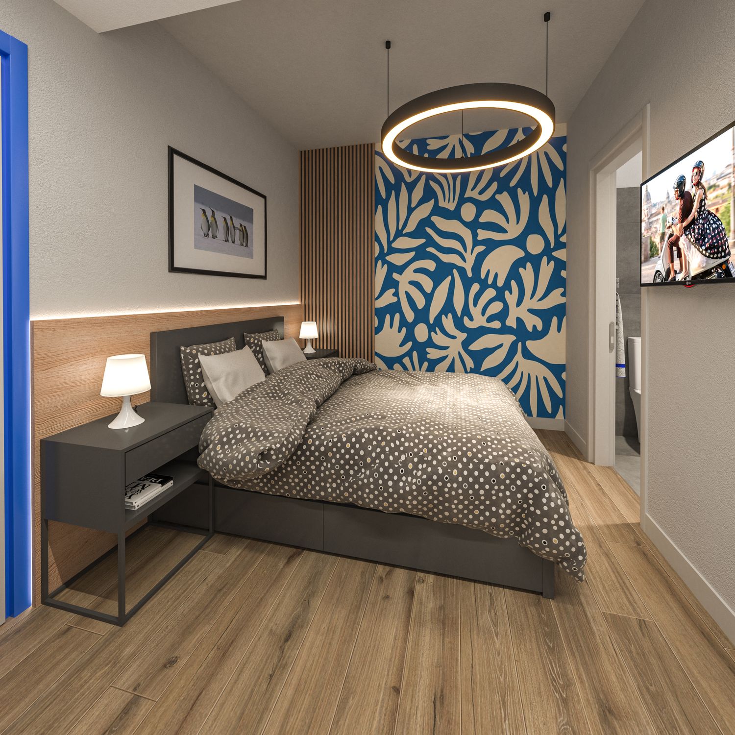 - The "Smart Column": A multifunctional unit integrating a wardrobe, a technical compartment for the minibar (hidden yet ventilated), a built-in safe, and a colored open niche for the kettle.