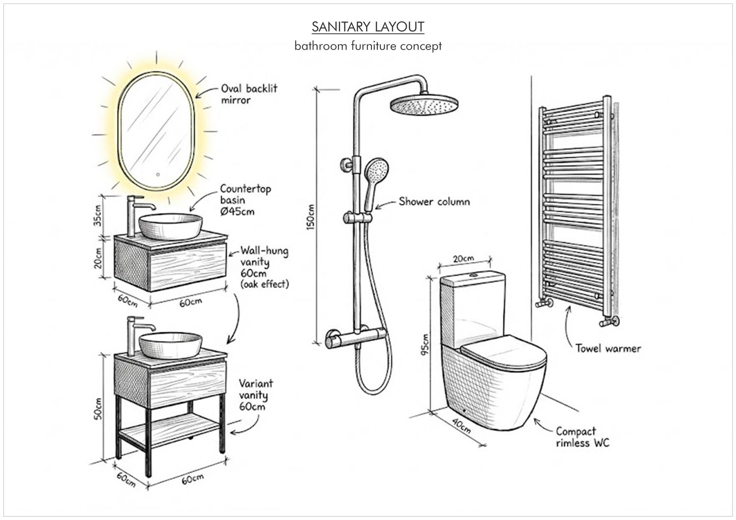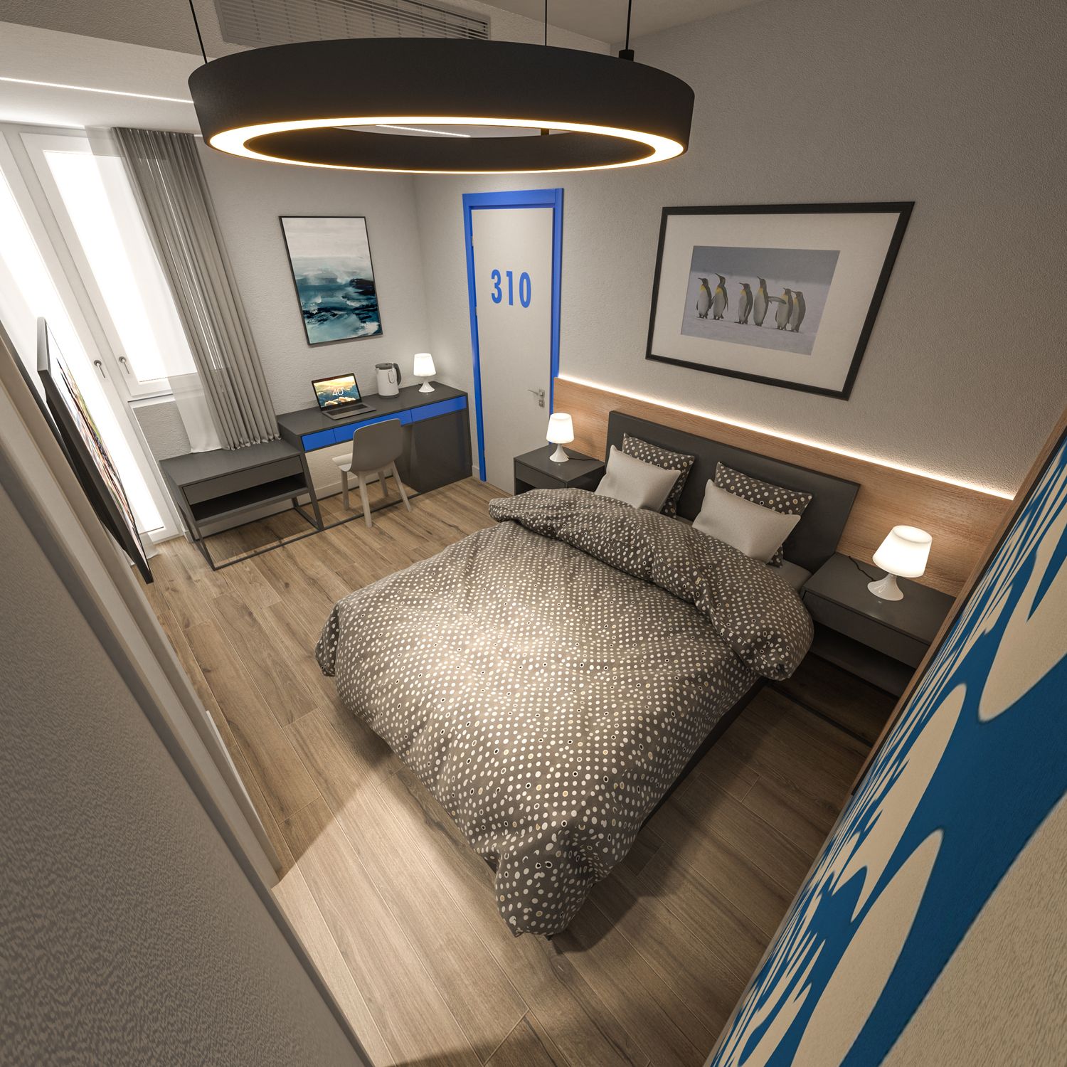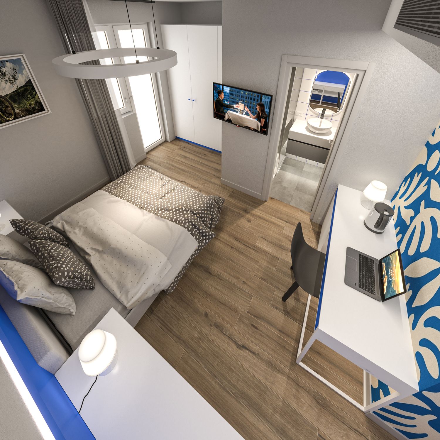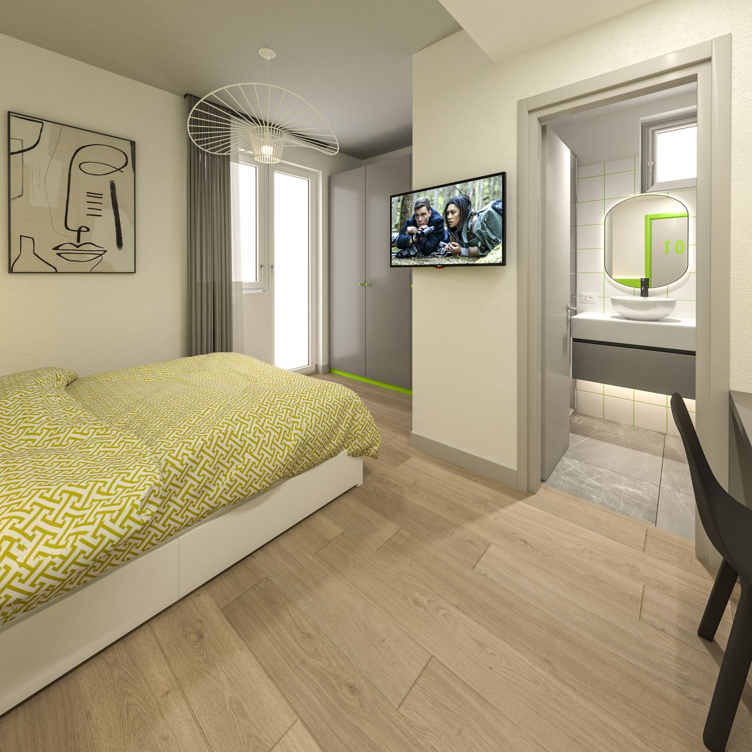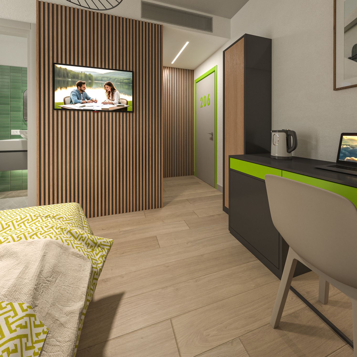 - The "Smart Column": A multifunctional unit integrating a wardrobe, a technical compartment for the minibar (hidden yet ventilated), a built-in safe, and a colored open niche for the kettle.