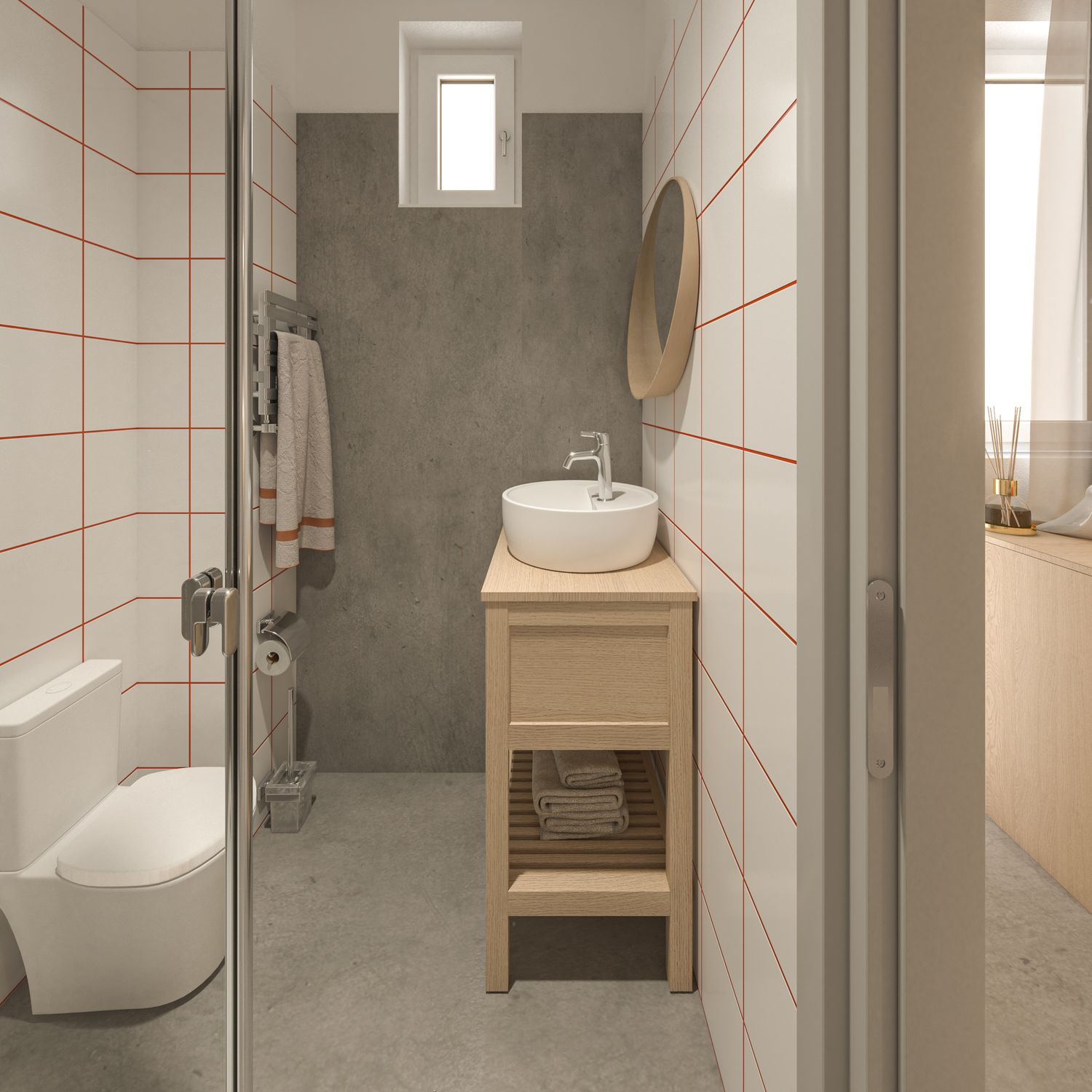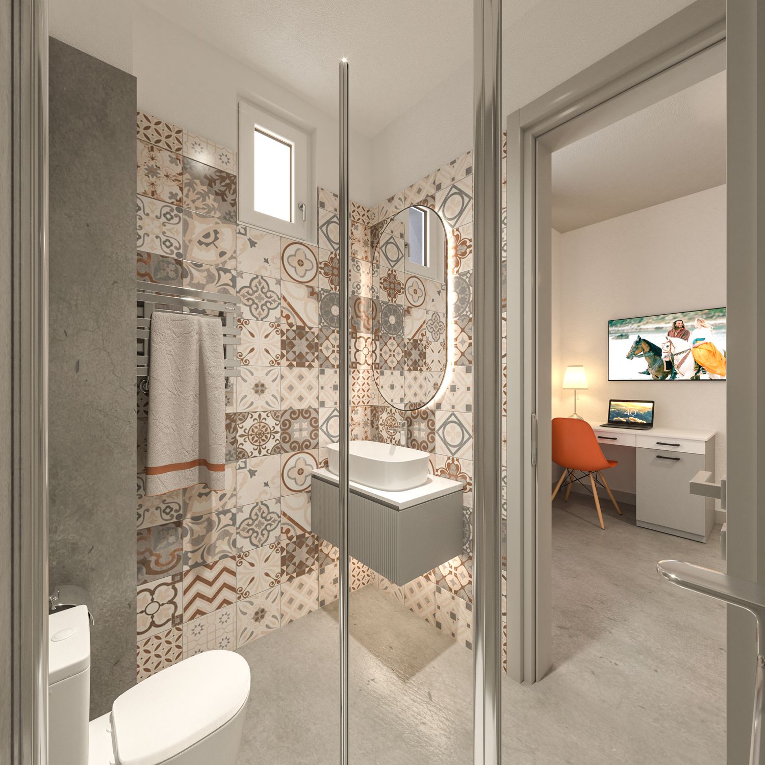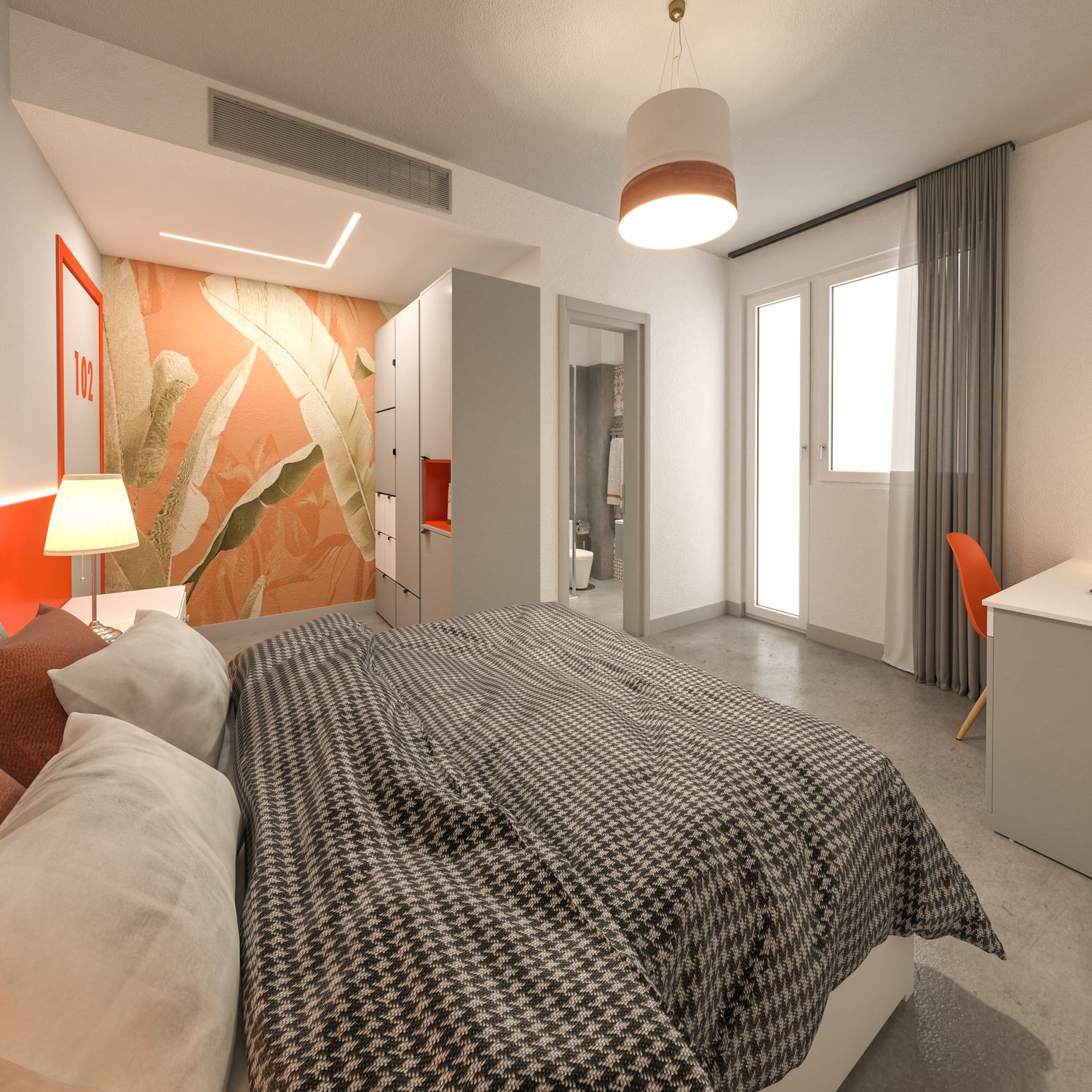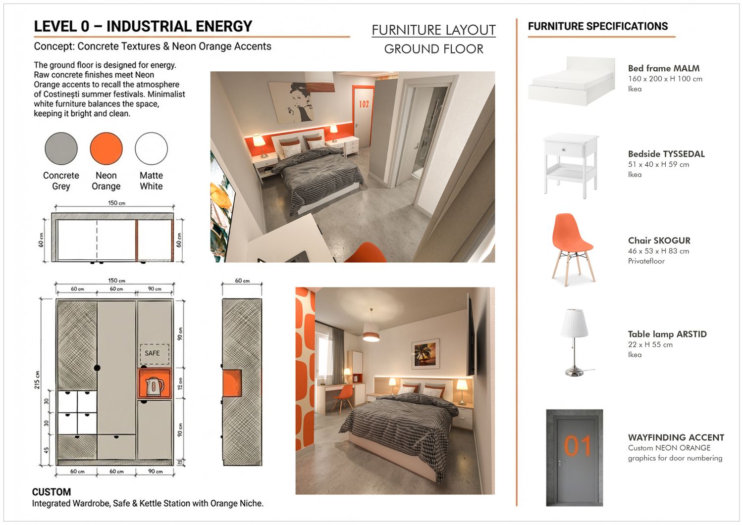 Ground Floor - INDUSTRIAL ENERGY: Inspired by urban concrete and solar energy. Raw finishes, Neon Orange details, and minimal white furniture for a fresh and durable look.