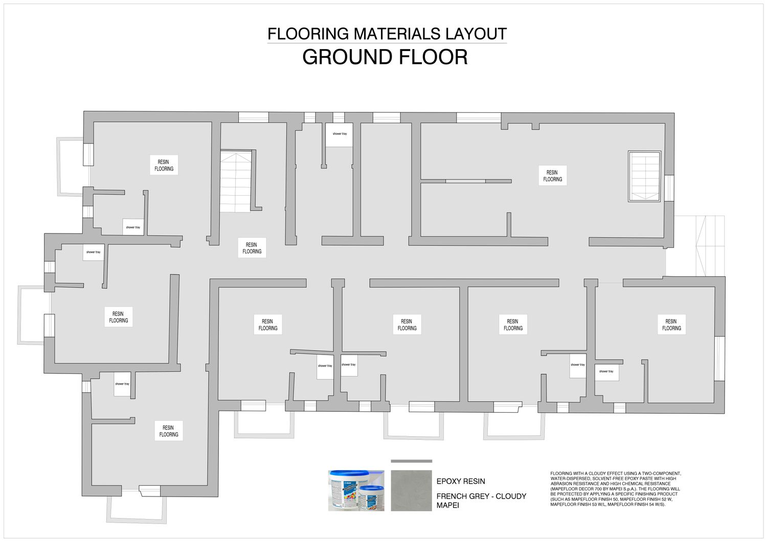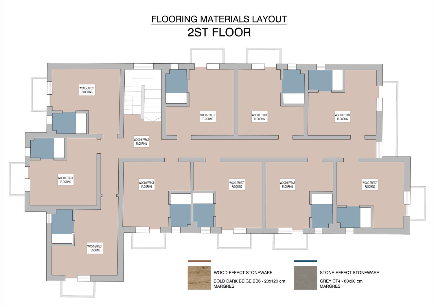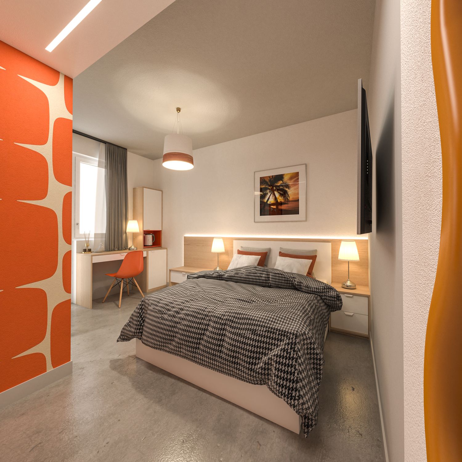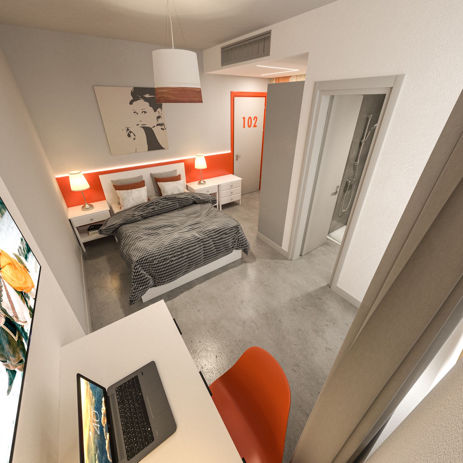 Ground Floor - INDUSTRIAL ENERGY: Inspired by urban concrete and solar energy. Raw finishes, Neon Orange details, and minimal white furniture for a fresh and durable look.