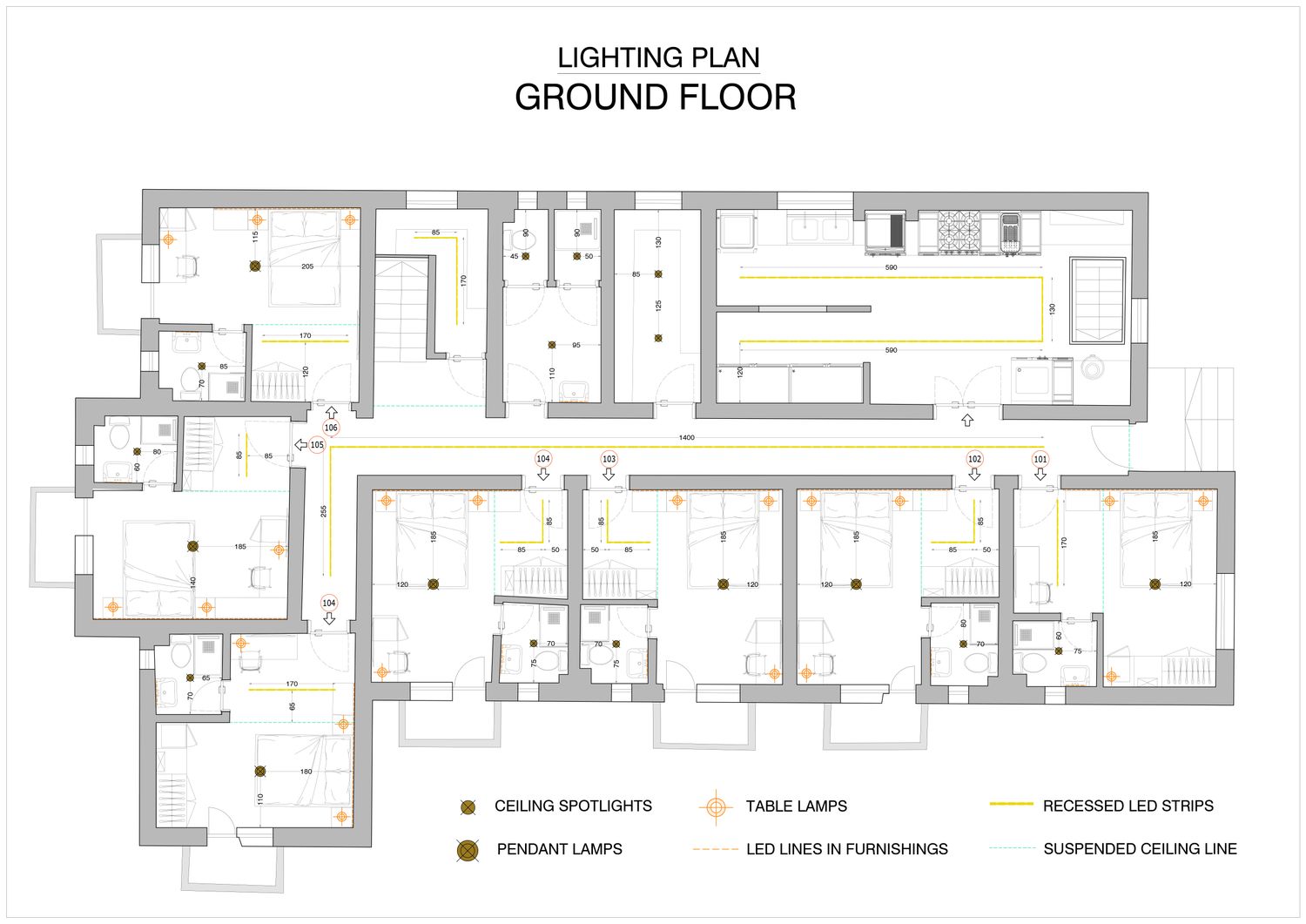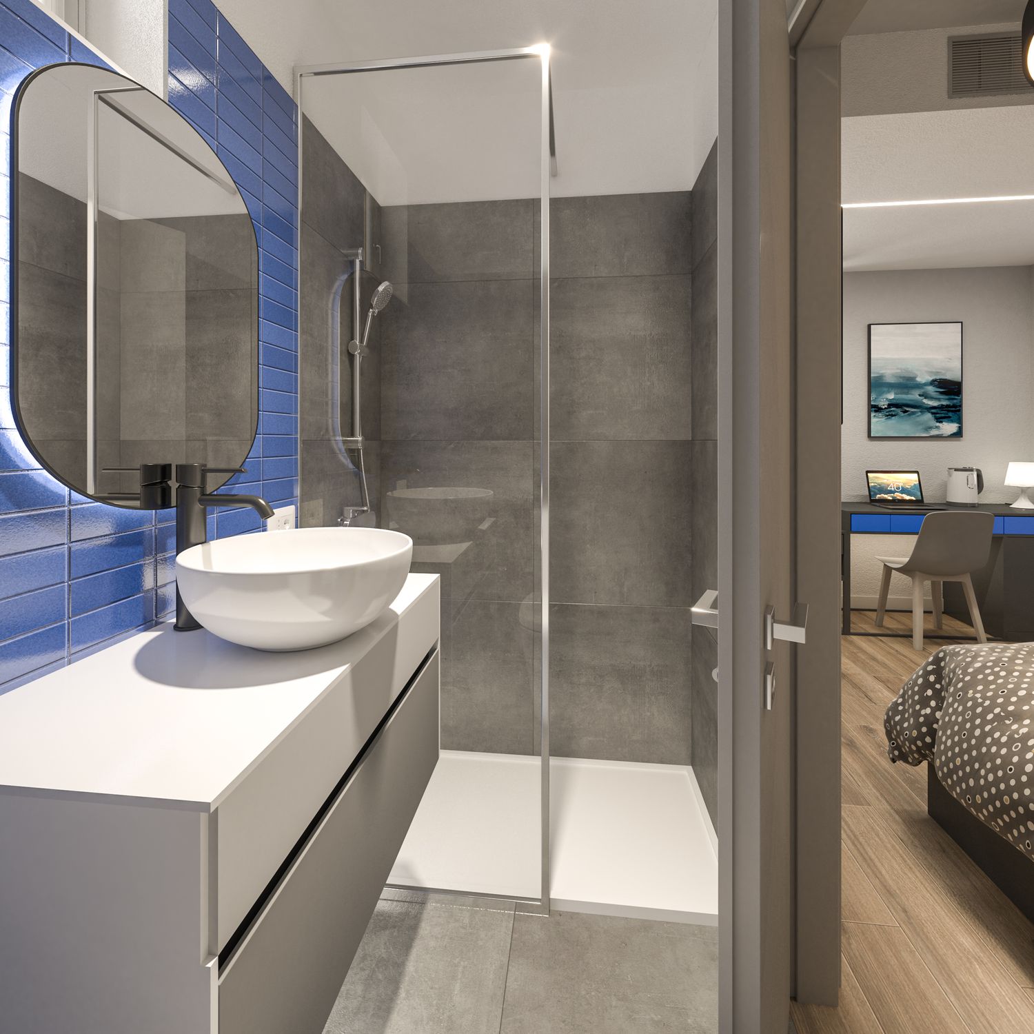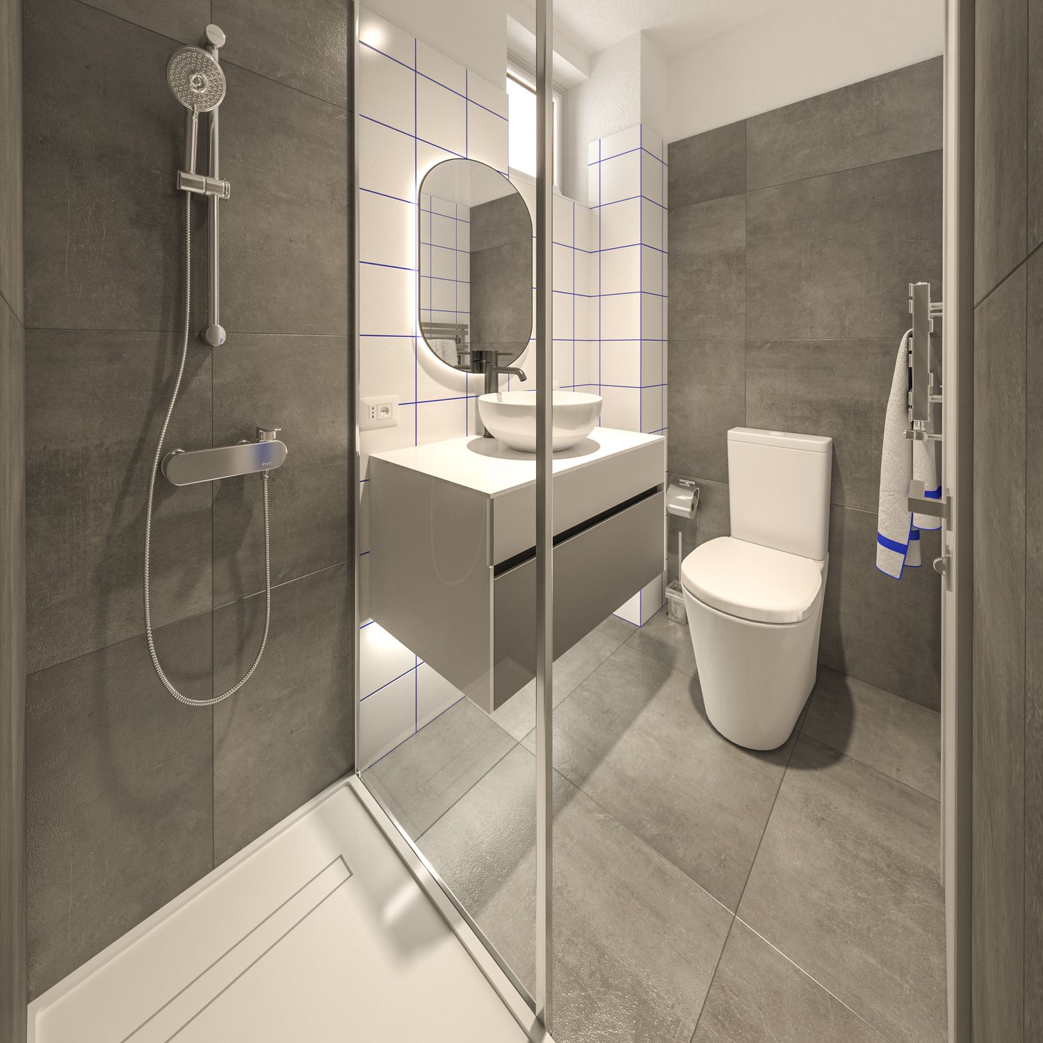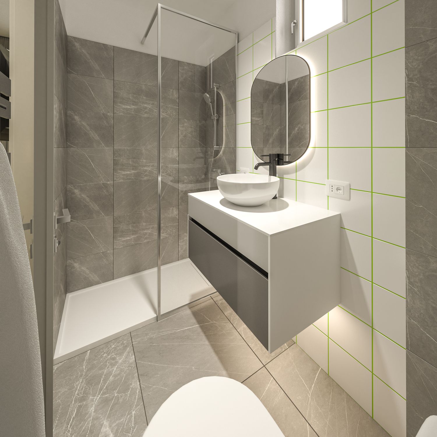 Ground Floor - INDUSTRIAL ENERGY: Inspired by urban concrete and solar energy. Raw finishes, Neon Orange details, and minimal white furniture for a fresh and durable look.