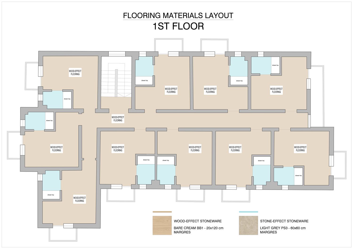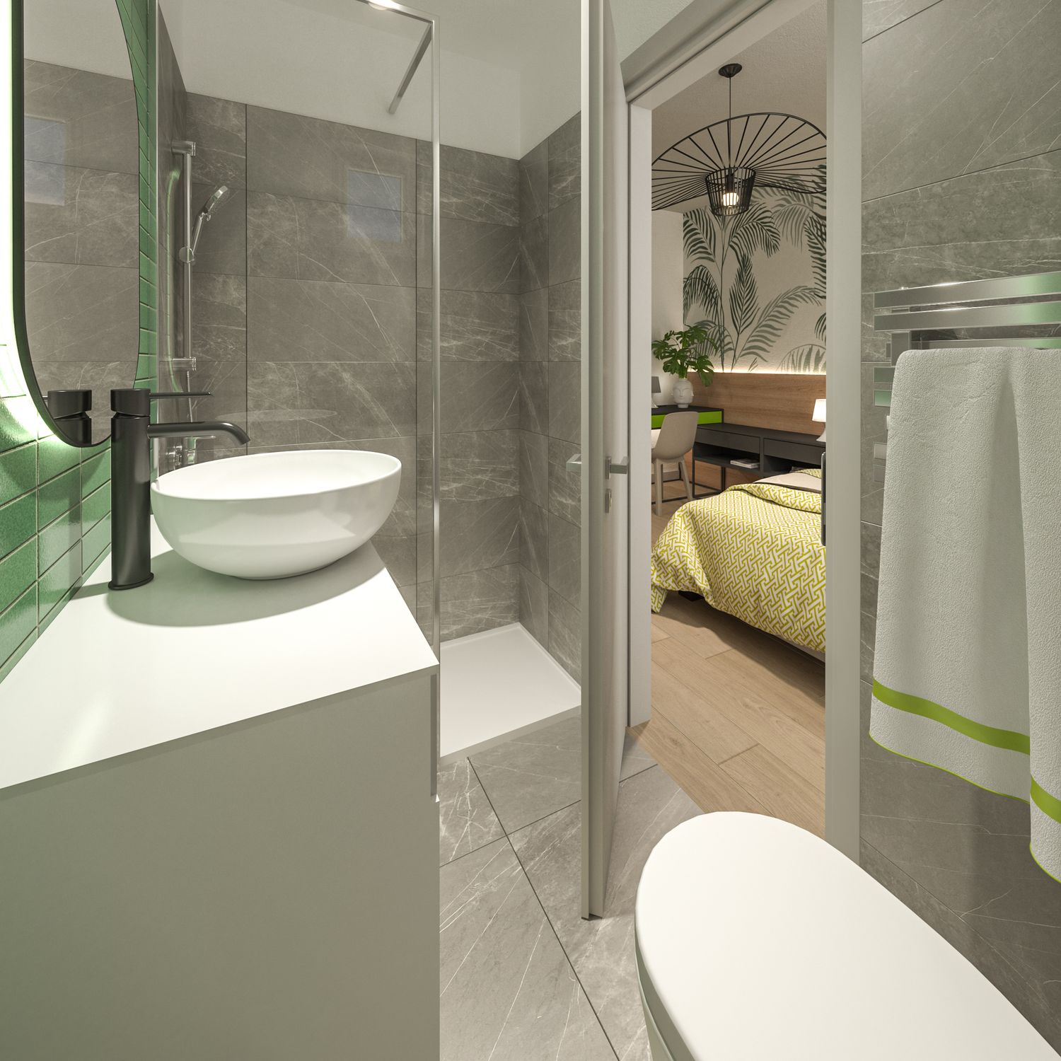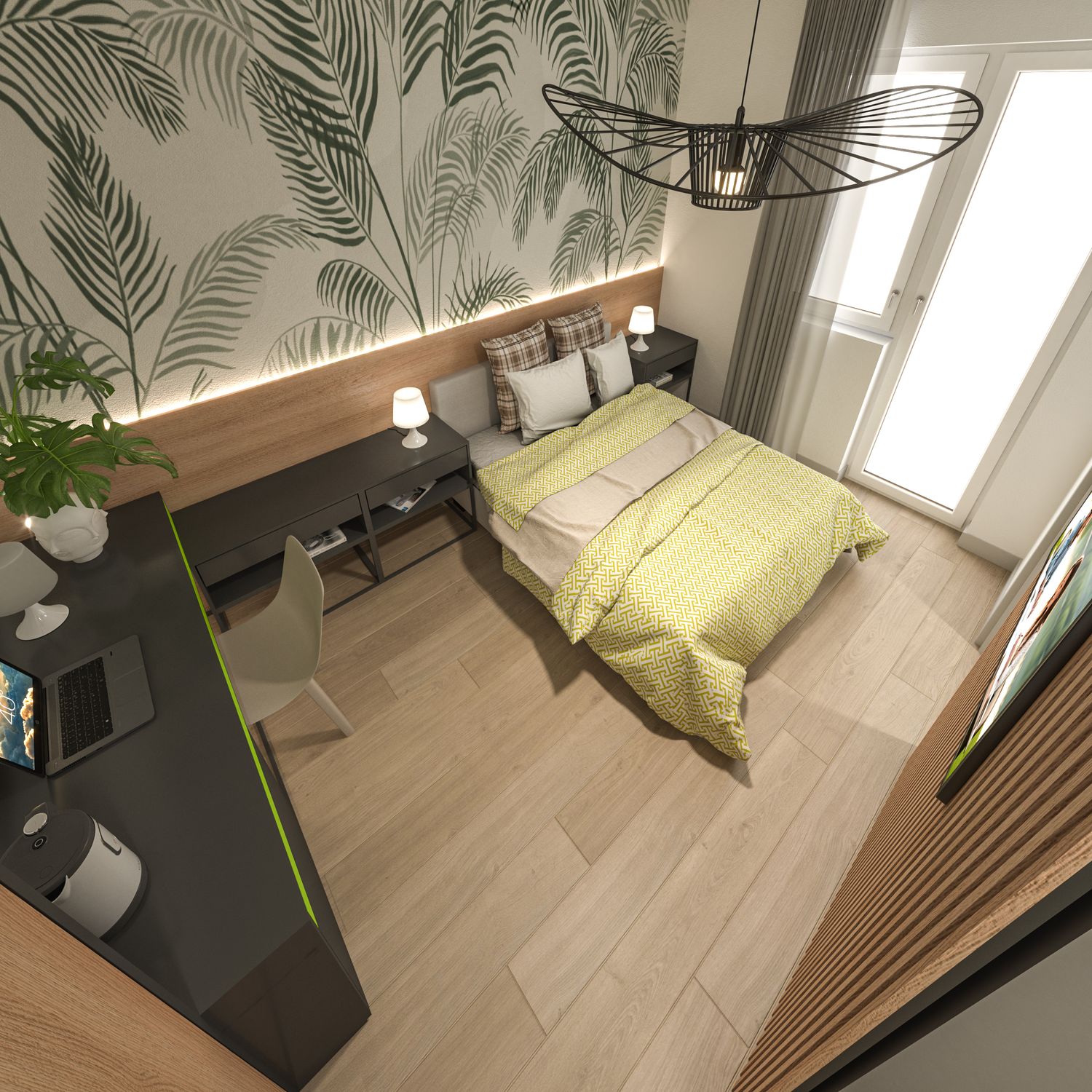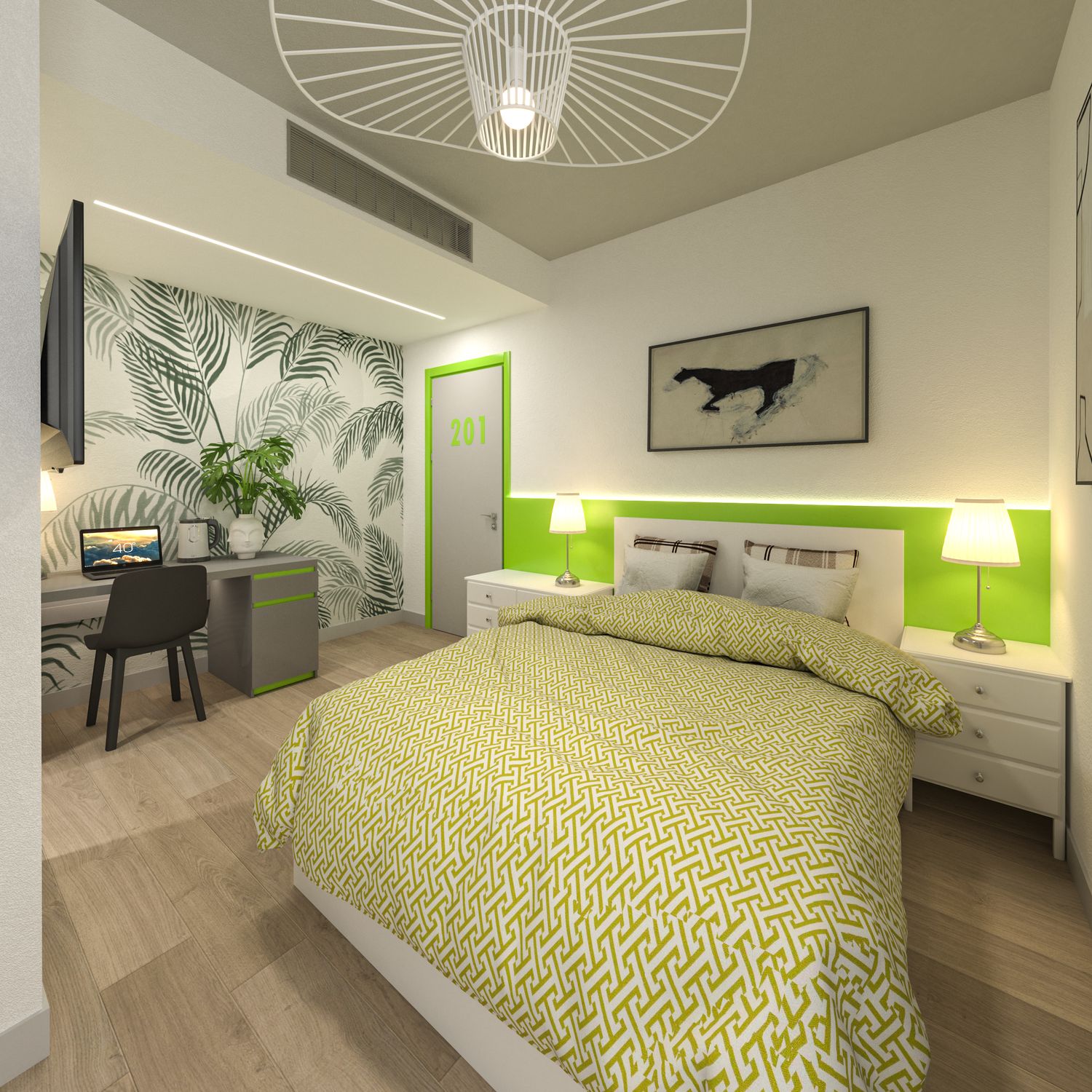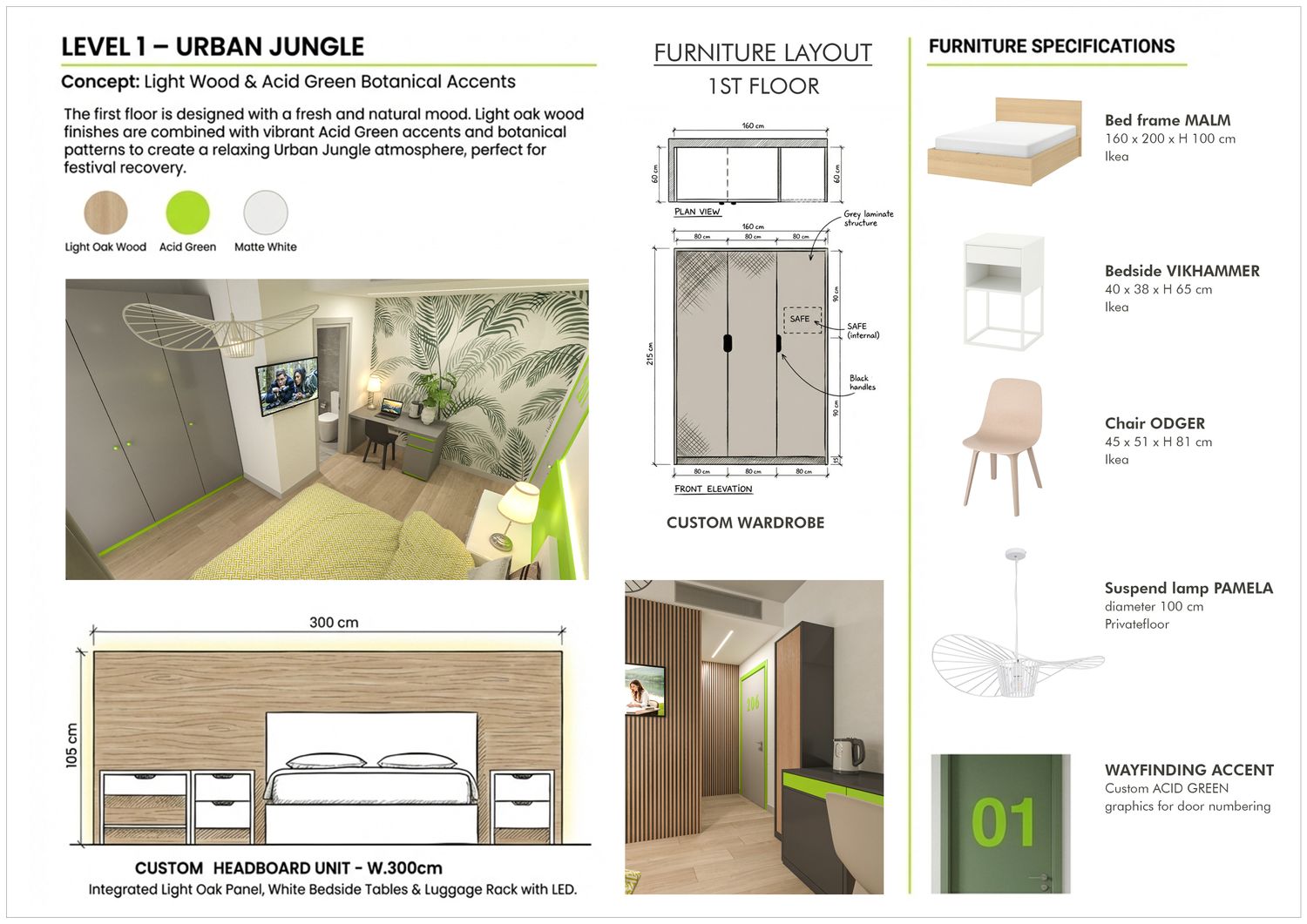 First Floor - URBAN JUNGLE: A relaxation oasis for "Chill-out". Light woods (Oak), Acid Green accents, and botanical textures to regenerate.