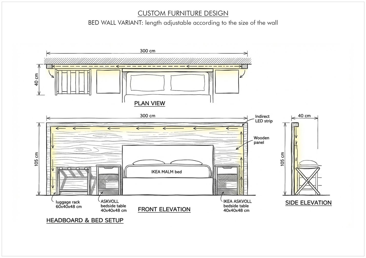 BUDGET & FEASIBILITY The design uses an "IKEA HACK" strategy: standardized economic bases elevated by custom details.