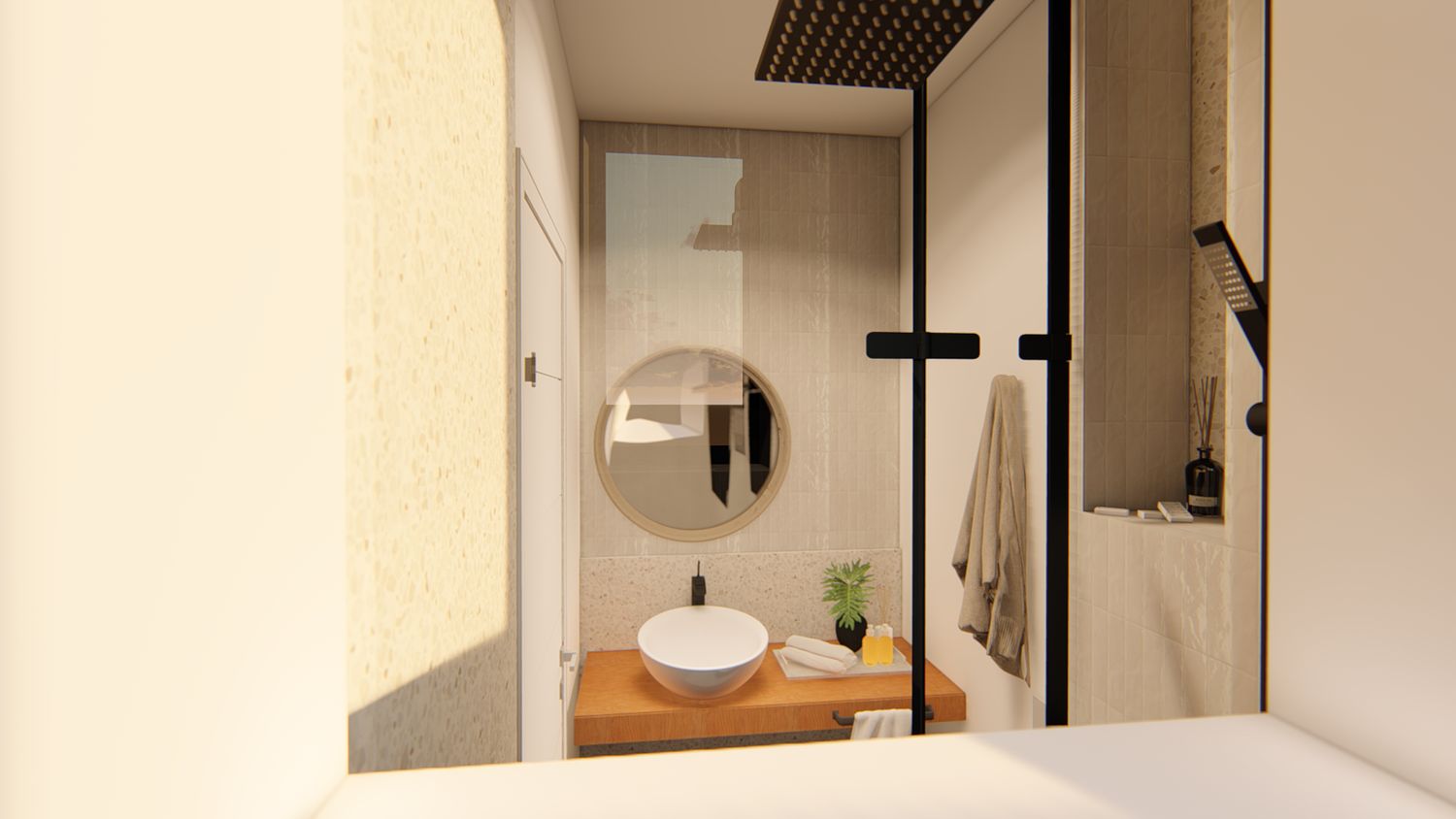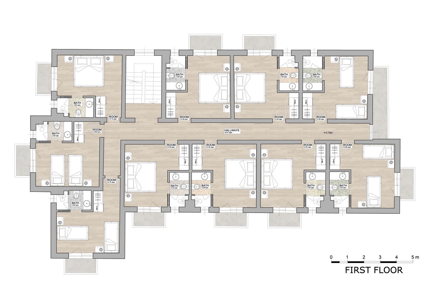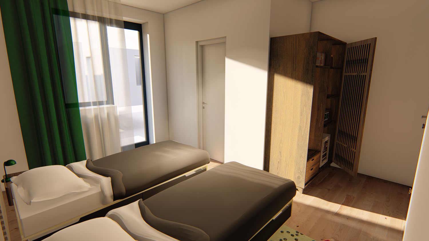 Our project proposes a renovation of the rooms, including bathroom modifications, designed to feature a comfortable shower, toilet, and sink with a large countertop. Each room will have the option of a different configuration depending on your needs: double with a double bed, double with two single beds, or single with a queen-size bed.