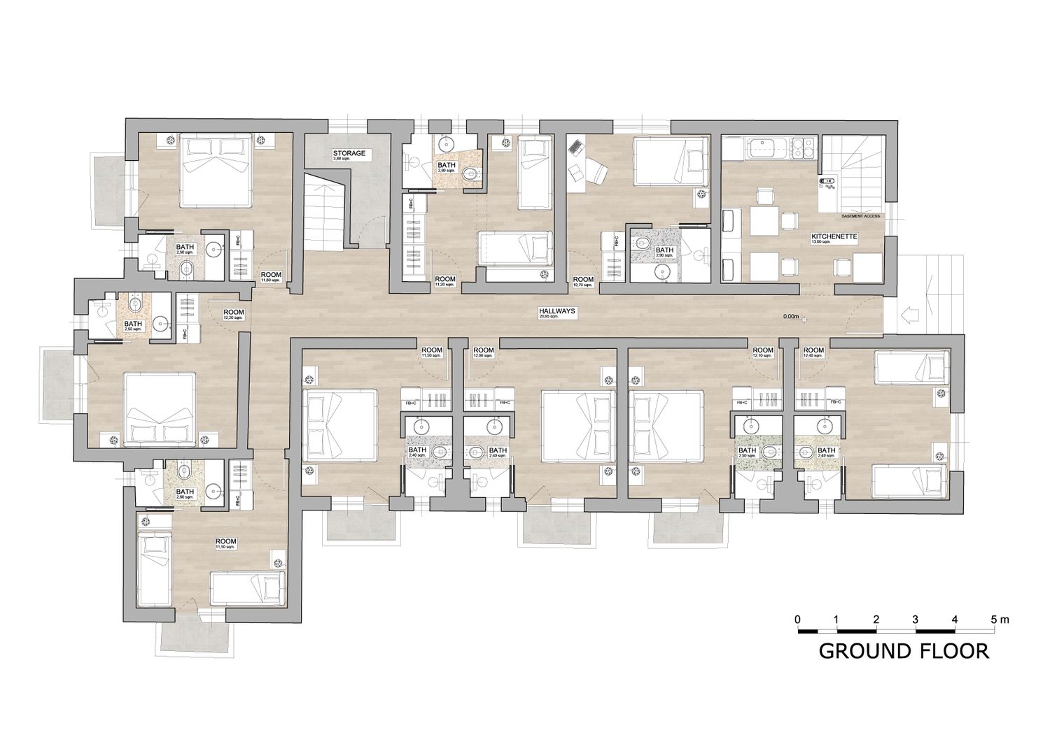 To obtain 29 rooms, as indicated in the Q&A section of the platform (there are currently 27), we will utilize a storage space on the ground floor, moving the pantry to the basement, and downsize the current kitchen, creating a smaller kitchenette with a hideaway kitchen and a small breakfast area.