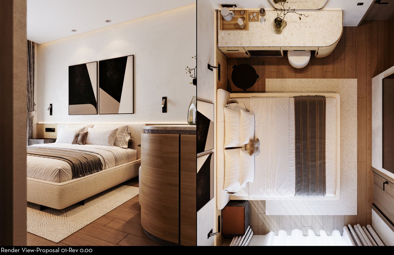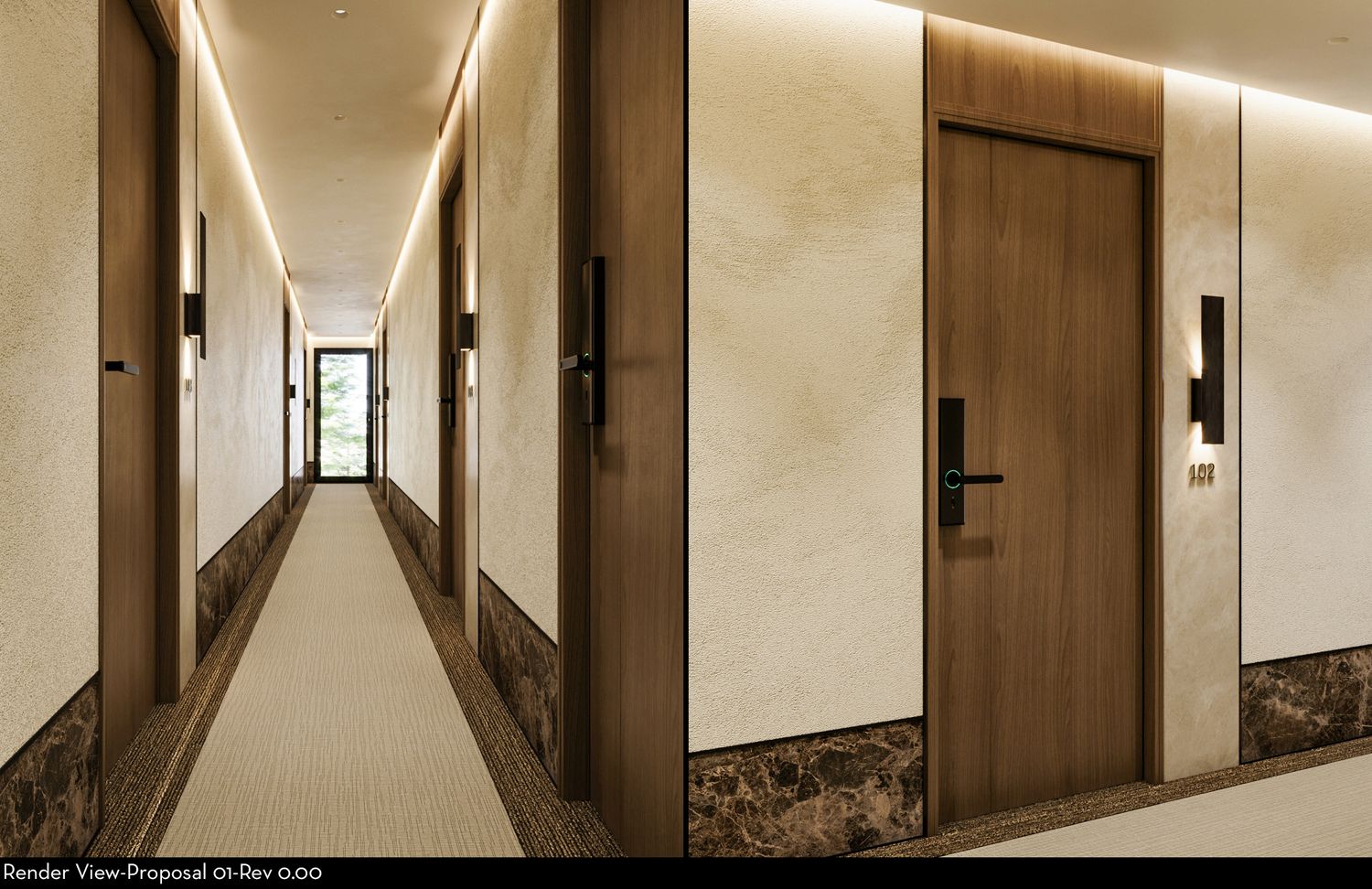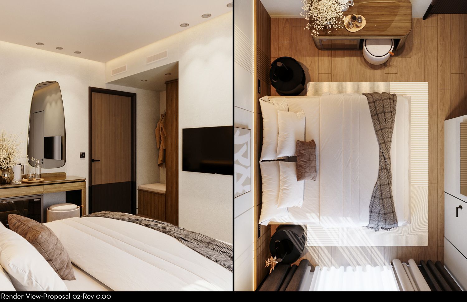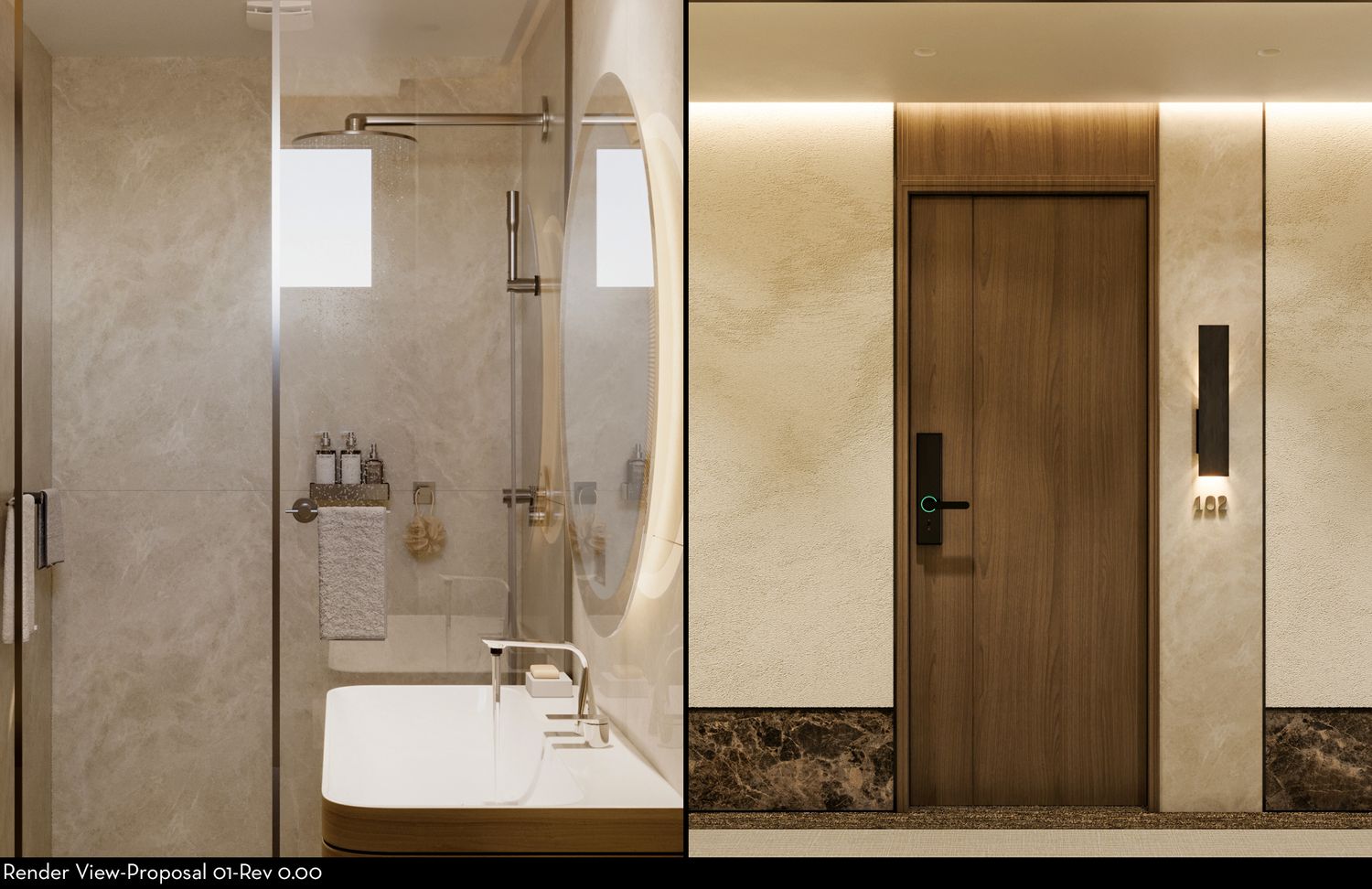 Two comprehensive proposals have been developed for the modernization project, transforming the guest house into a luxurious and modern space, specifically tailored for young travelers and festival enthusiasts. The design maximizes efficiency by allowing for bulk purchases, as most elements are replicable across rooms.