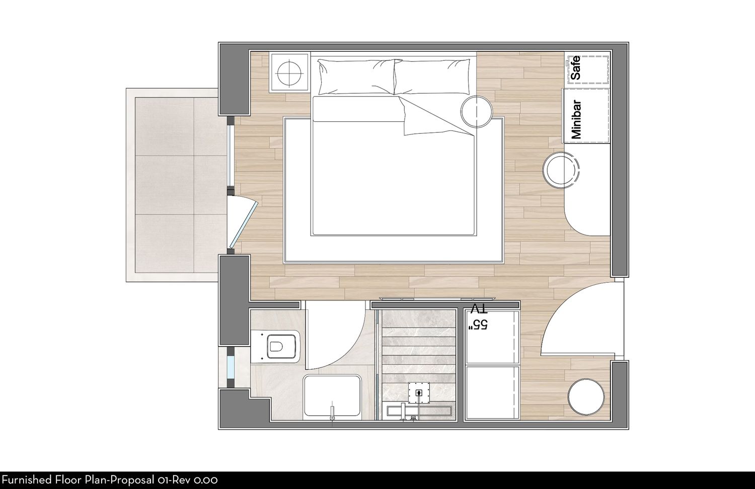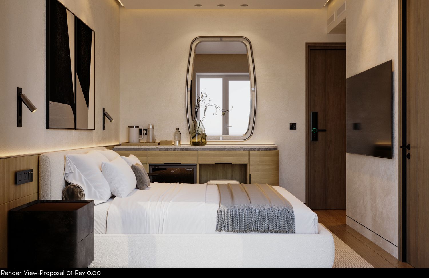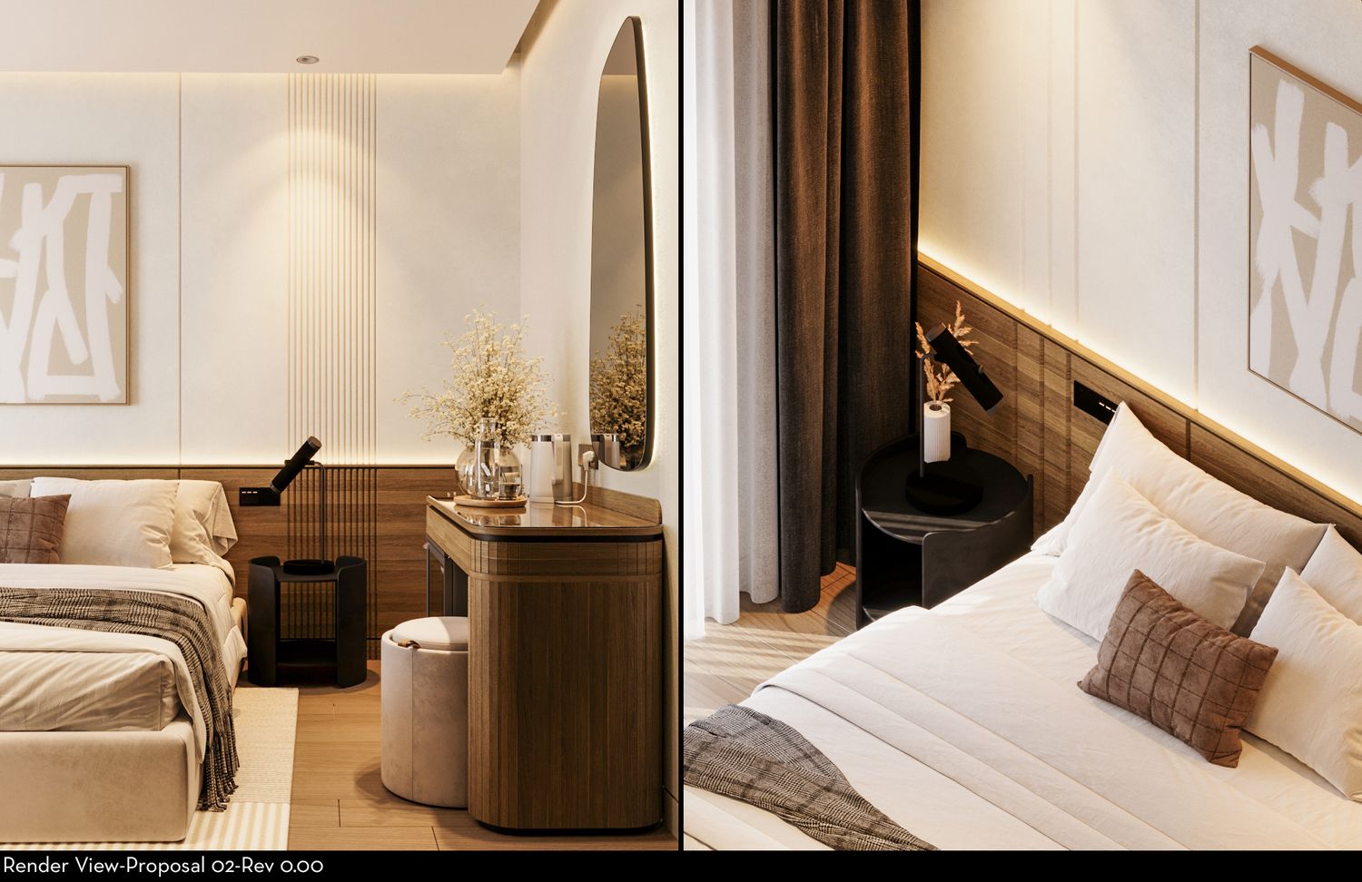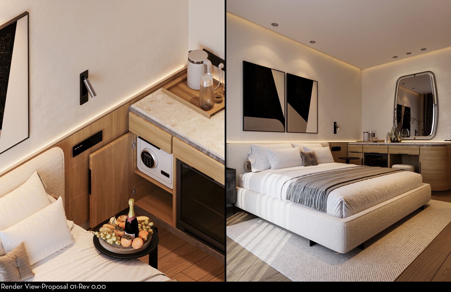The design meticulously accounts for all hotel room requirements, including power saver card placement, optimal lighting accessibility and circuitry, and strategically placed mirrors for convenience in the bathroom. Furthermore, flexible bed configurations are facilitated by full-wall headboards, a safe, minibar, and kettle for added comfort.