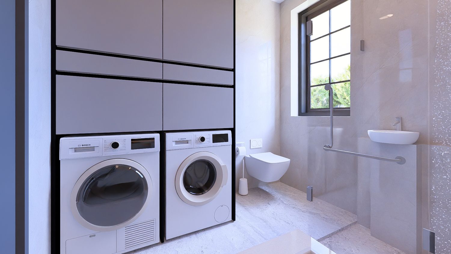 zona lavanderia con lavatrice e asciugatrice affiancate, non sovrapposte