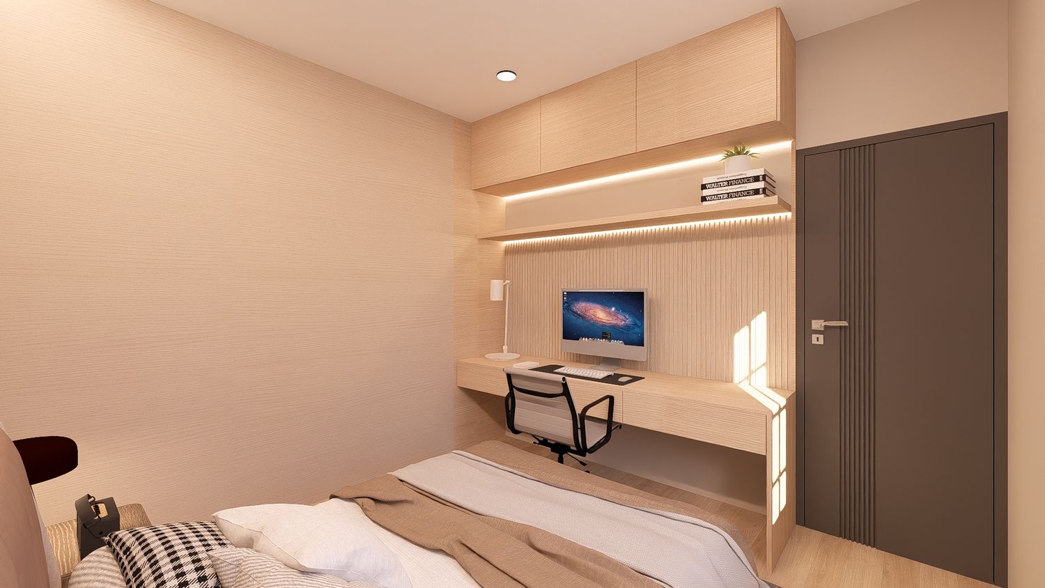 Seconda camera con letto 140×200 cm e postazione computer/TV integrata, come richiesto.