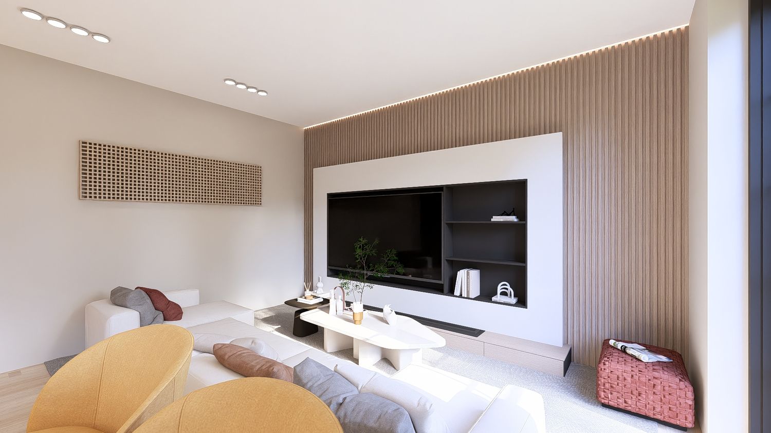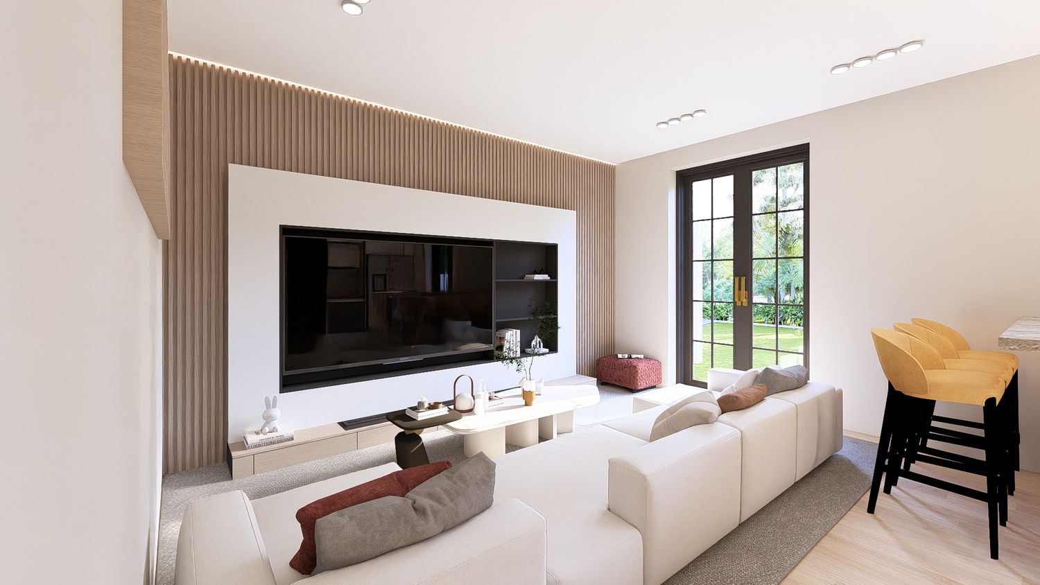 Il soggiorno è stato configurato per ospitare agevolmente la Sua TV 183,7×100 cm e un divano con penisola, rispettando pienamente le Sue preferenze estetiche e funzionali.
