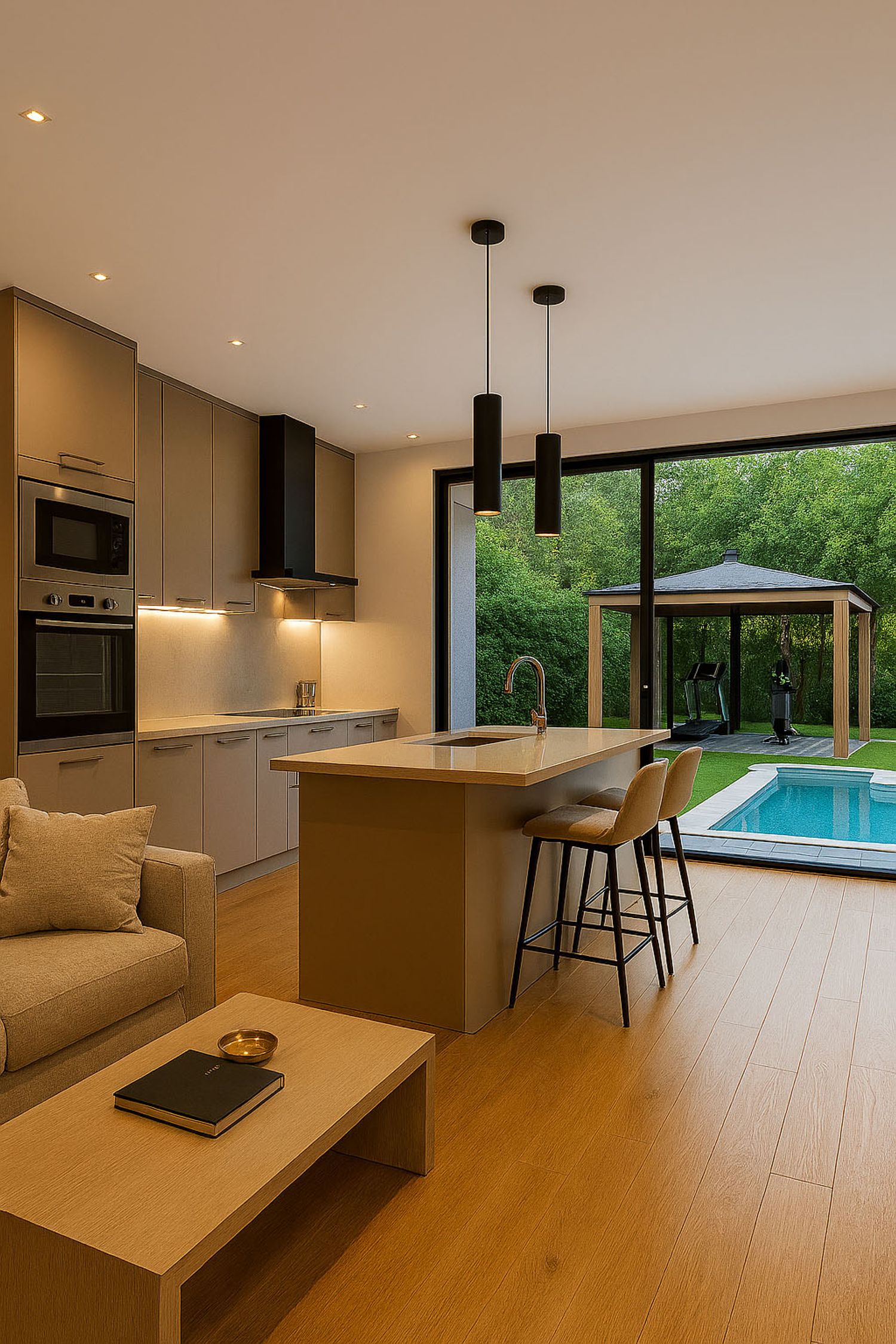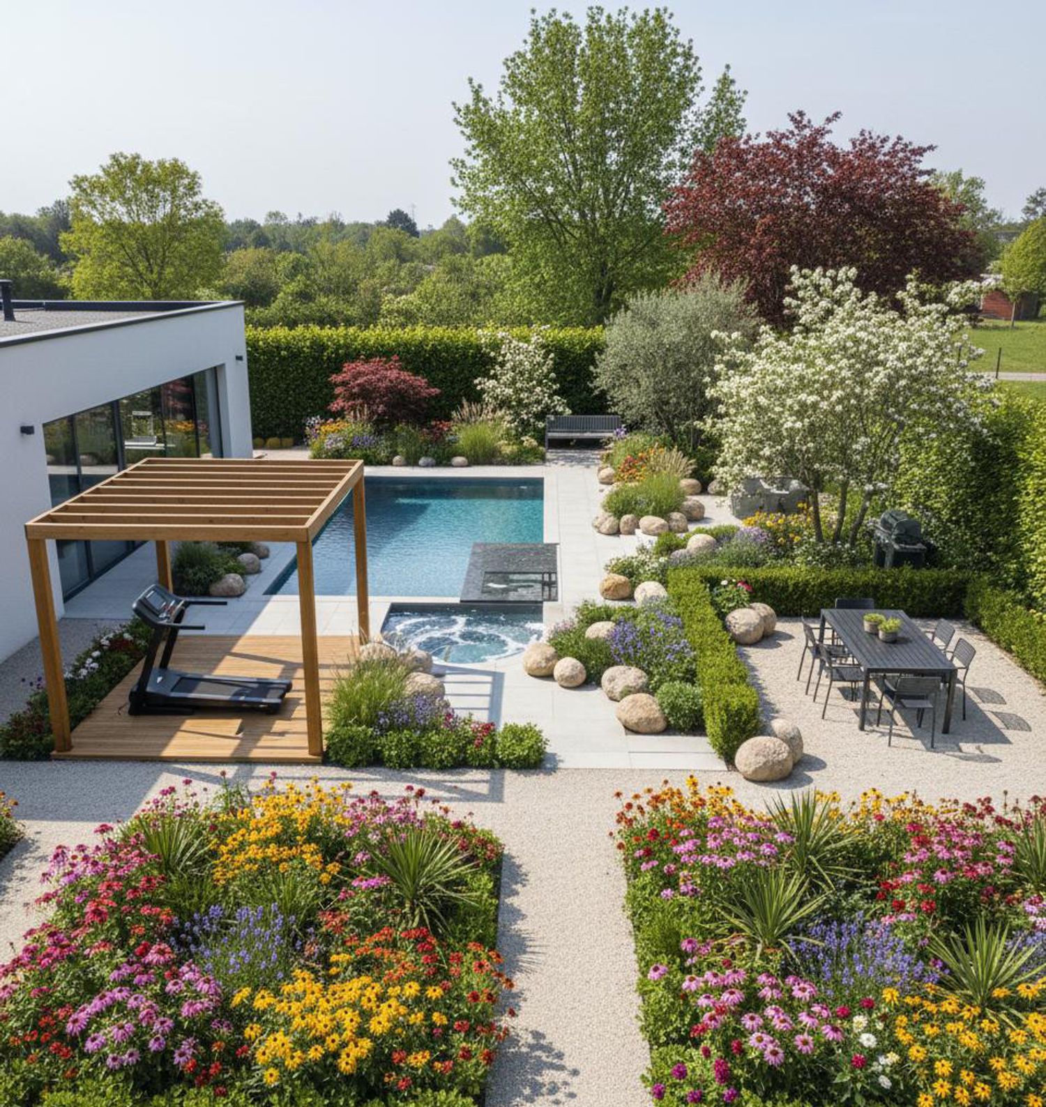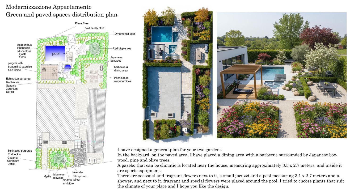 In the backyard, on the paved area, I have placed a dining area with a barbecue surrounded by Japanese boxwood, pine and olive trees.
