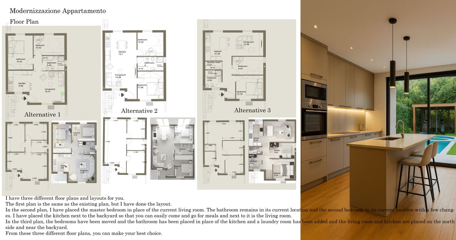 In the third plan, the bedrooms have been moved and the bathroom has been placed in place of the kitchen and a laundry room has been added and the living room and kitchen are placed on the north side and near the backyard.