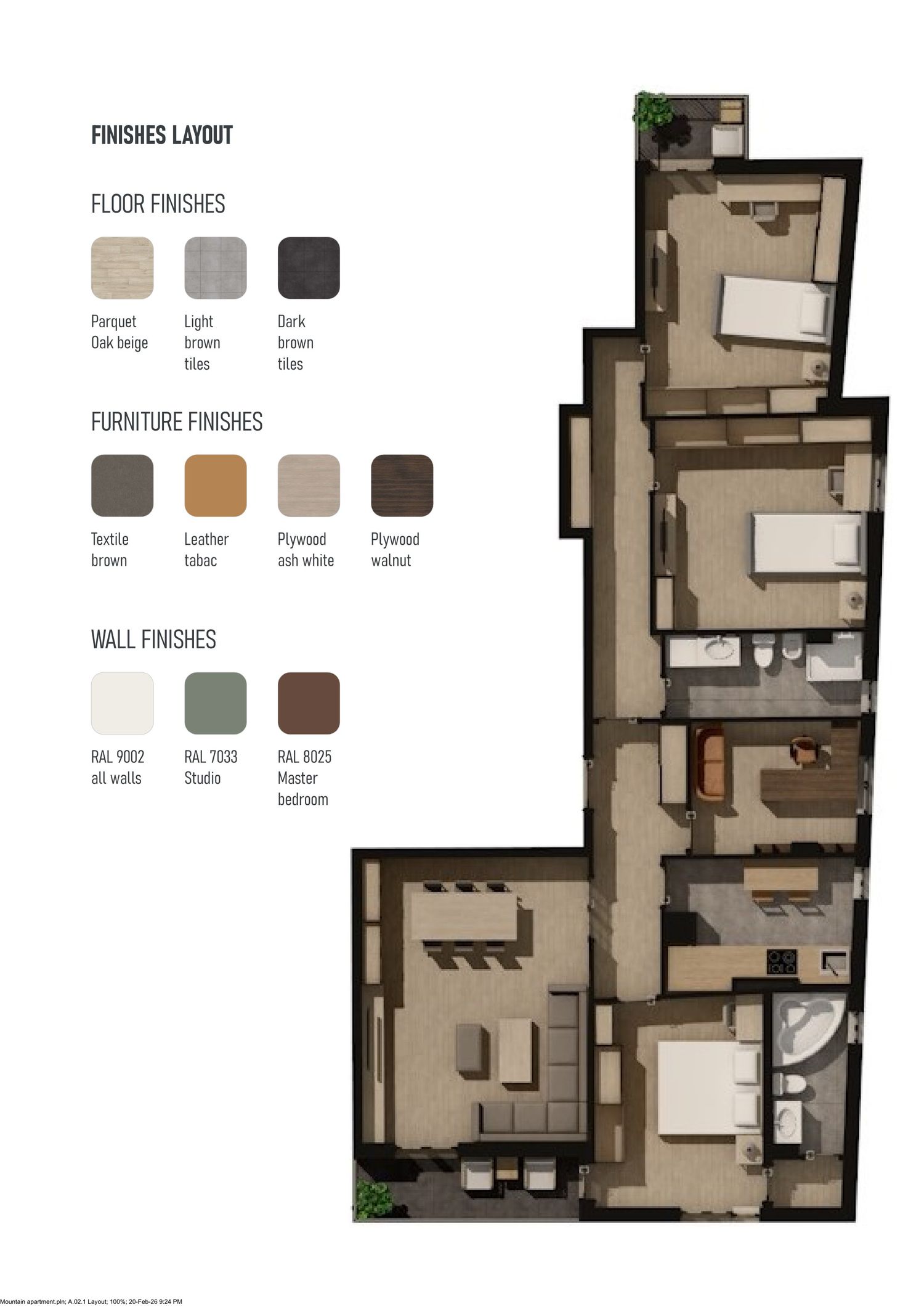 The floor is parquet with soft light colors, and all interior tiles are pastel light brown, and for the exterior, pastel dark brown.