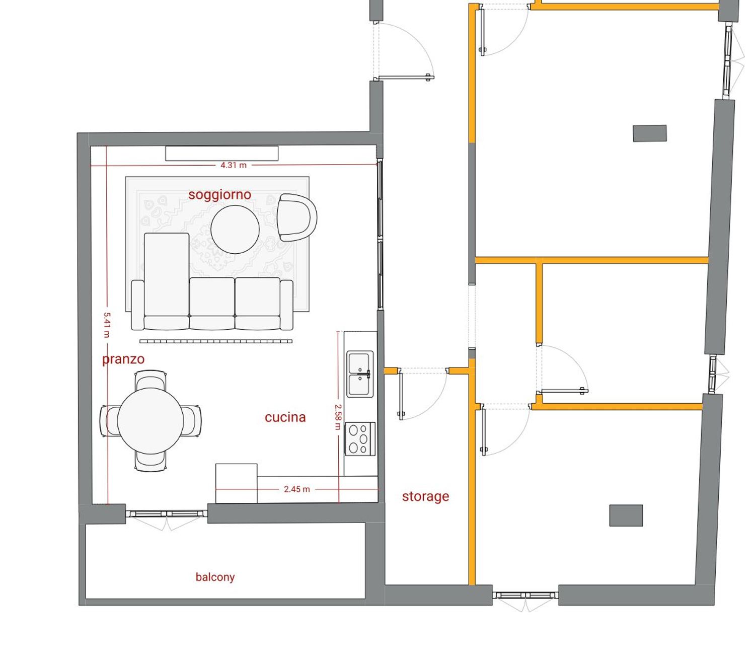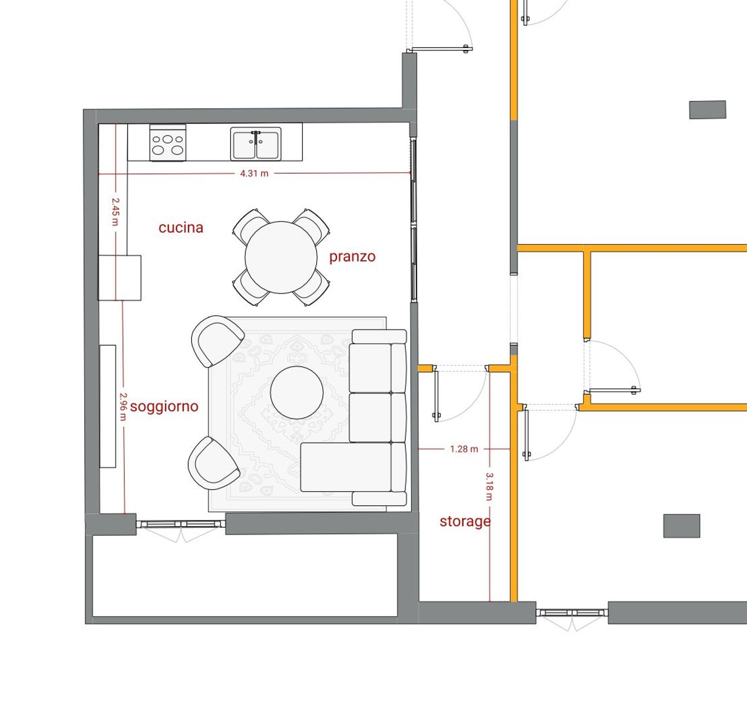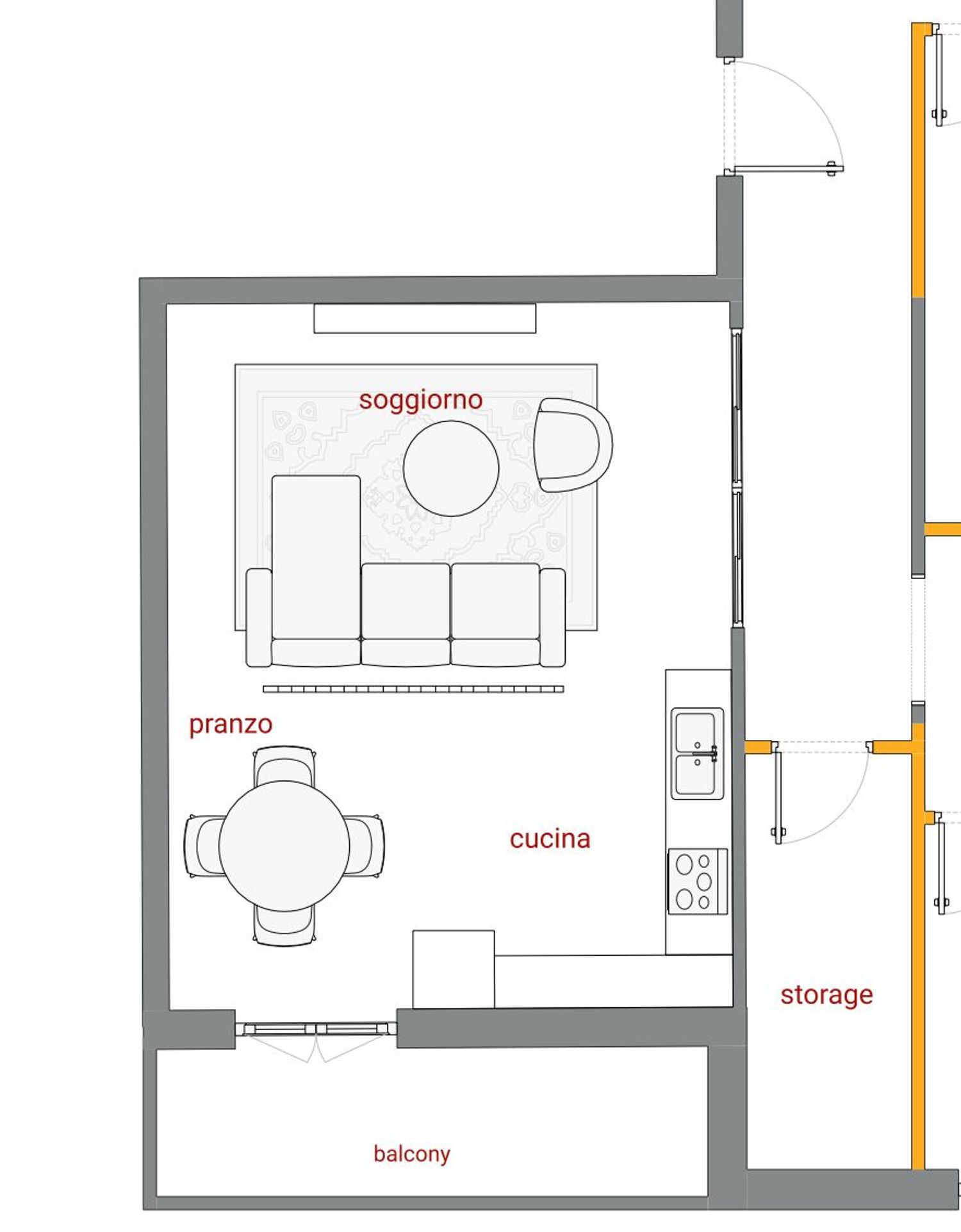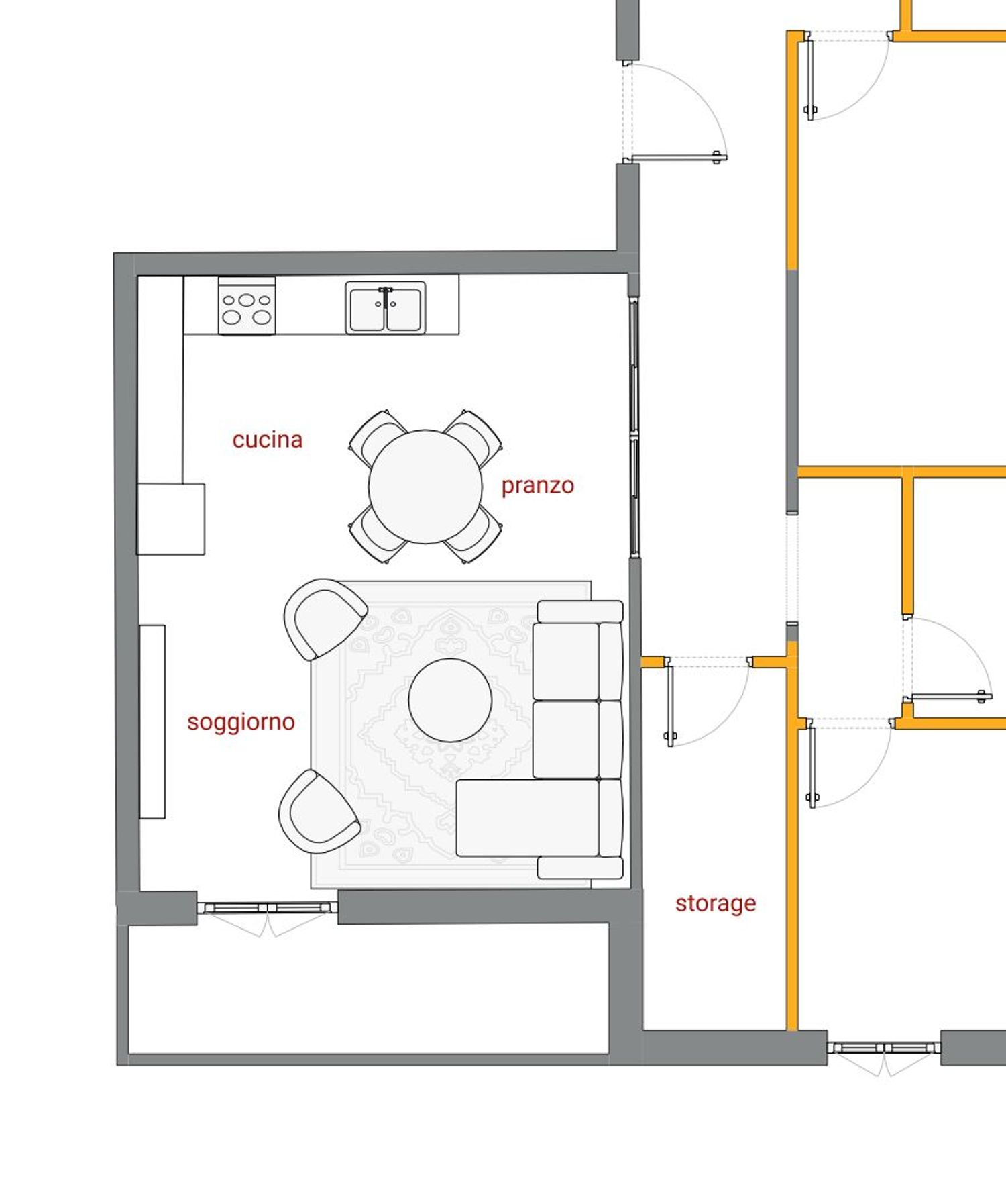Nella seconda soluzione abbiamo modificato la porta d’ingresso, facendola aprire direttamente sulla zona living. La cucina è stata separata con una porta in vetro per renderla semi-aperta, mantenendo continuità visiva ma garantendo funzionalità. La zona pranzo è stata posizionata di fronte alla cucina per maggiore comodità.