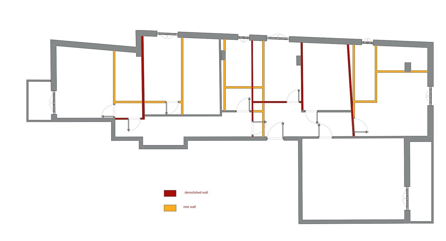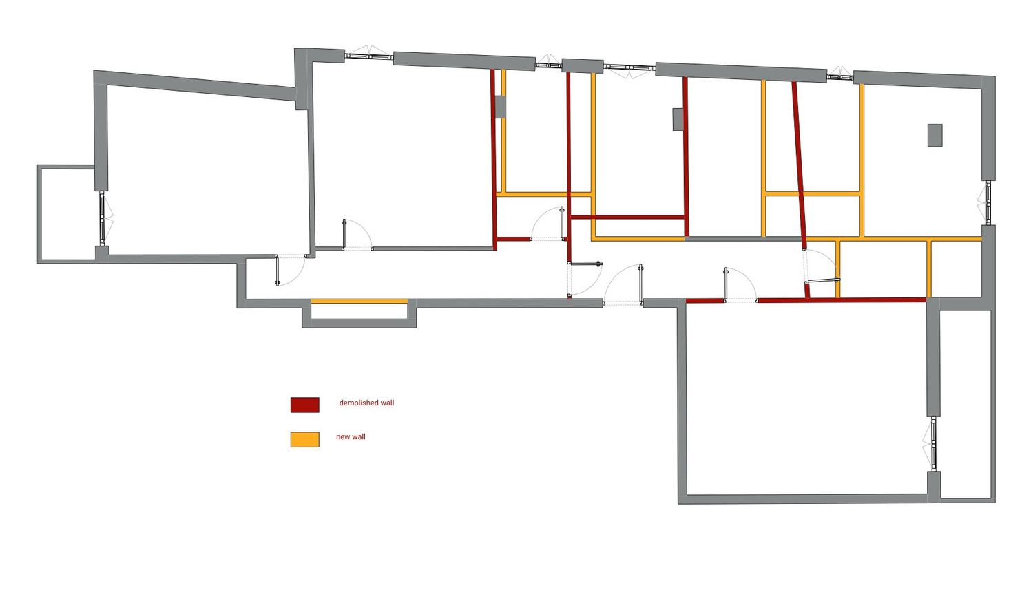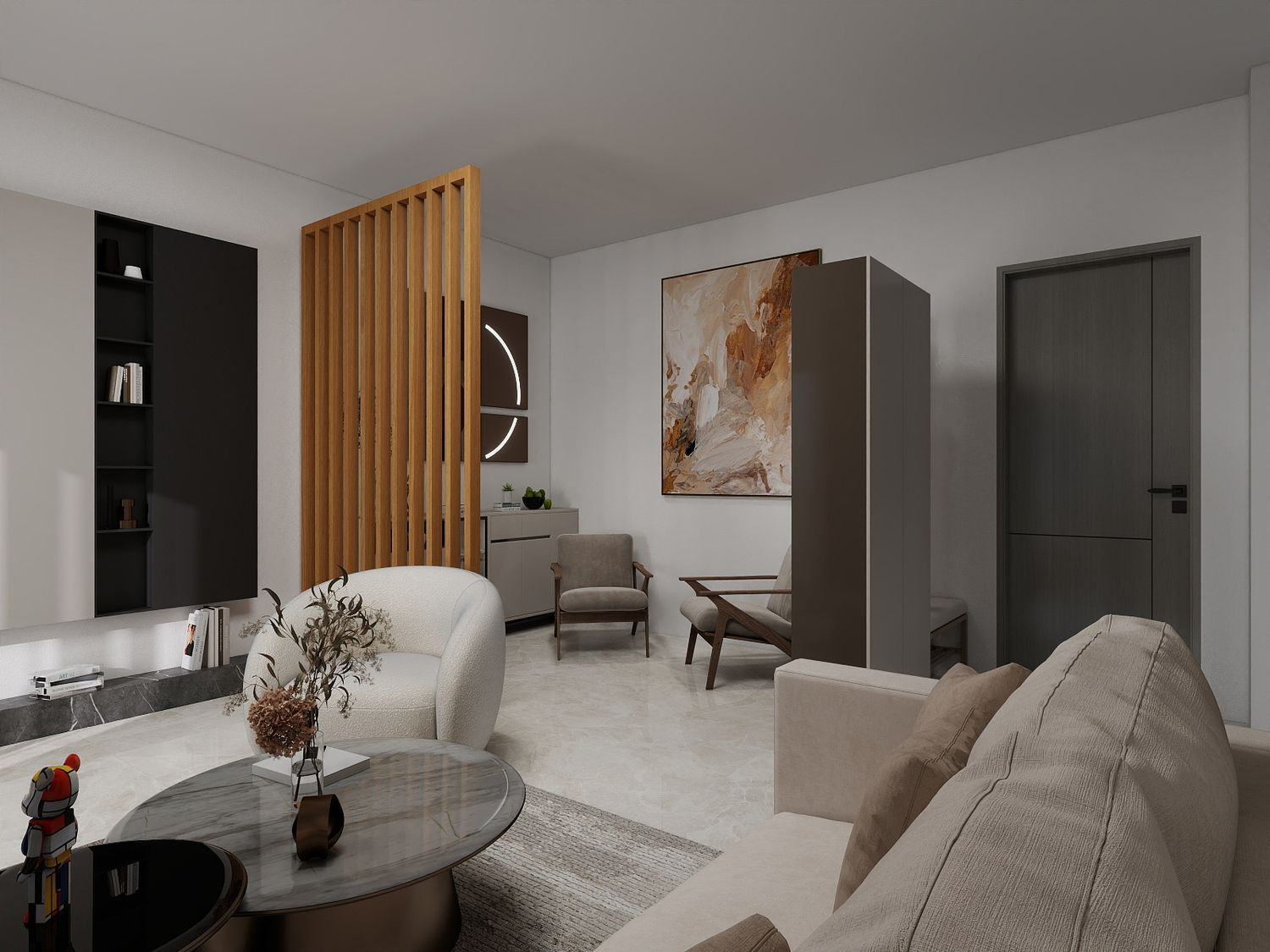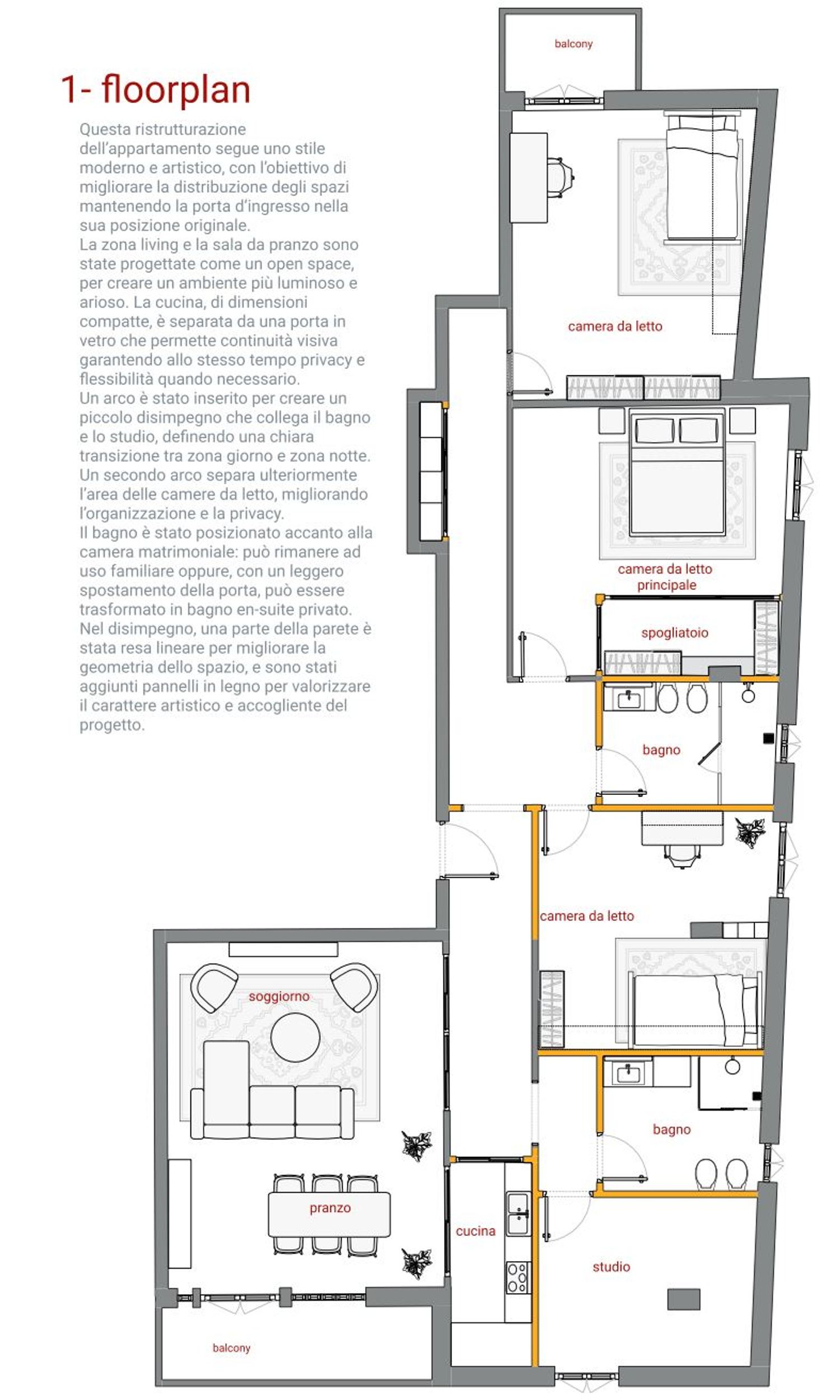 Questa ristrutturazione dell’appartamento segue uno stile moderno e artistico, con l’obiettivo di migliorare la distribuzione degli spazi mantenendo la porta d’ingresso nella sua posizione originale.