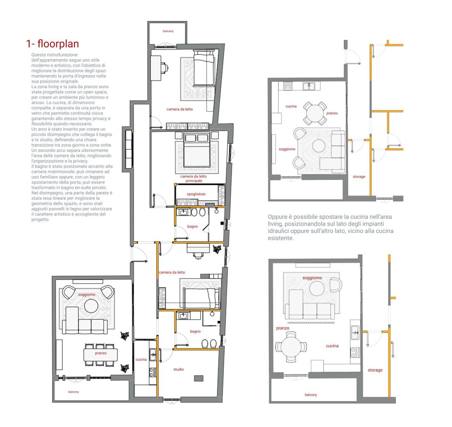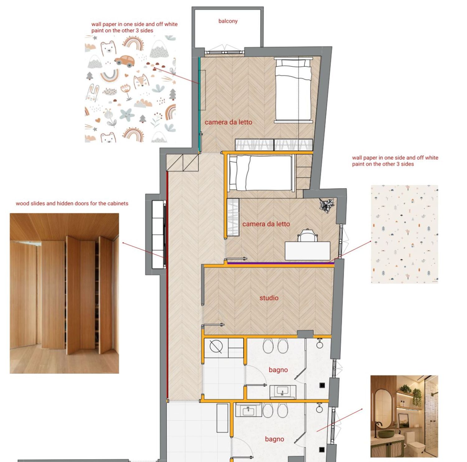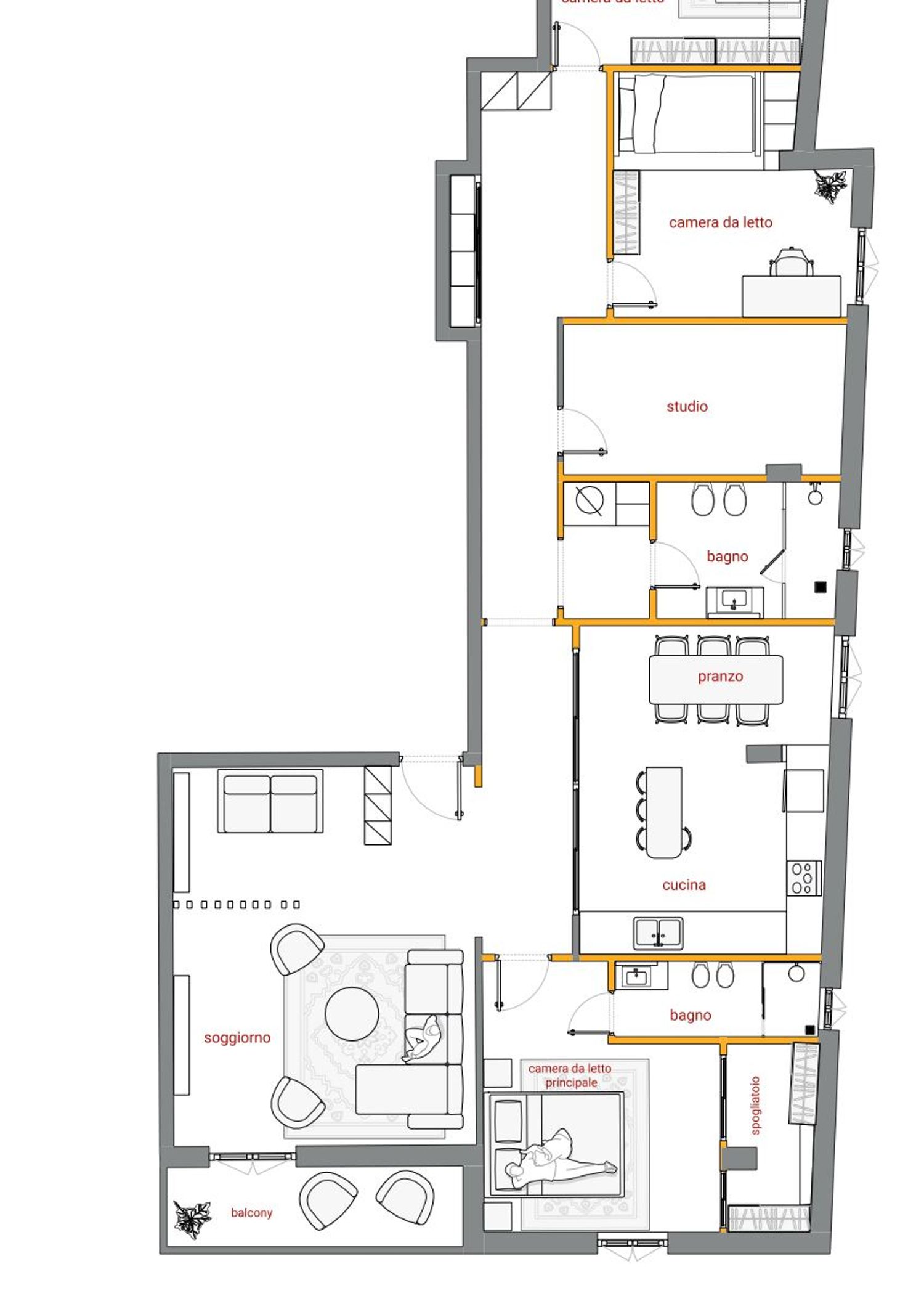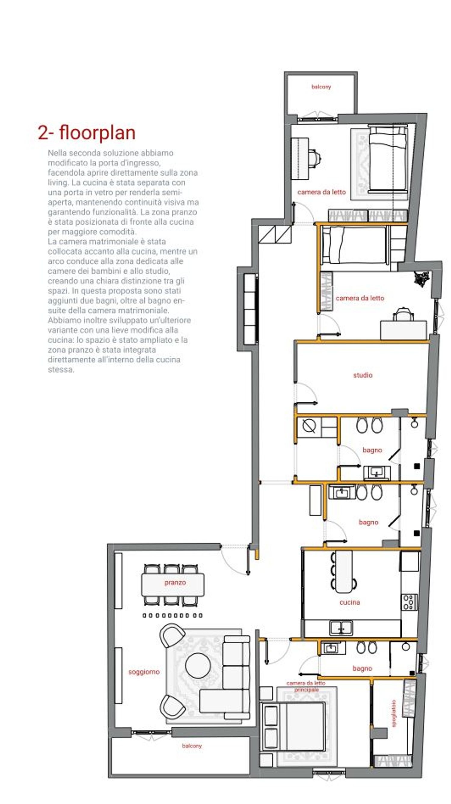 La camera matrimoniale è stata collocata accanto alla cucina, mentre un arco conduce alla zona dedicata alle camere dei bambini e allo studio, creando una chiara distinzione tra gli spazi. In questa proposta sono stati aggiunti due bagni, oltre al bagno en-suite della camera matrimoniale.