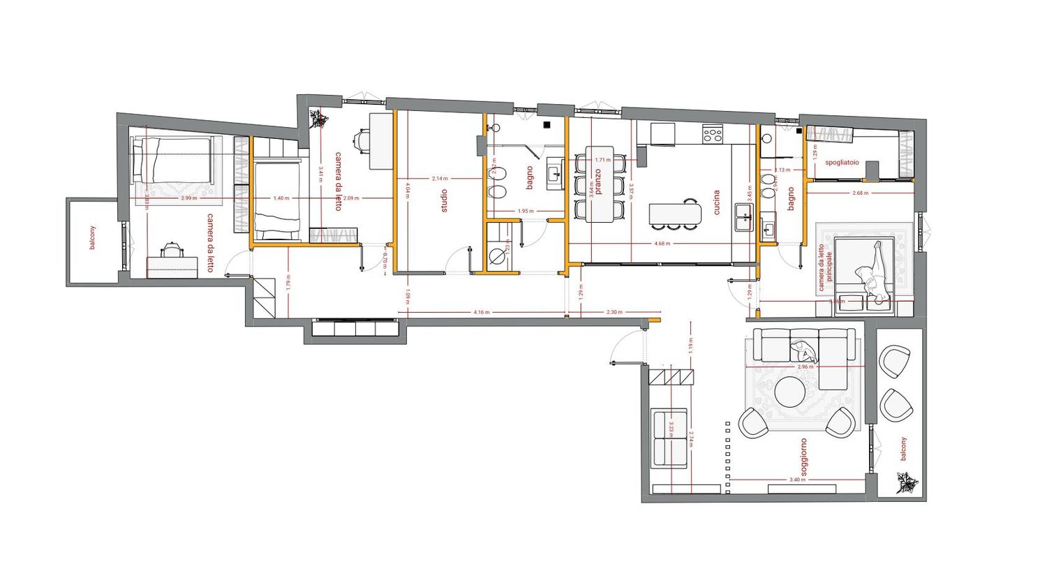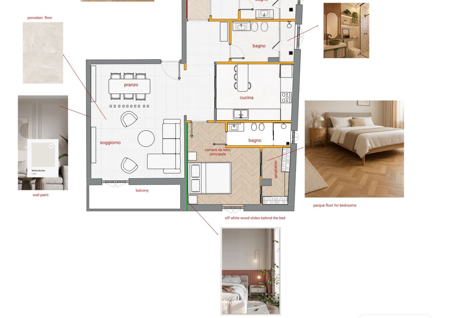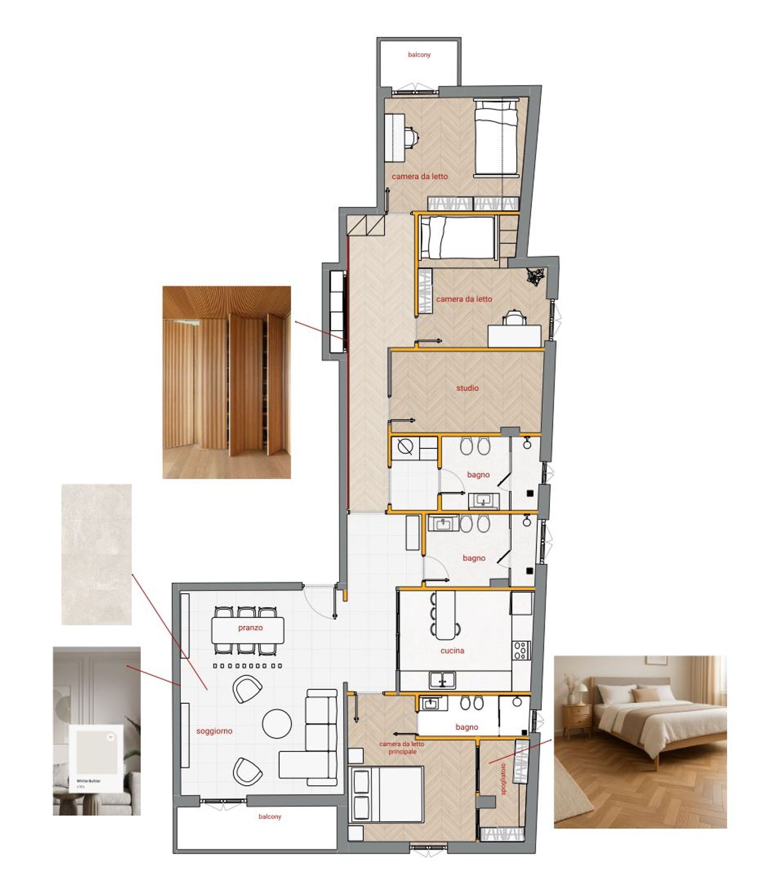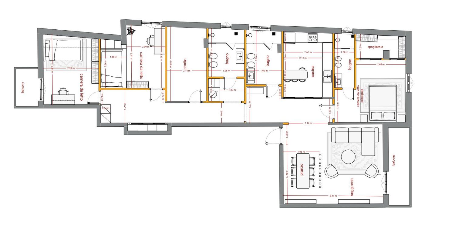 La camera matrimoniale è stata collocata accanto alla cucina, mentre un arco conduce alla zona dedicata alle camere dei bambini e allo studio, creando una chiara distinzione tra gli spazi. In questa proposta sono stati aggiunti due bagni, oltre al bagno en-suite della camera matrimoniale.