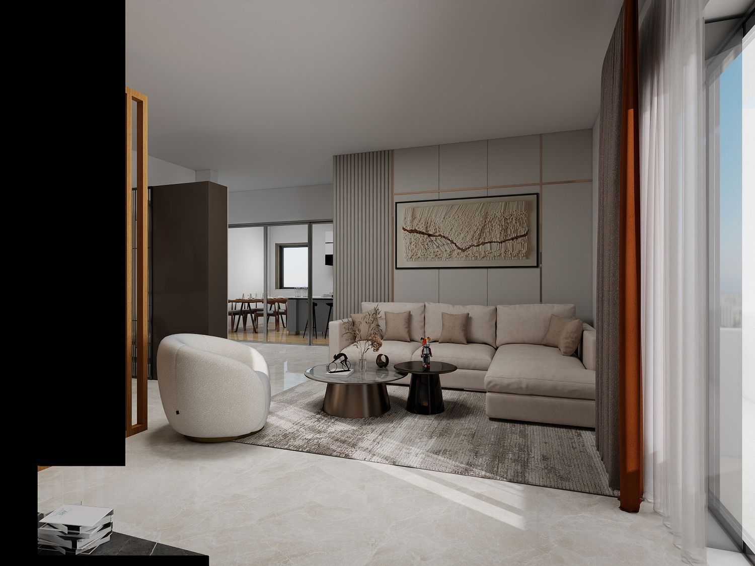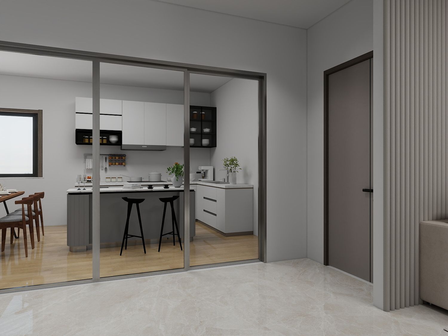 La zona living e la sala da pranzo sono state progettate come un open space, per creare un ambiente più luminoso e arioso. La cucina, di dimensioni compatte, è separata da una porta in vetro che permette continuità visiva garantendo allo stesso tempo privacy e flessibilità quando necessario.