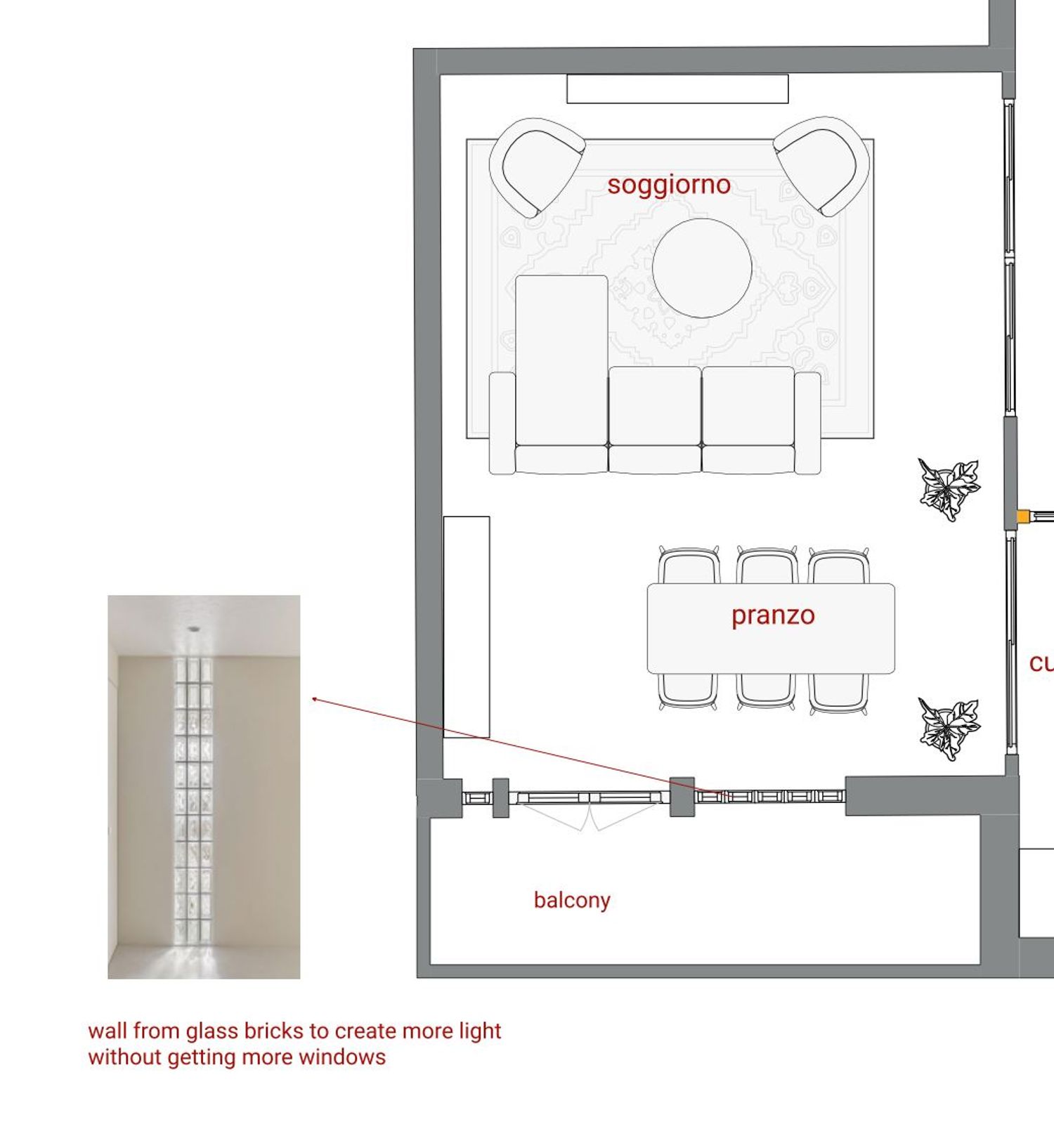 Oppure è possibile spostare la cucina nell’area living, posizionandola sul lato degli impianti idraulici oppure sull’altro lato, vicino alla cucina esistente.