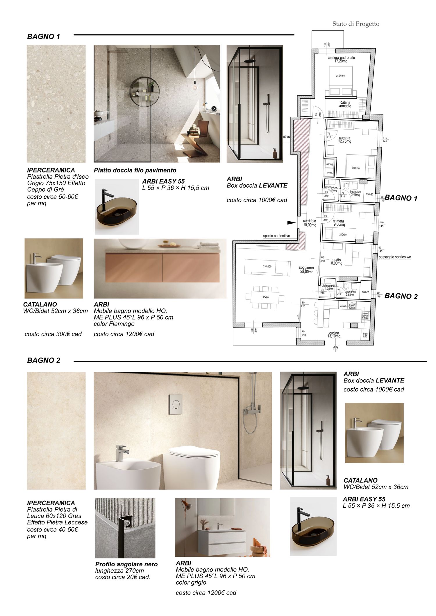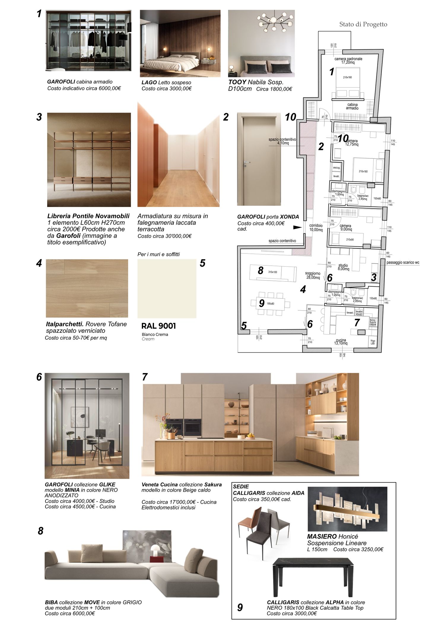 Il divano, è modulare e può essere bifacciale se si spostano i cuscini. lo studio e le camere sono dotati di libreria a giorno autoportante a tutta altezza. I bagni hanno materiali che rimandano alla pietra e all'eleganza.