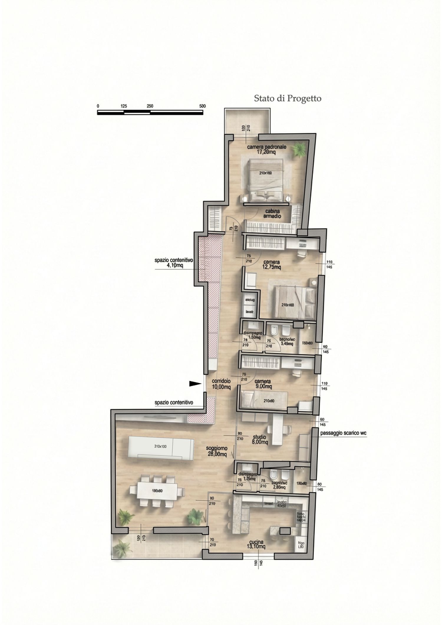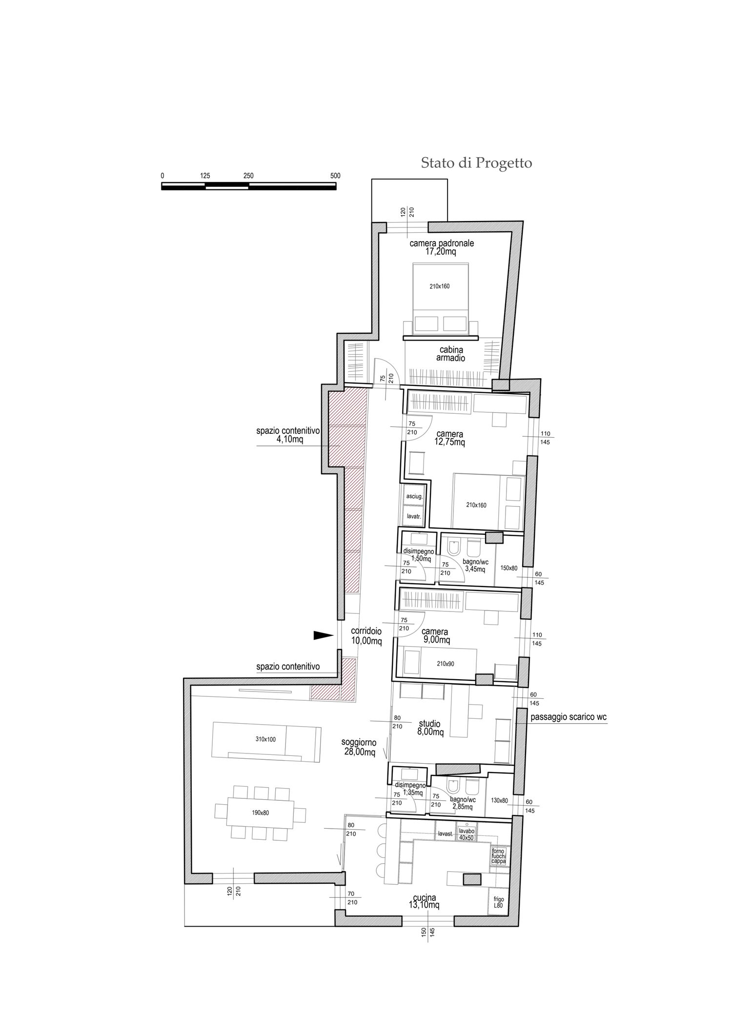 Ho diviso la planimetria tenendomi ortogonale rispetto al lato lungo finestrato. Questo mi ha permesso di ottimizzare gli spazi, realizzando un mobile contenitivo in falegnameria (capiente circa 4mq) che corre lungo tutto il corridoio svoltando anche in soggiorno e diventando il mobile tv. Sempre in corridoio ho inserito un'armadiatura per contenere la lavatrice, che condivide lo scarico con il bagno.