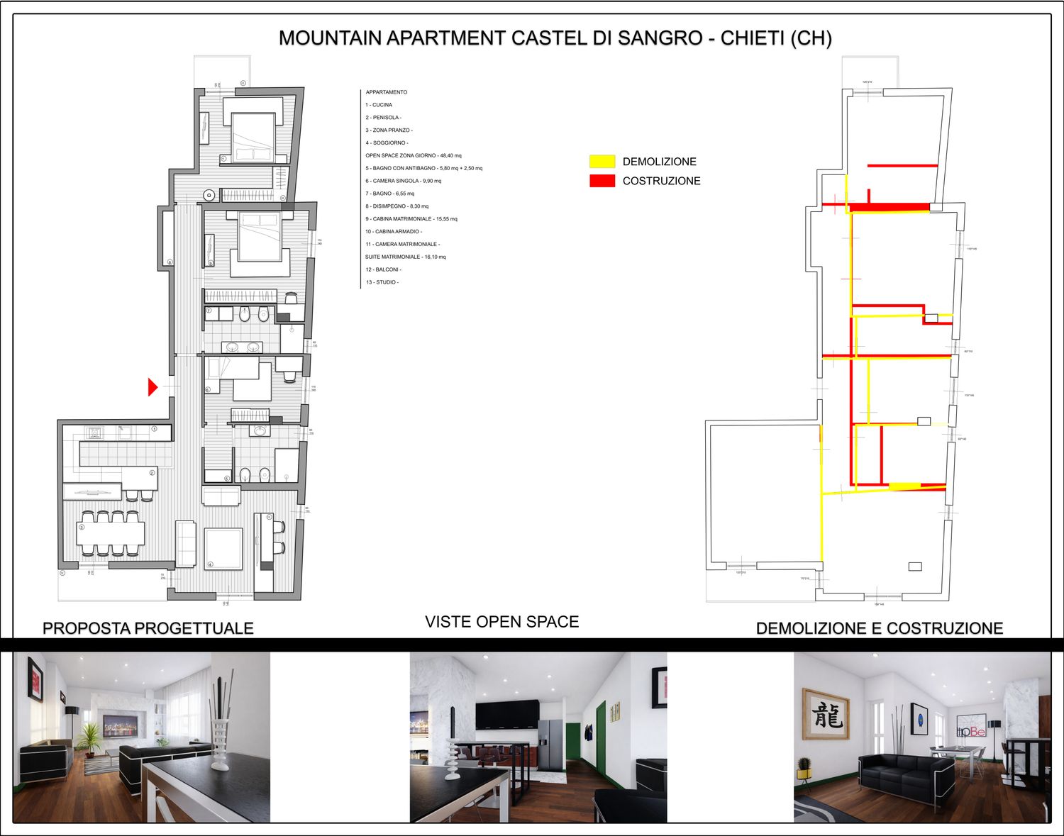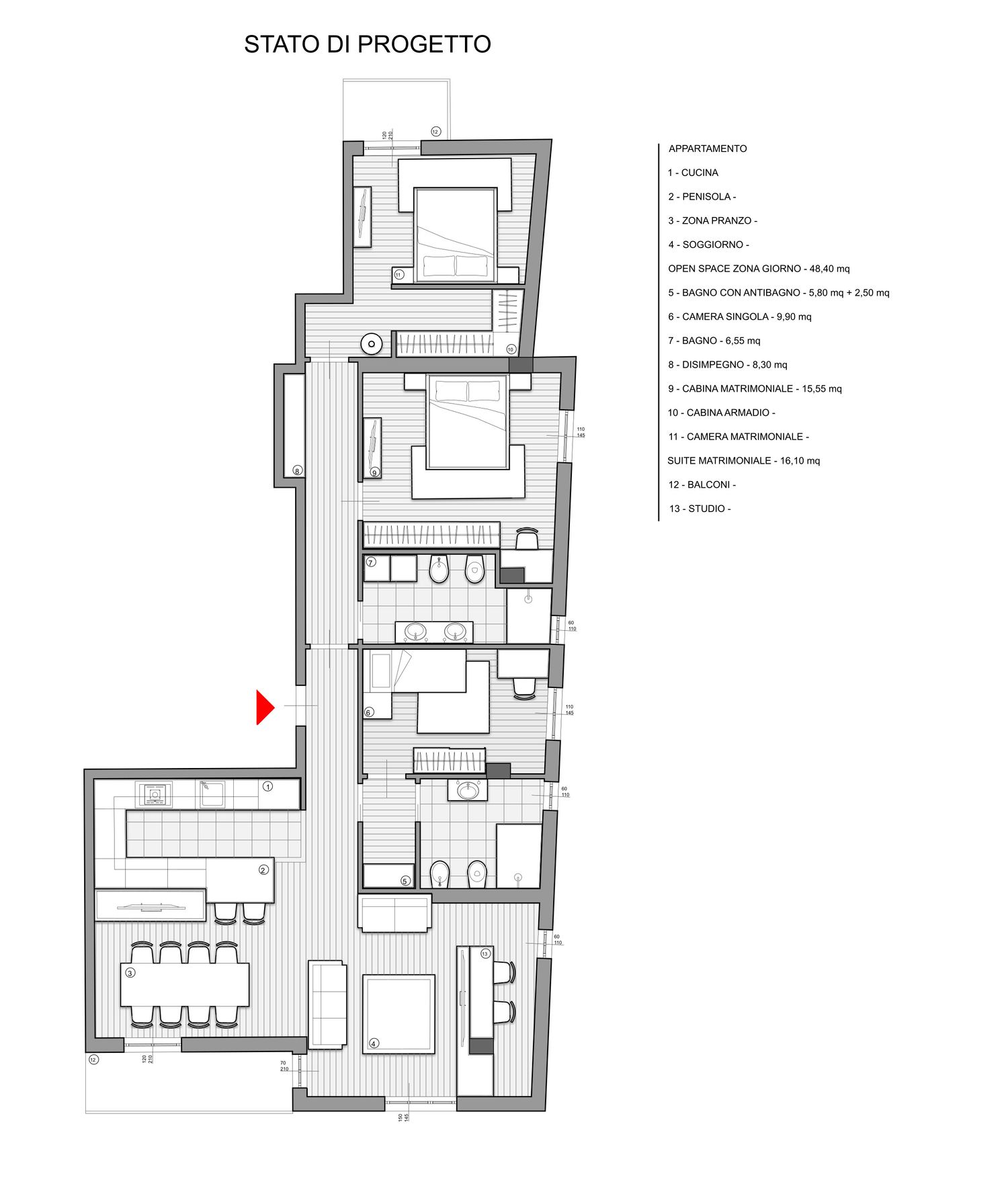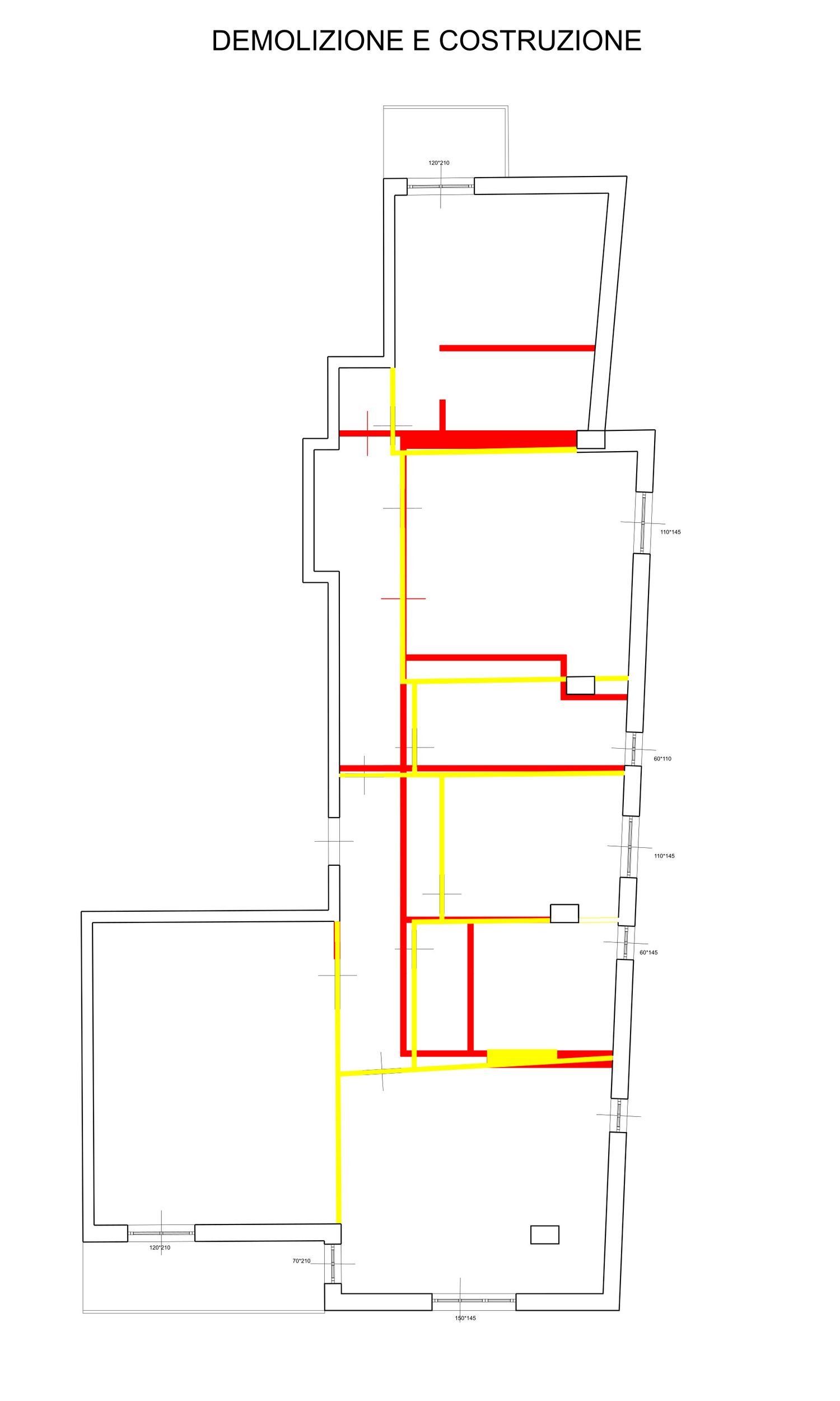 Partendo da una demolizione della tramezzatura, della pavimentazione e massetto esistenti, e considerato la disposizione degli scarichi è stato ripensato un layout dell’abitazione in modo regolare e semplice.