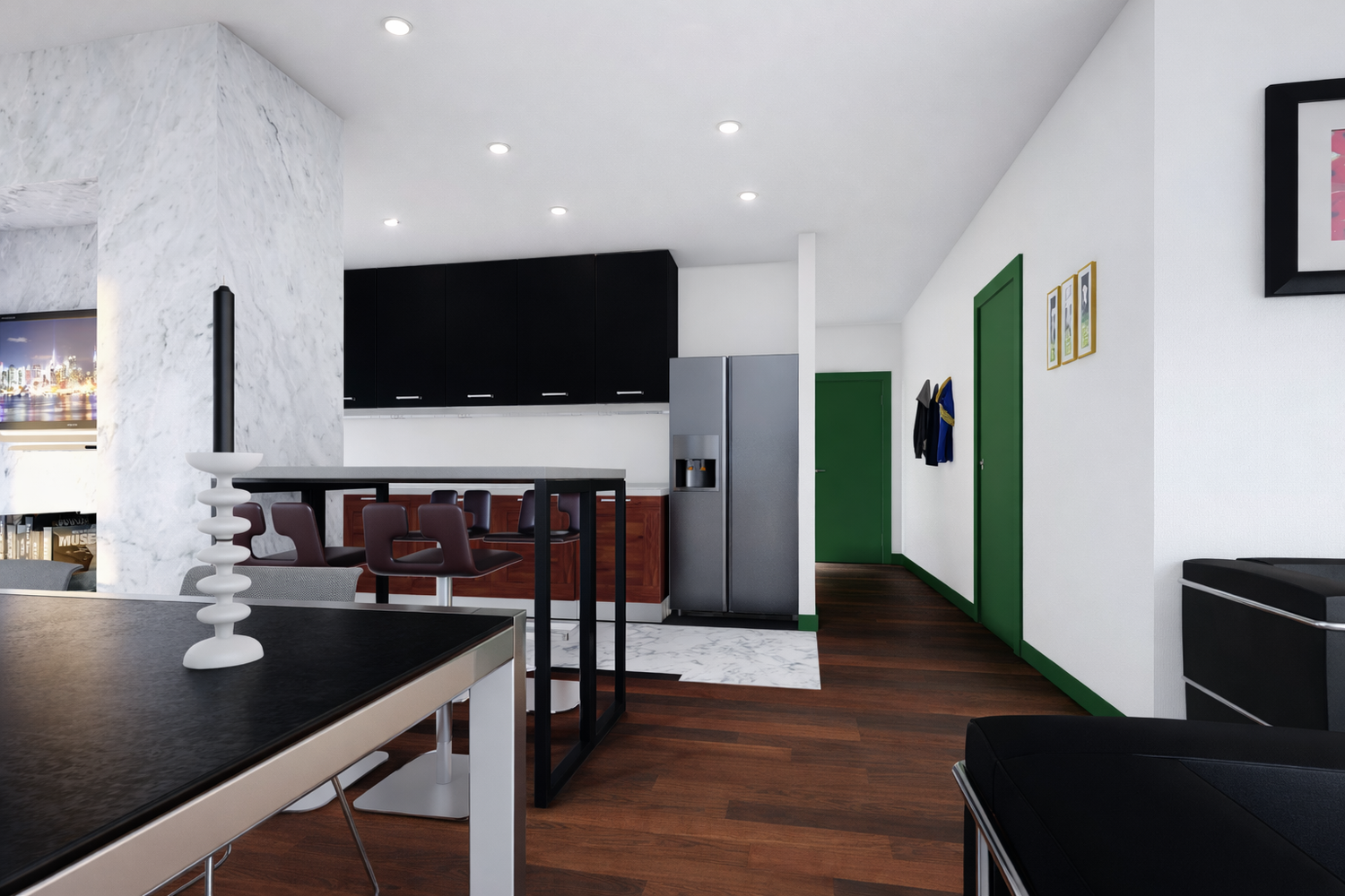 Dalla porta d’ingresso, un piccolo disimpegno in cui si accede direttamente nella grande zona giorno open space, in cui sono state ricavate, la cucina, la zona pranzo, la zona giorno ed una piccola zona ufficio per eventuale smart working. Gli elementi caratterizzanti di questo open space, sono le due pareti attrezzate rivestite in pietra che dividono, la cucina e la zona pranzo e la zona giorno con il piccolo ufficio.