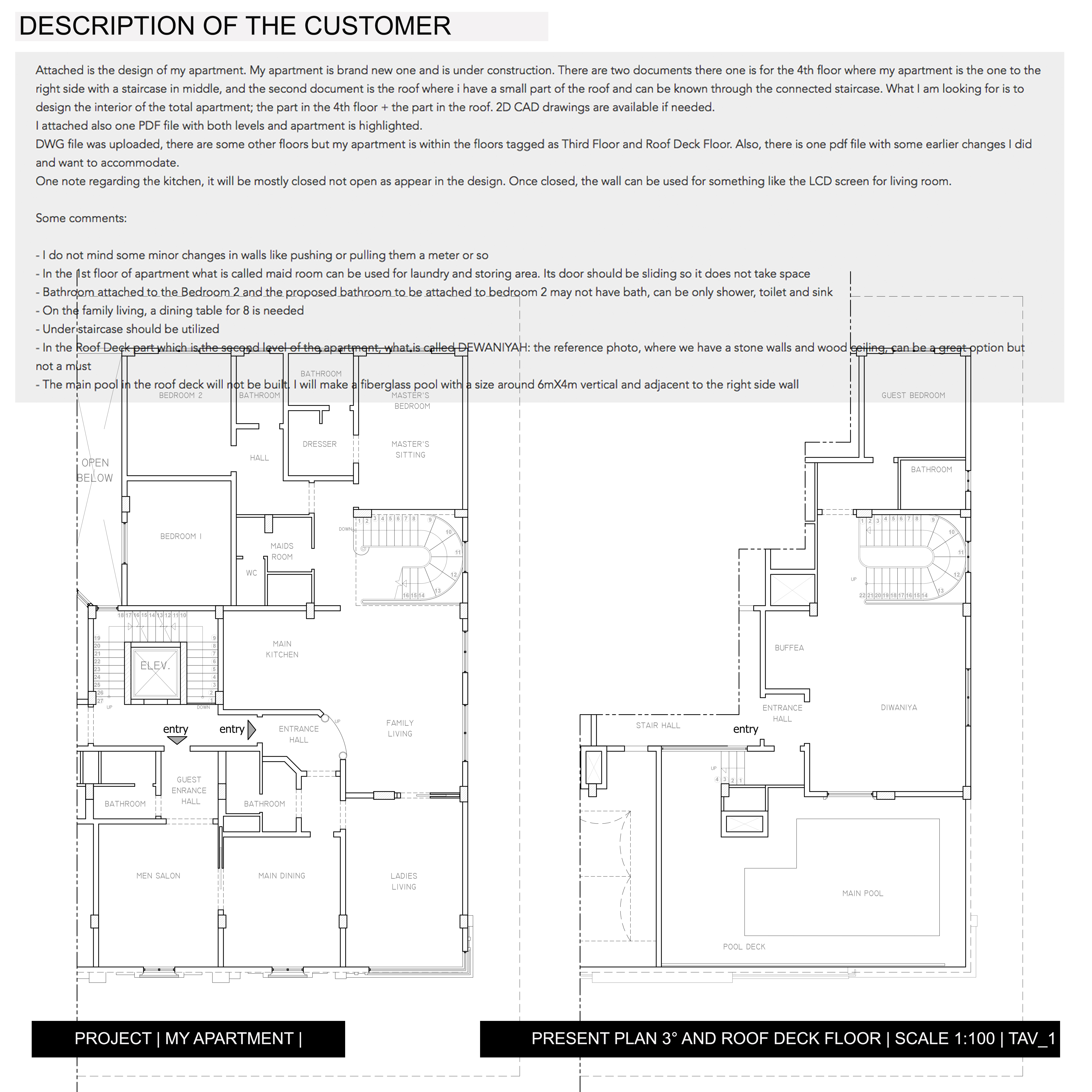 Attached is the design of my apartment. My apartment is brand new one and is under construction. There are two documents there one is for the 4th floor where my apartment is the one to the right side with a staircase in middle, and the second document is the roof where i have a small part of the roof and can be known through the connected staircase. What I am looking for is to design the interior of the total apartment; the part in the 4th floor + the part in the roof. 2D CAD drawings are available if needed.