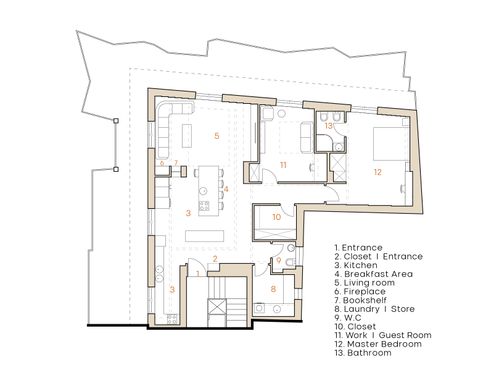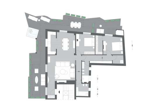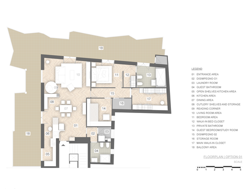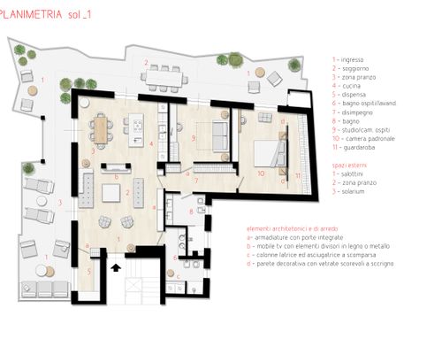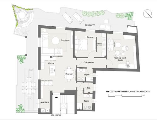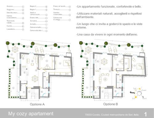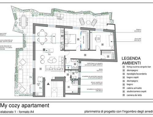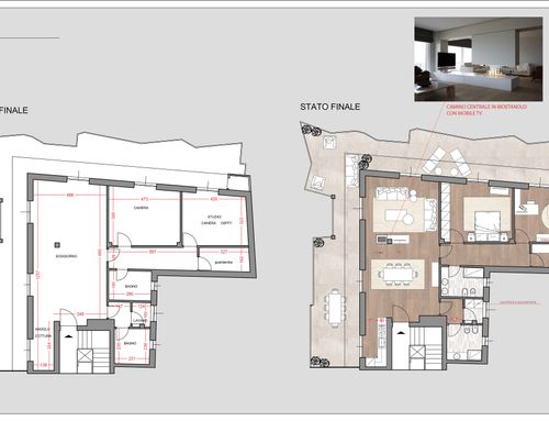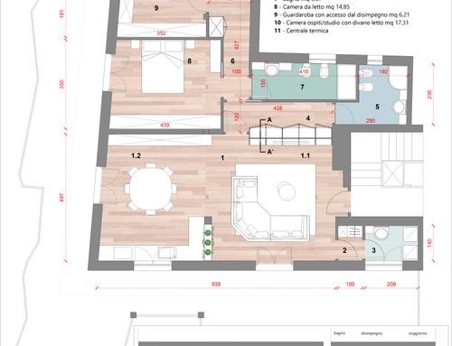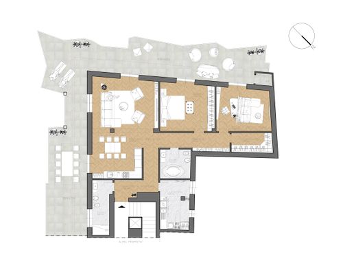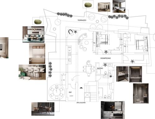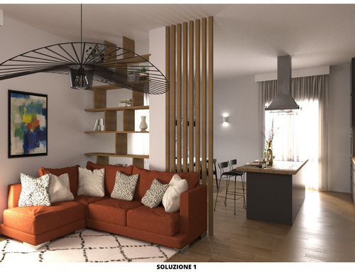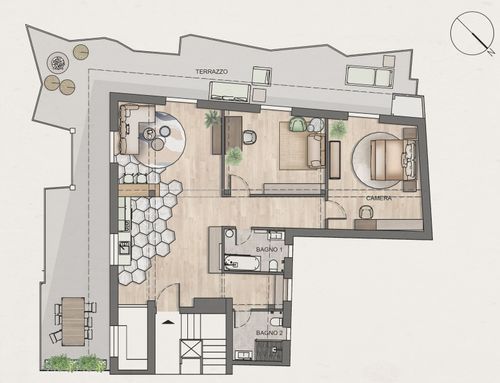 Hi, I have an apartment of about 100sqm it is an attic with a good terrace, my idea is to move the kitchen to the left side of the living room, I would like to have two bathrooms one of which where the current kitchen is Furthermore, there is a dedicated storage/laundry room to consider. As far as the sleeping area is concerned, it currently has two double bedrooms, one of which, in the end, I would like to study/guest rooms. If it were possible to create a wardrobe area in that area. Having a panoramic terrace available, I would like to make it livable even in the summer. I would like an elegant house. Modern with warm colors!
