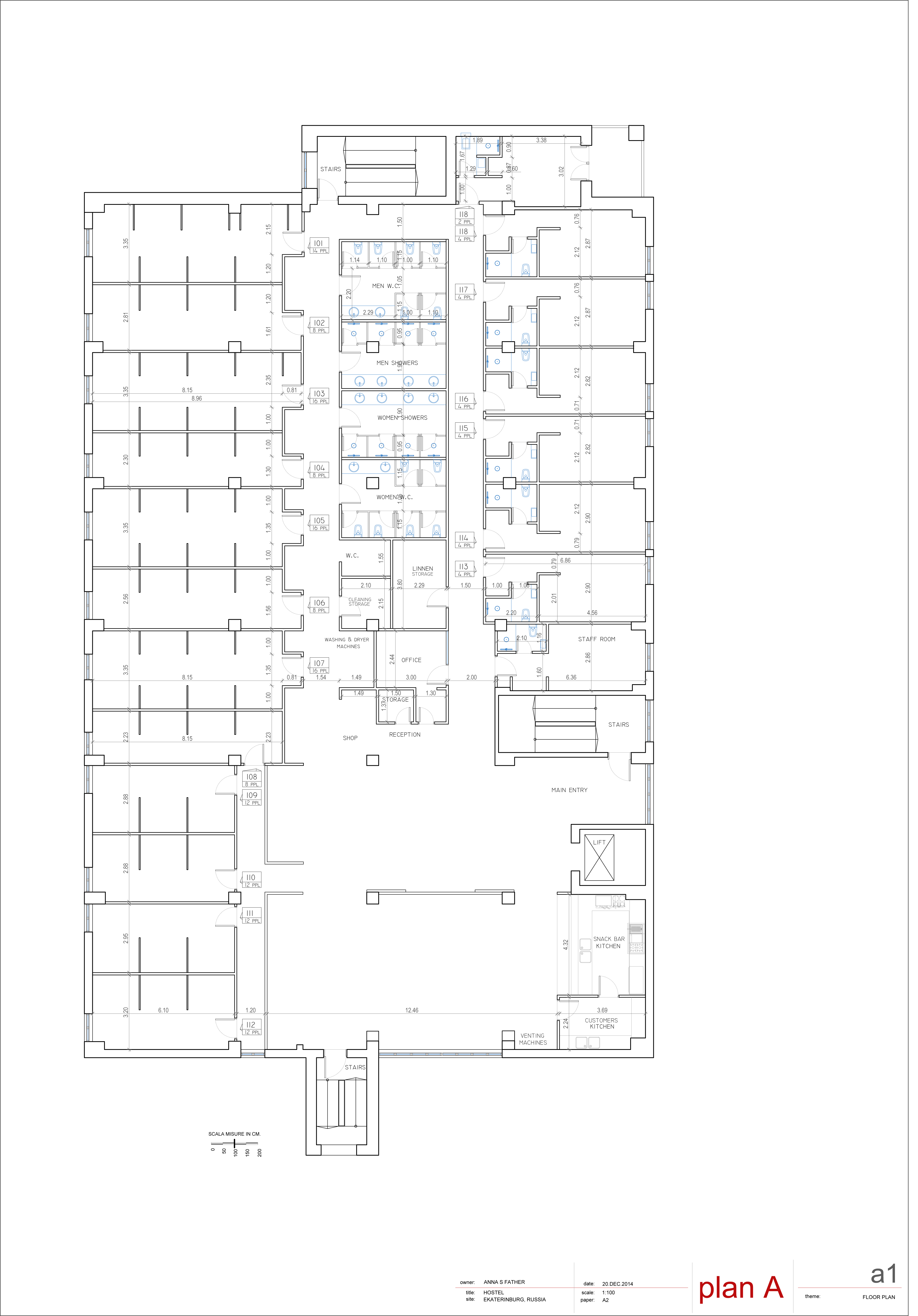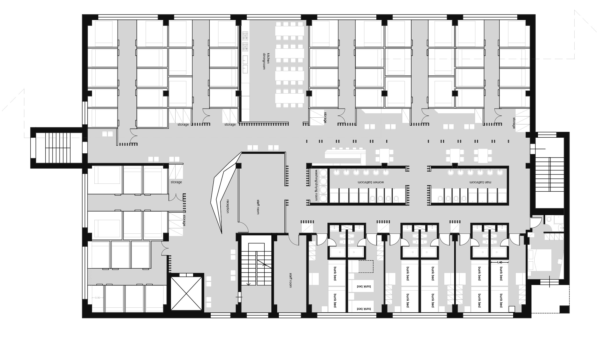 6 rooms in a row(4 people in each, i know it might be difficult we were thinking about one bed 140-160cm, one bunk bed or try to think of smth else) and one room with a balcony, all three room need to have shower cabin and a toilet. all the walls are taking the whole height.