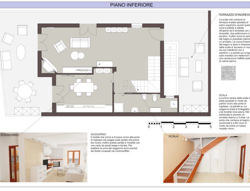 facendola partire dal primo piano in modo da poter accedere dal piano superiore, perché la scala ostacola la realizzazione di una copertura che consente il riparo dalla pioggia. Vorrei realizzare sul terrazzo di ingresso uno spazio da adibire come salotto all’aperto, rivestendo le pareti del con mattoncini.