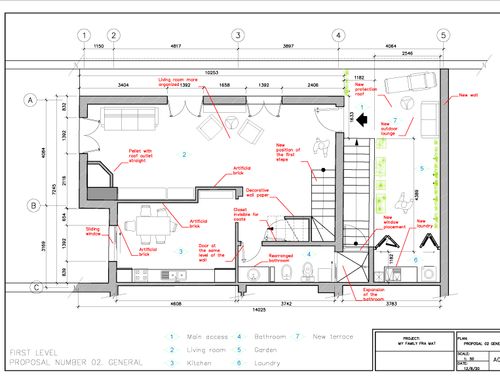 haciendo que comience desde el primer piso para que pueda acceder desde el piso superior, porque la escalera dificulta la creación de una cubierta que permita protegerse de la lluvia. Me gustaría crear en la terraza de entrada un espacio para ser utilizado como un salón al aire libre, cubriendo las paredes del edificio con ladrillos.