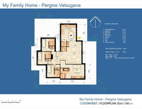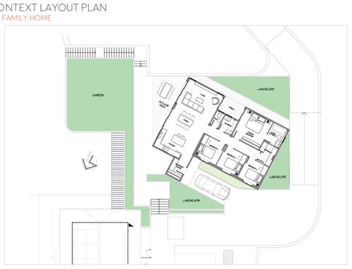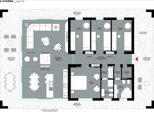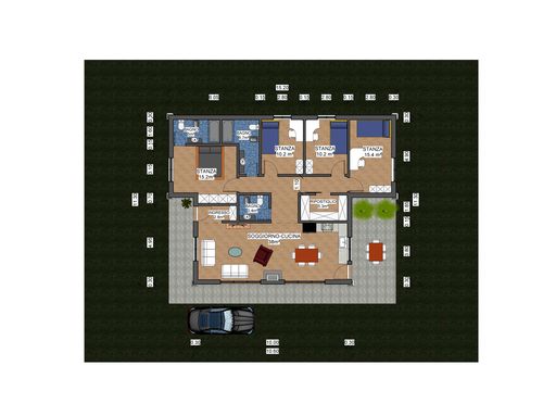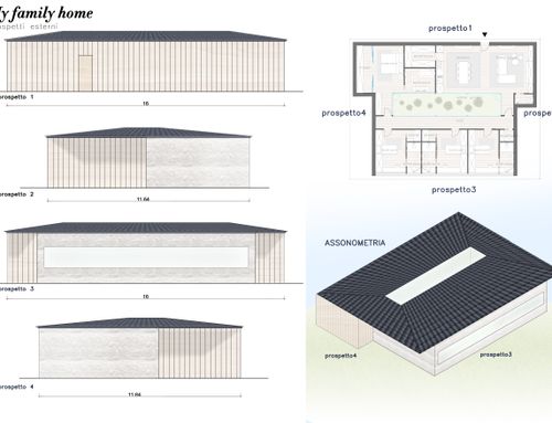The house should have a maximum surface area of 150 gross sqm, max 400 cubic meters, all on one floor, distance from buildings 5 m, get 4 bedrooms, 2 bathrooms, in the rooms we would like to avoid the wardrobes, which we will place in one of the rooms. kitchen, dining room and living room. We'd like as much glass as possible, especially in the living room. Outside the kitchen there is a garden with a table for the summer. Possibly covered.In the attached planimetry there is the position and the outline of the house, it is not necessary to use the same plant, but to respect the square footage. It is necessary to keep 5 m away from other buildings.