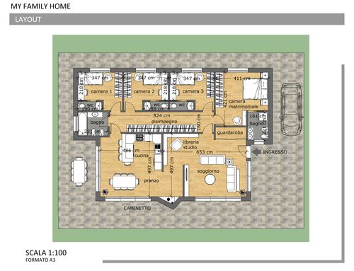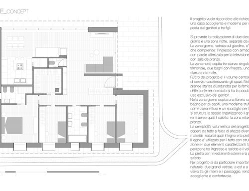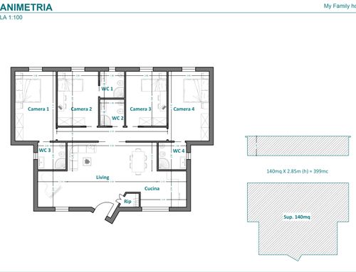 La casa dovrebbe avere una superficie massima di 150 mq lordi, max 400 mc, tutta su di un piano, distanza dagli edifici raggio 5 m, ricavare 4 camere da letto, 2 bagni, nelle stanze vorremmo evitare gli armadi, che sistemeremo in una delle stanze. cucina, sala pranzo e soggiorno. Ci piacerebbero più vetri possibili, soprattutto nel salotto. Fuori dalla cucina un giardino con tavolo per l'estate . Possibilmente coperto. Nella planimetria allegata si trova la posizione e la sagoma della casa, non è necessario usare la stessa pianta, ma rispettare la metratura. E' necessario tenere 5 m di distanza daglia altri edifici.