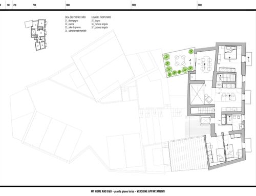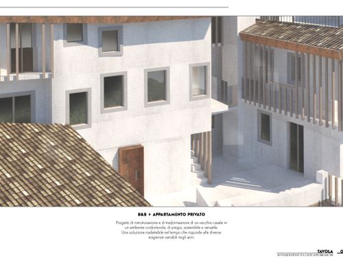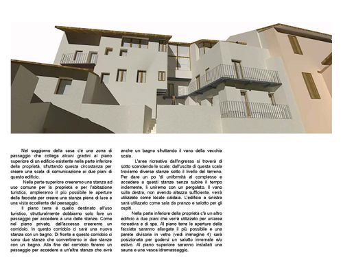 Me gustaría construir un apartamento en el piso superior donde vivir, en los pisos inferiores hay 3 alojamientos con n.03 habitaciones cada uno y n.02 baños para ser utilizado como un b & b de 12 camas. Estilo moderno que no modifica la forma externa del edificio. En la cabaña me gustaría construir una pequeña sala de desayunos en el primer piso y un spa en la planta baja.